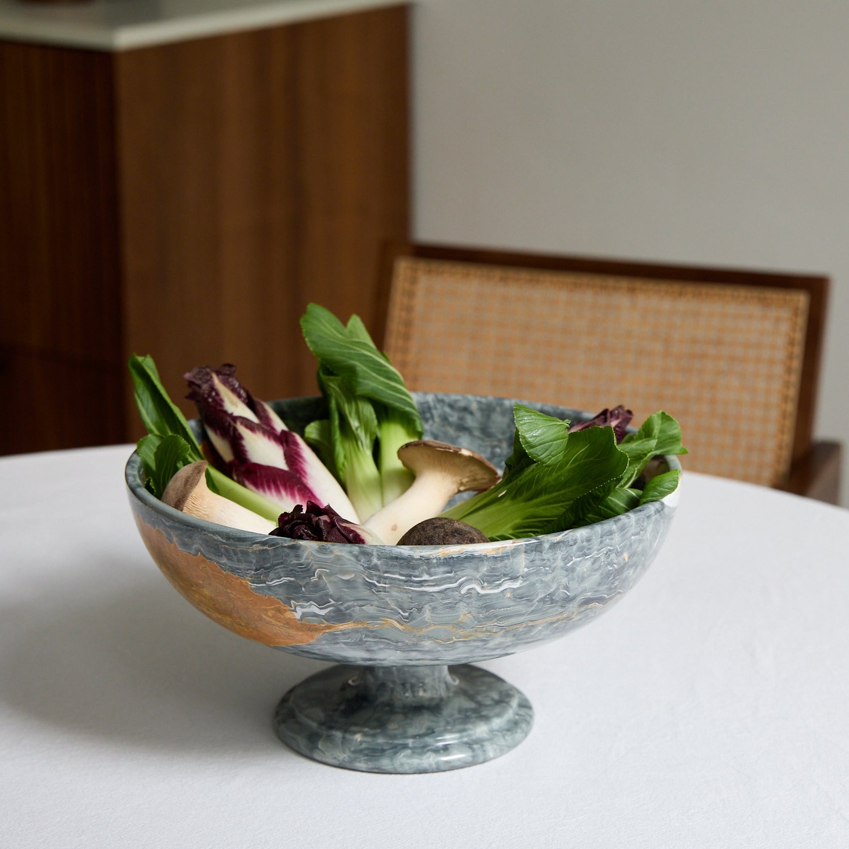 The Cinnara Bowl is a celebration of elemental contrast, where molten fire seems to rest within cool stone. Its surface carries deep gray currents, veined and alive, while a radiant band of golden-orange blazes across its form like a memory of the earth’s inner flame. Elevated on a graceful pedestal, it unites strength with refinement, presence with poise.