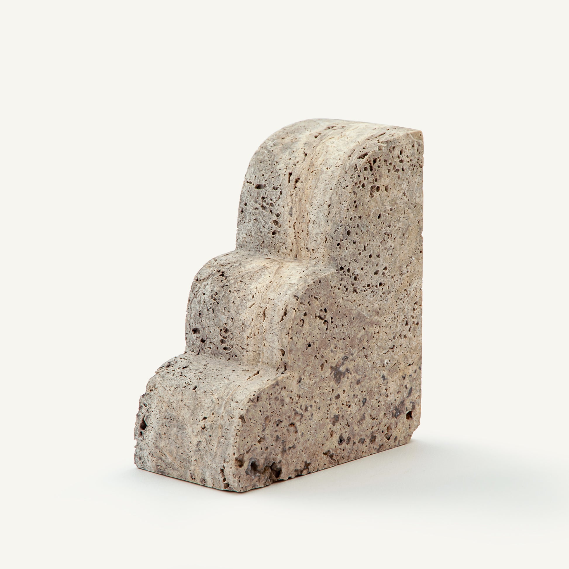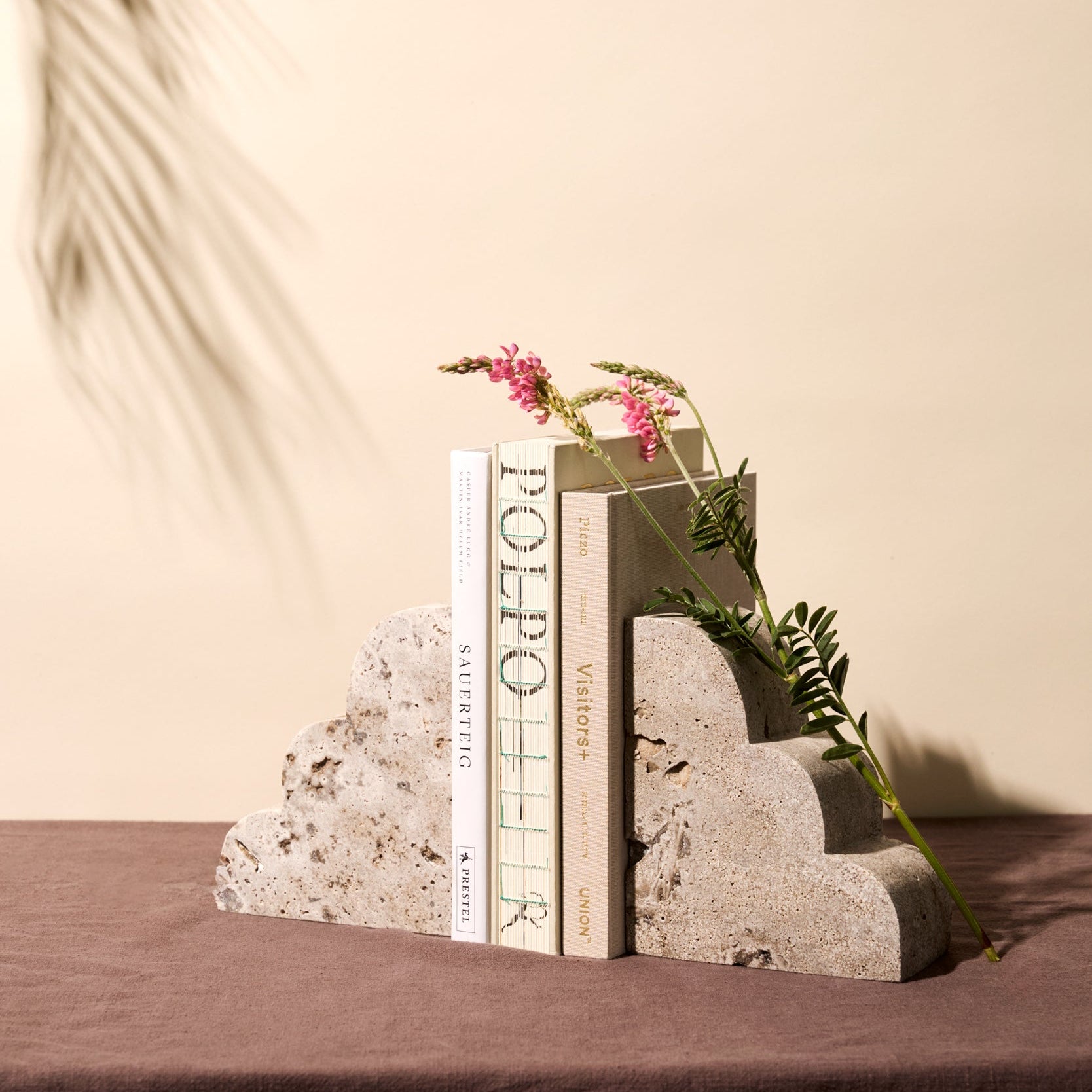 Whether used to frame your favorite books or simply as a decorative accent, the Clouds Bookend Duo in travertine brings a sense of calm materiality and quiet sophistication to your shelf.