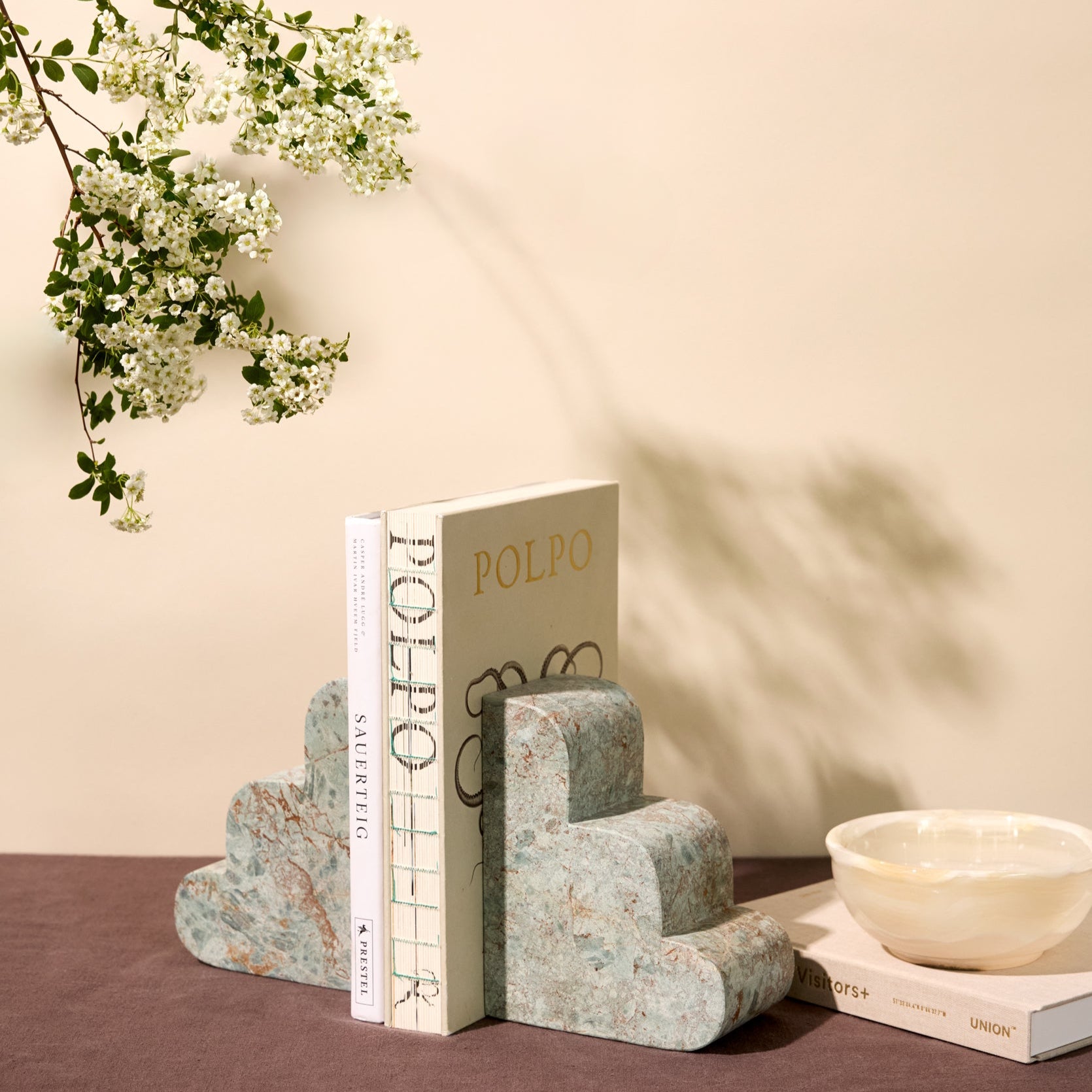 Perfect for styling bookshelves, consoles, or workspaces, the Clouds Bookend Duo in verde marble adds a touch of artistic energy and geological wonder to your space.