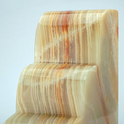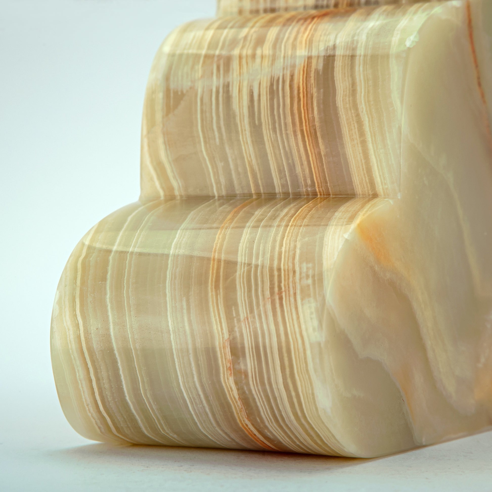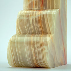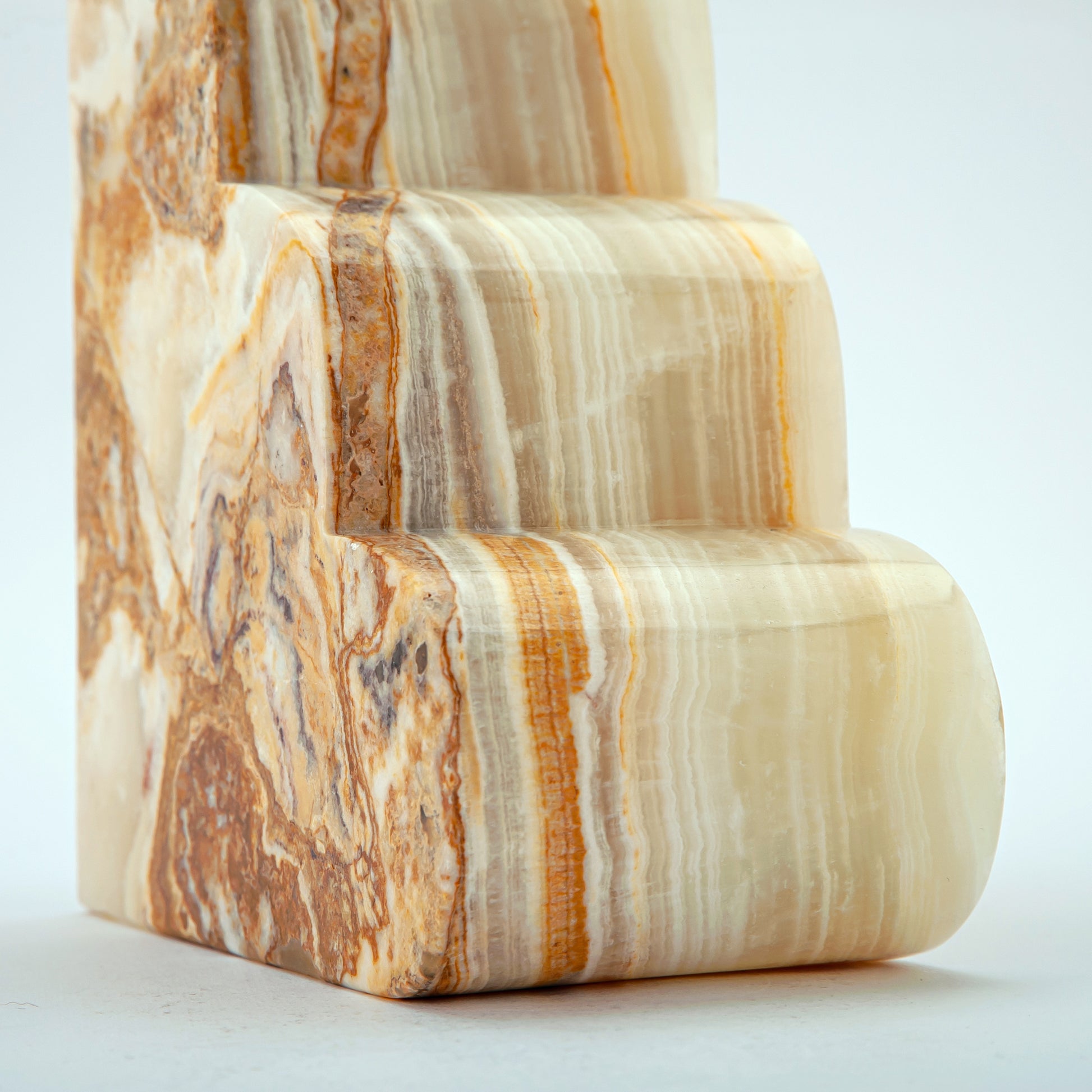 What makes this duo truly exceptional is the onyx itself — a rare stone celebrated for its luminous translucency and captivating natural patterning. Ribbons of honey, amber, and ivory flow organically through each piece, ensuring no two are ever alike. These intricate layers are formed over thousands of years, making each bookend a small geological wonder that brings nature’s quiet drama into your interior.