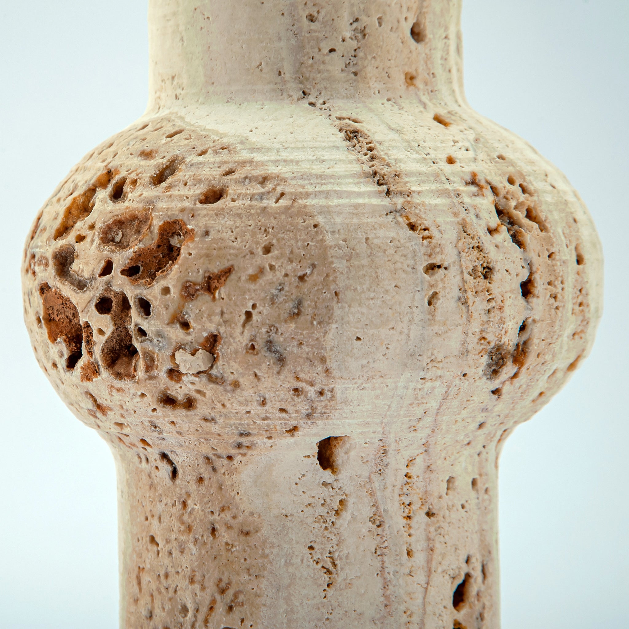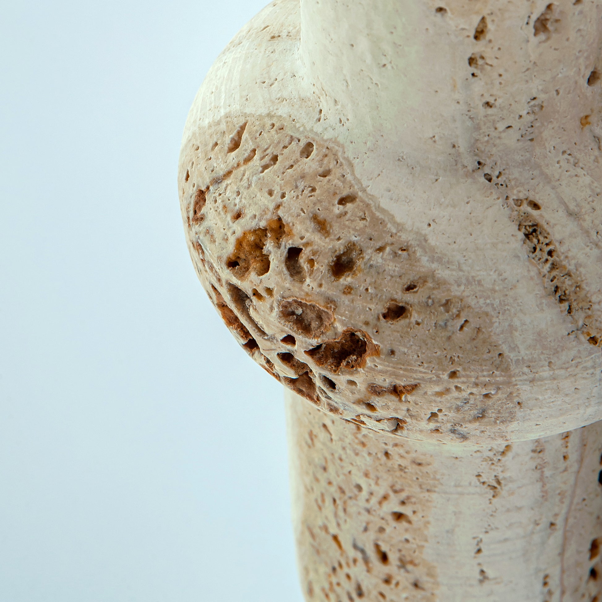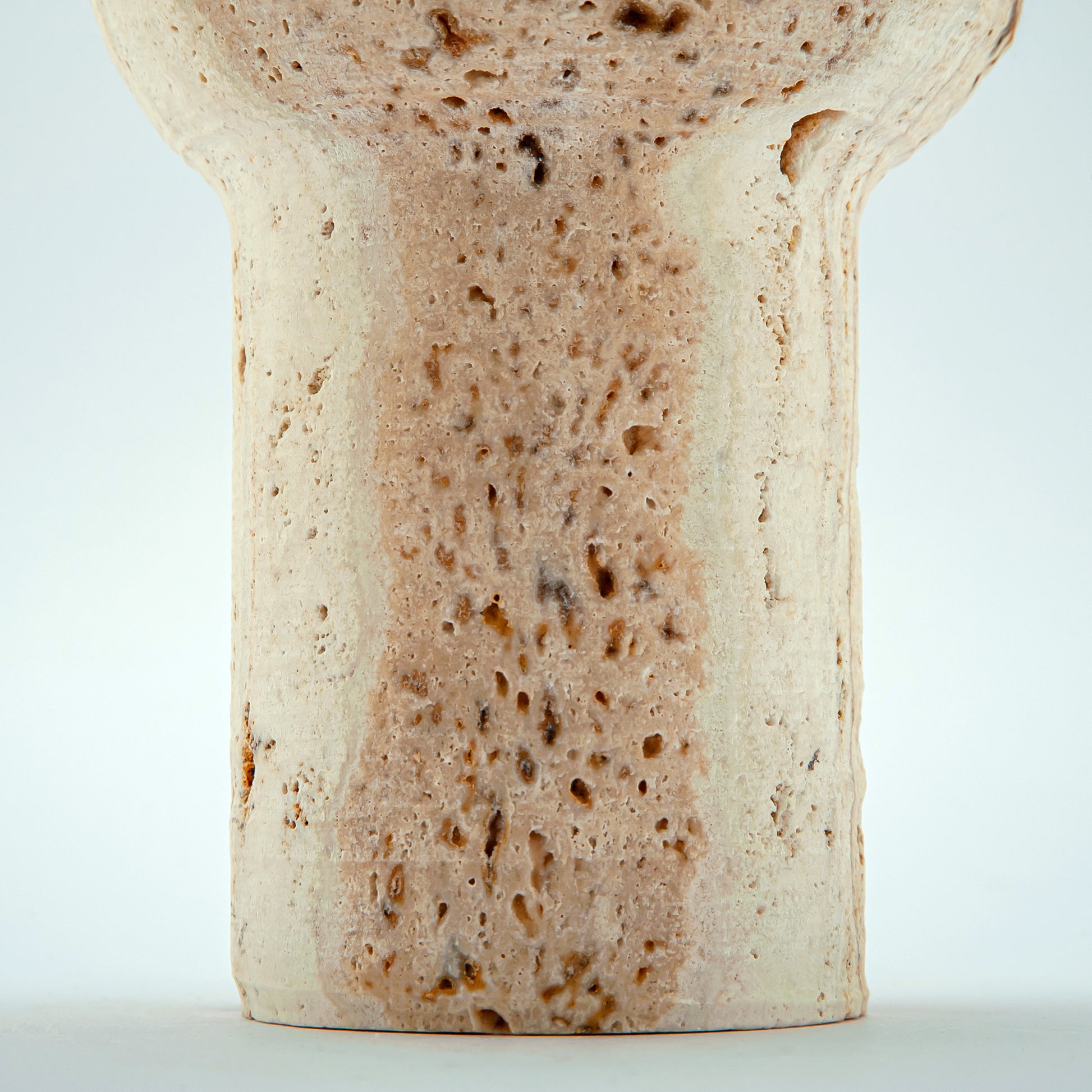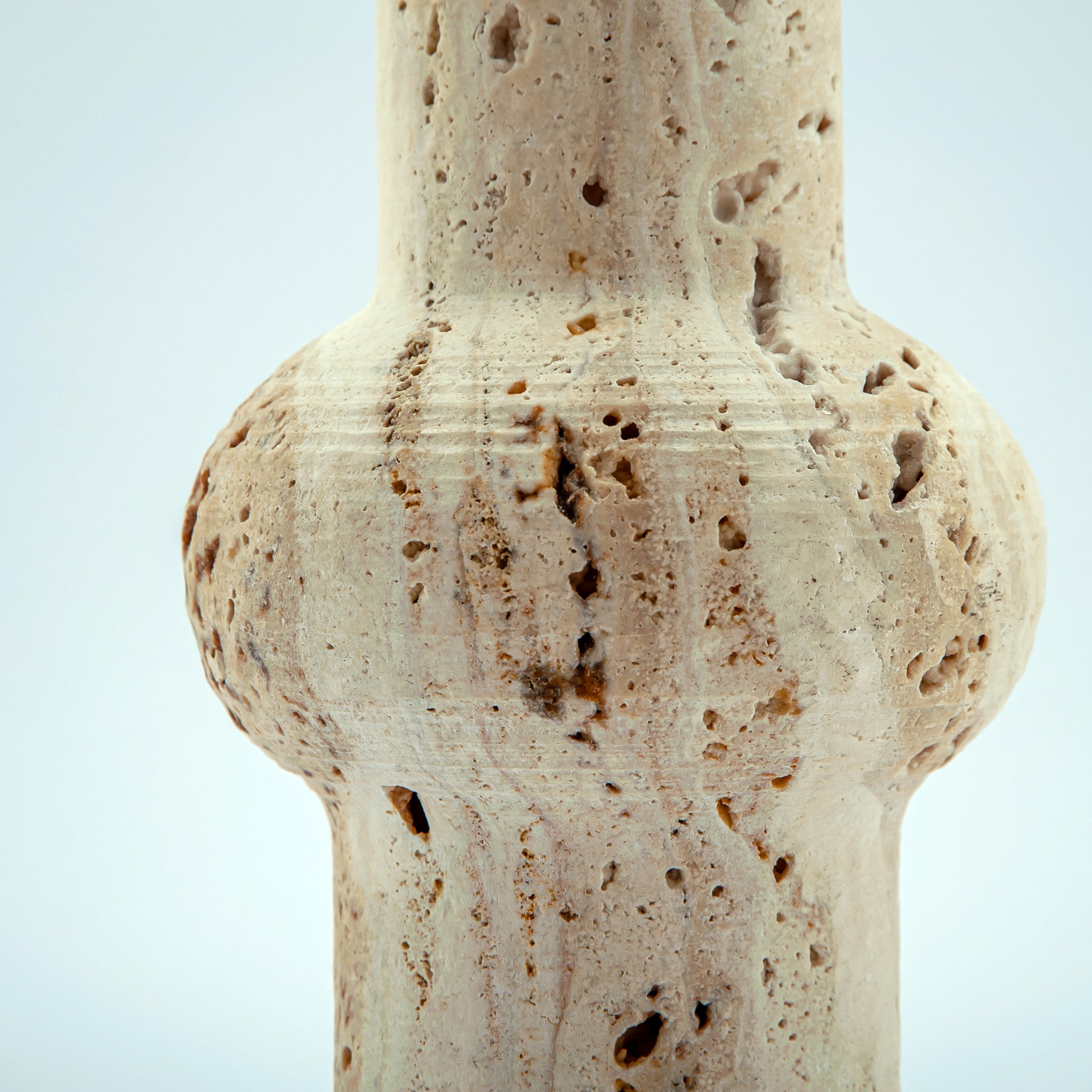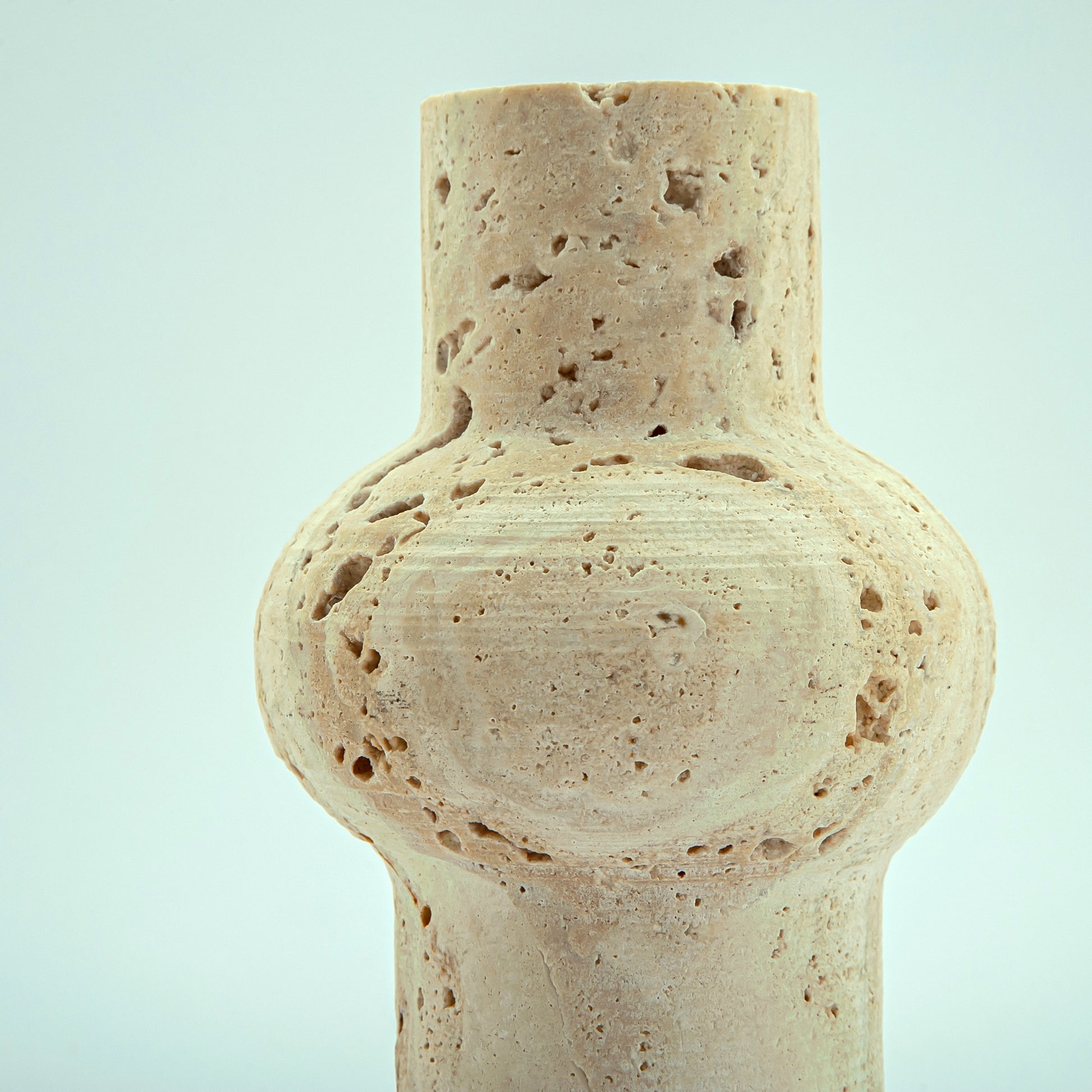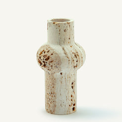 Colonna Vase is a one-of-a-kind piece carved from warm, porous travertine with soft beige tones and natural stone cavities.