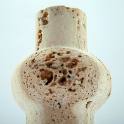 Its vertical, column-like form recalls architectural elements and ancient stone vessels.