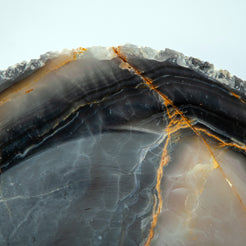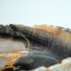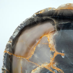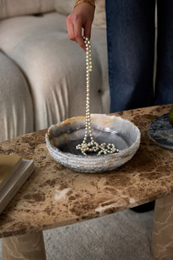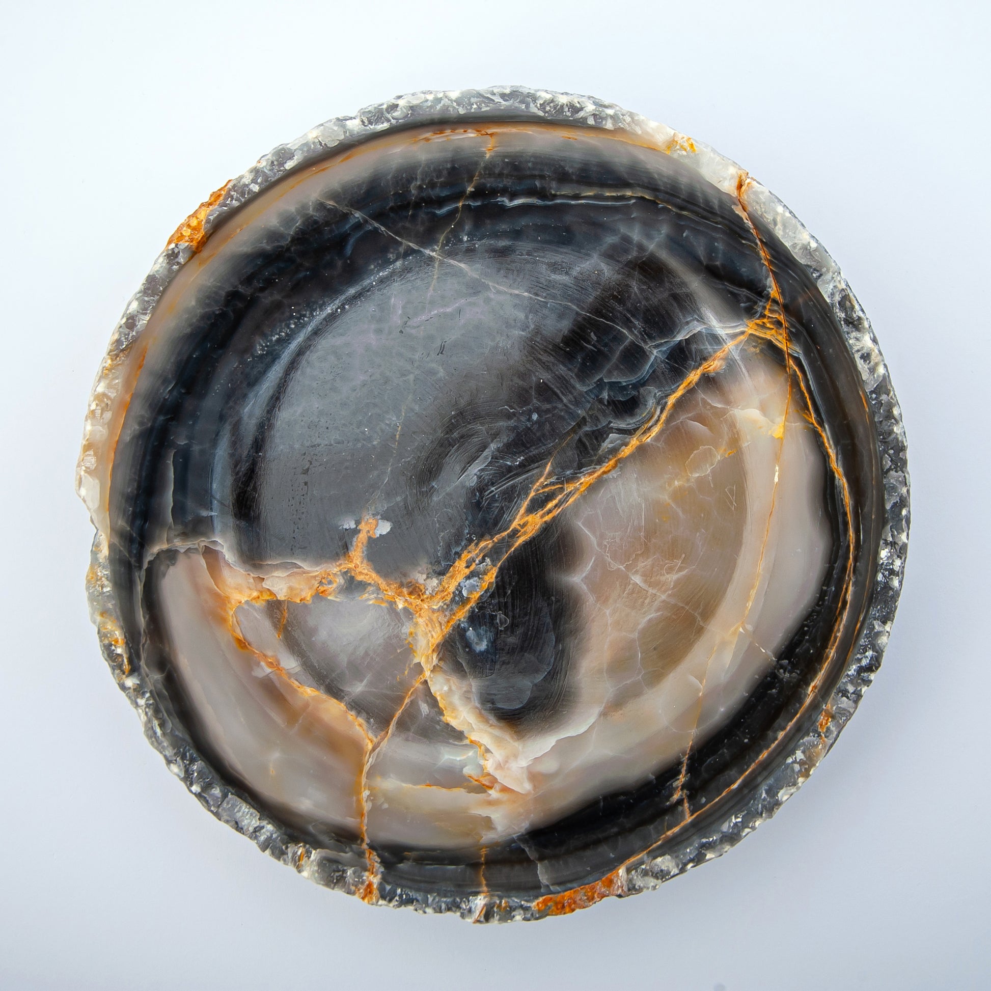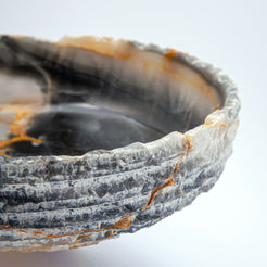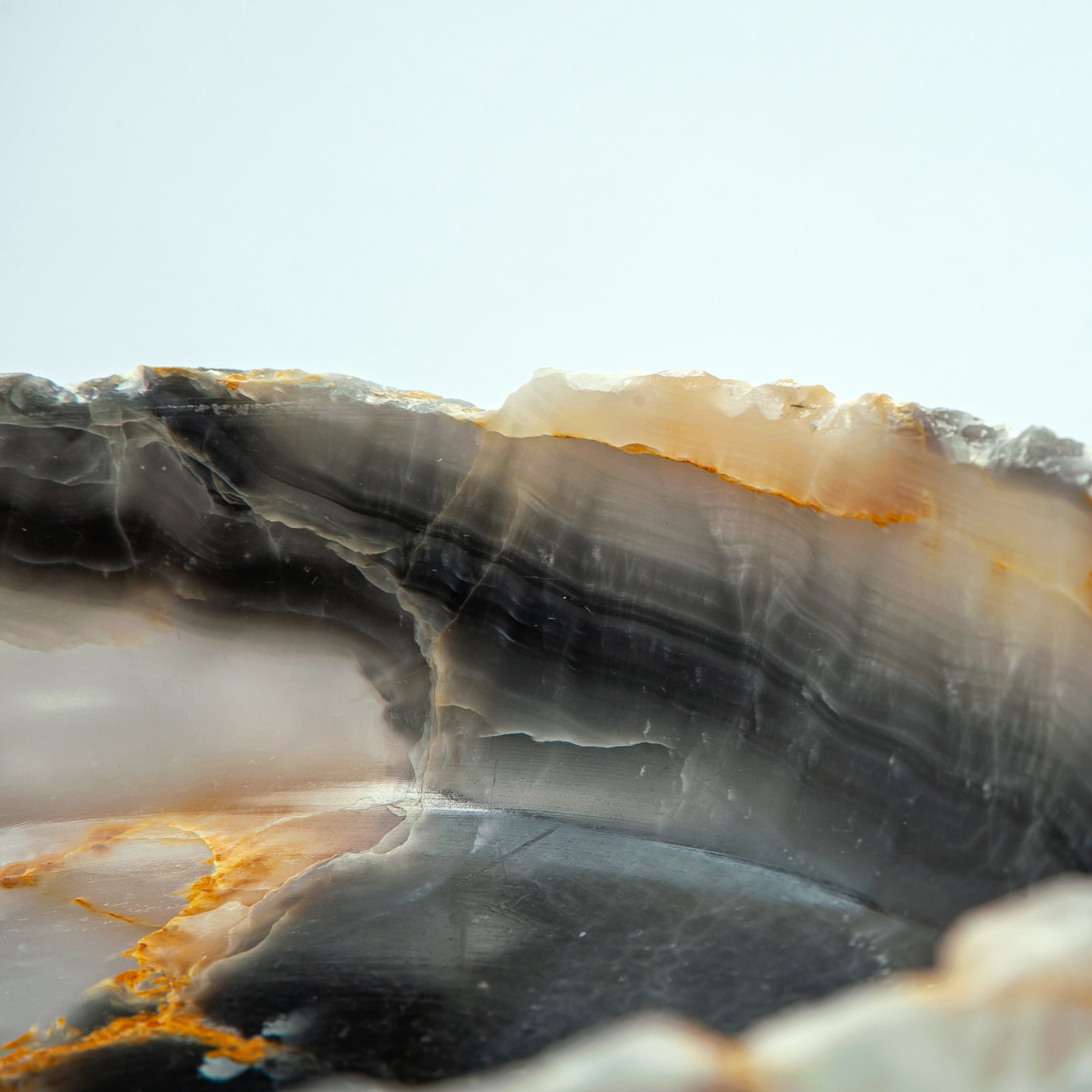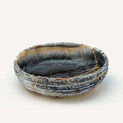 The Eclissa Bowl embodies the mysterious elegance of an eclipse, where shadow and light meet in perfect harmony. Hand-carved from richly veined black onyx, it features natural streaks of gold and amber that seem to glow like cracks of light across a darkened sky. Its organic edge and polished interior create a striking contrast, making it as much a sculptural art piece as a functional vessel. Ideal as a centerpiece, catchall, or decorative accent, the Eclissa Bowl brings a sense of drama and sophistication to any setting.