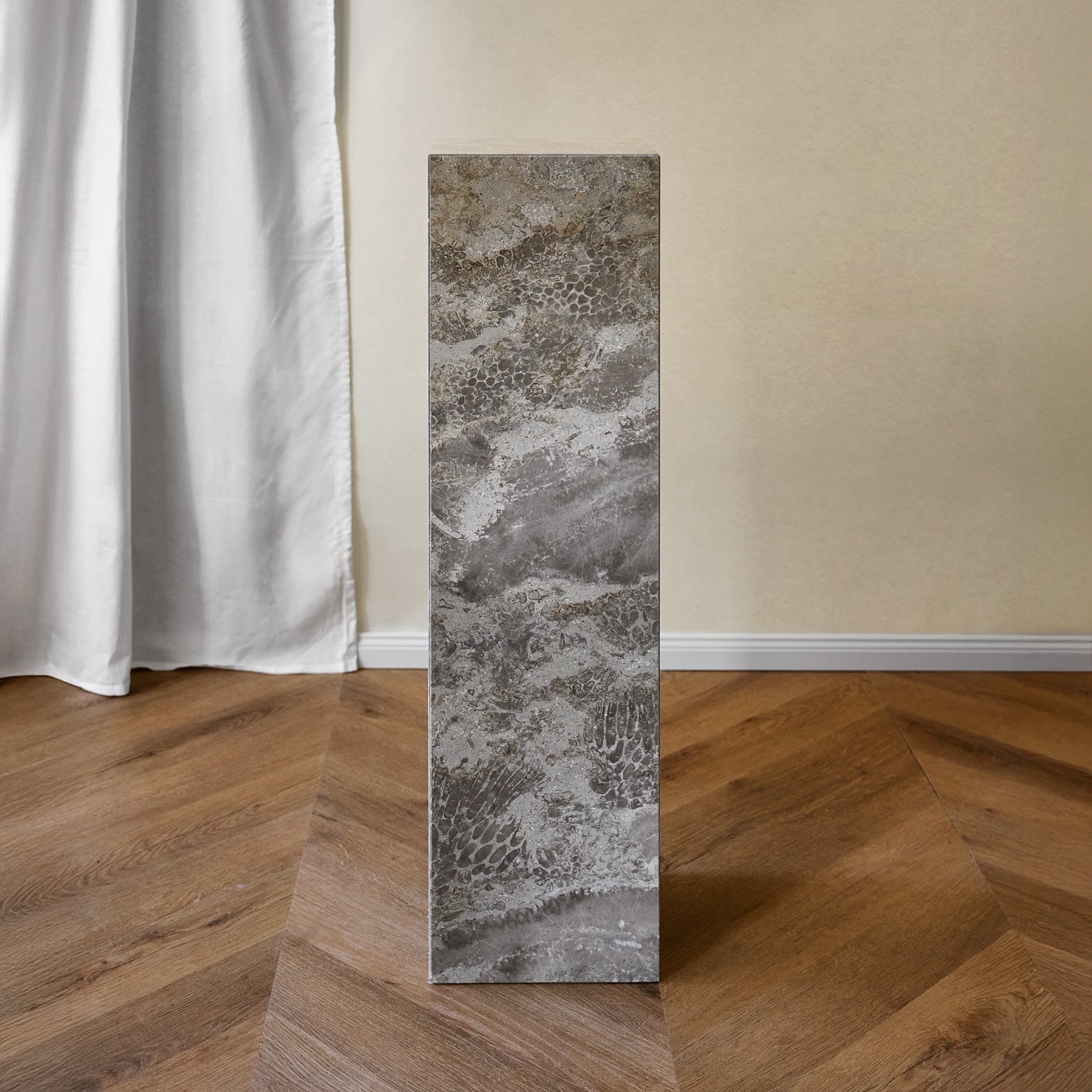 Introducing Eirene, a sculptural pedestal carved from expressive marble slabs in layered tones of smoky charcoal, sof...