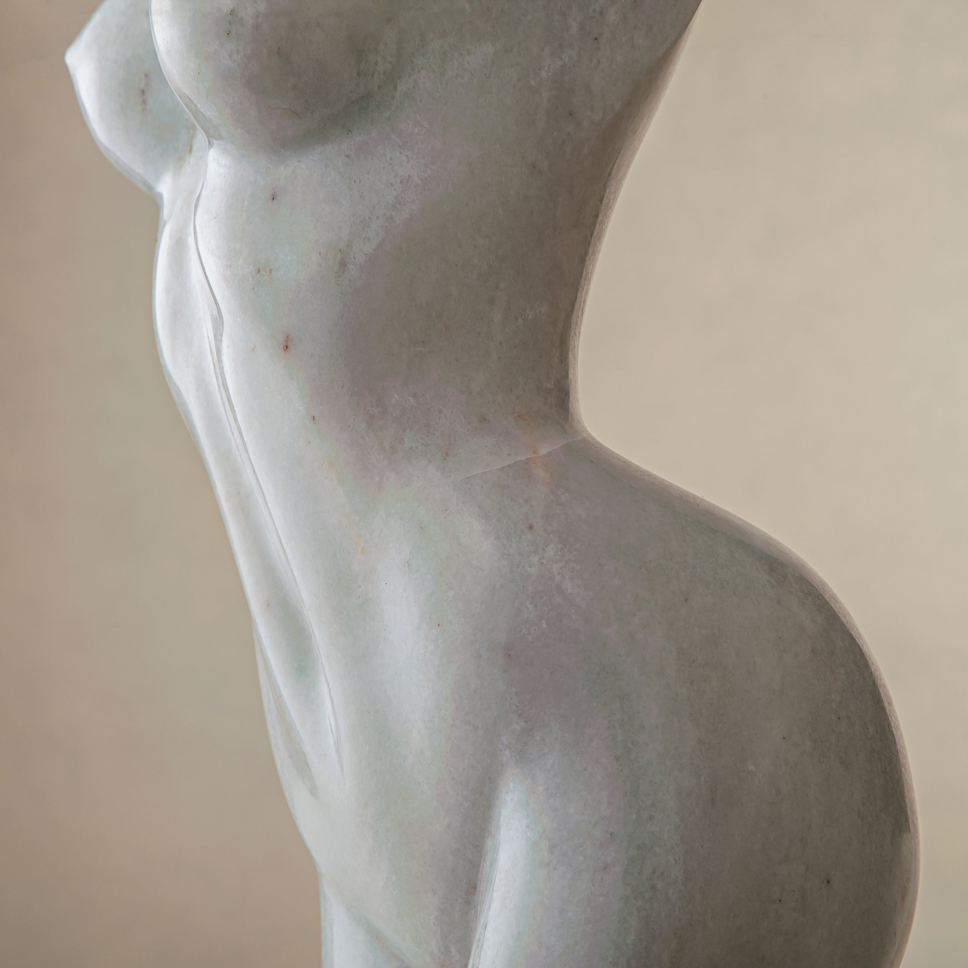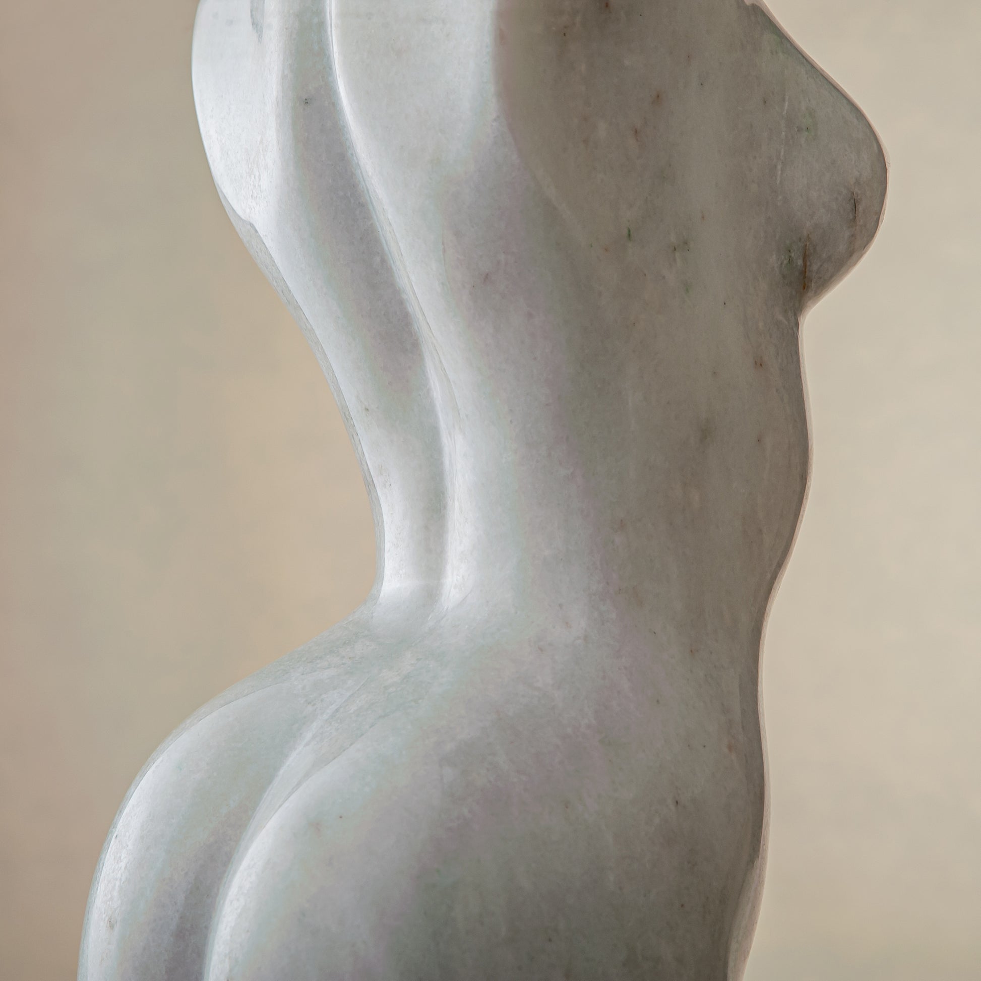 The Elaria Sculpture is carved from pure white marble, chosen for its soft luminosity and timeless elegance. Its flowing contours and gentle proportions celebrate the female form in a quiet, restrained way, allowing the natural beauty of the stone to take center stage.