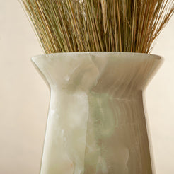 Sculpted from a single block of luminous white onyx, the Elarion Vase embodies purity, calm, and timeless elegance. Its tall, tapered silhouette draws the eye upward, emphasising the stone’s natural translucency and the warm golden veining that flows organically through each layer.