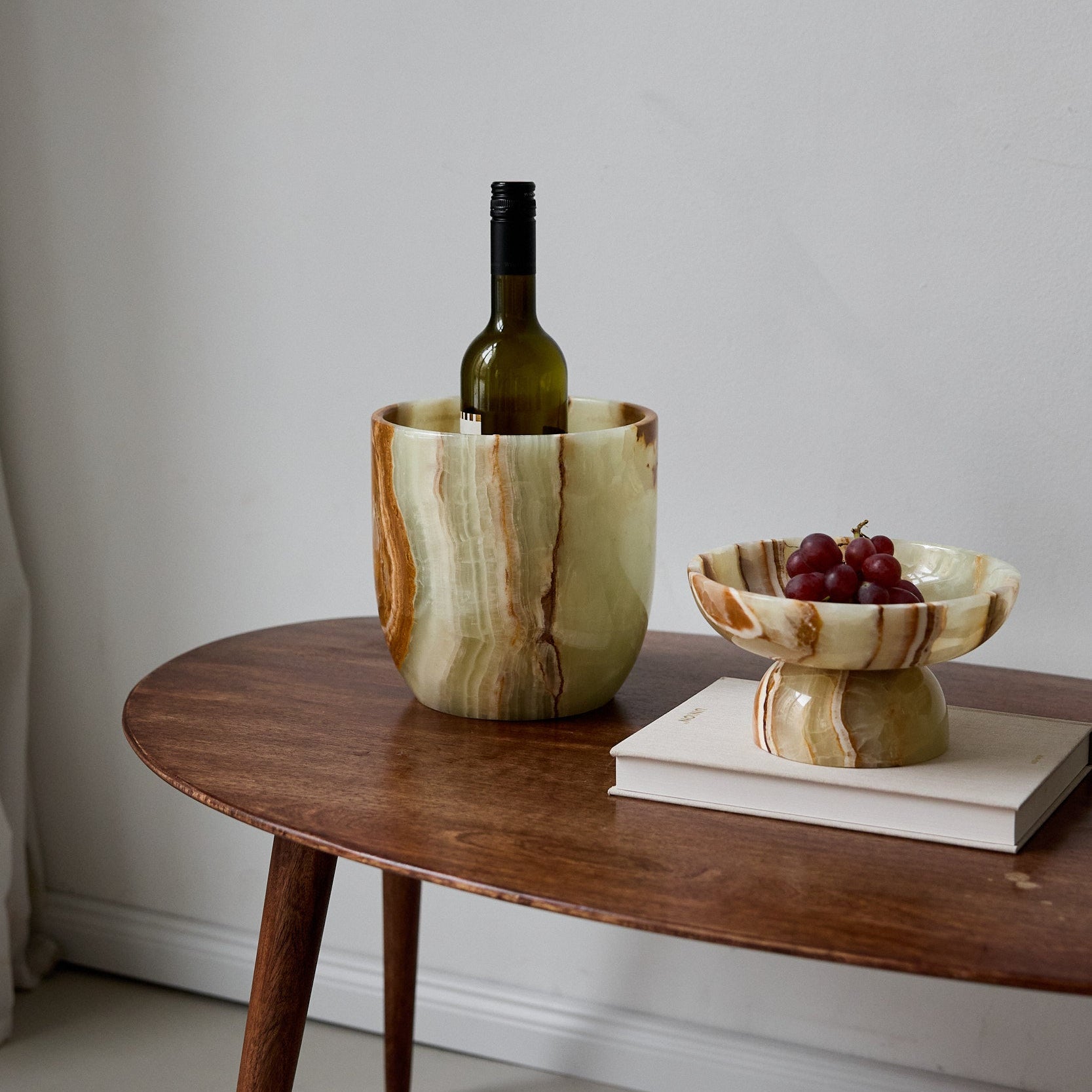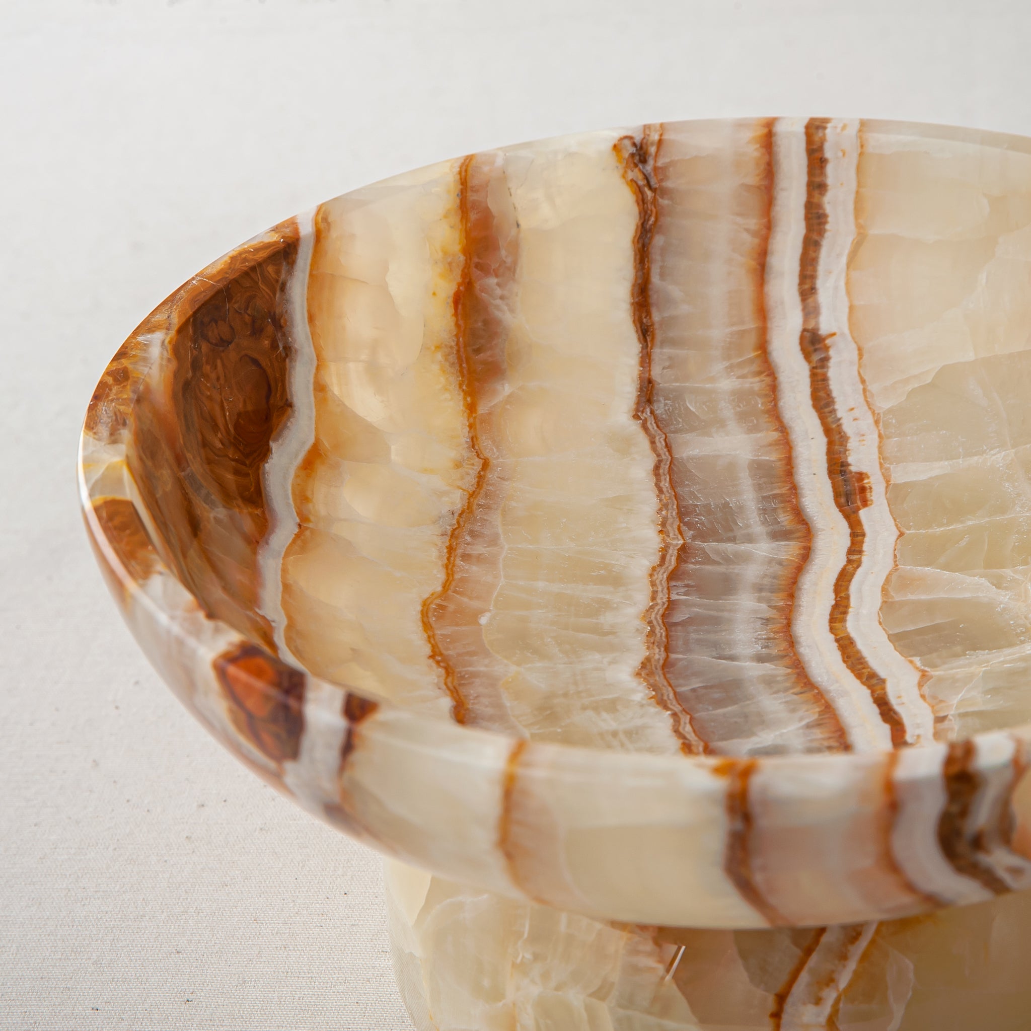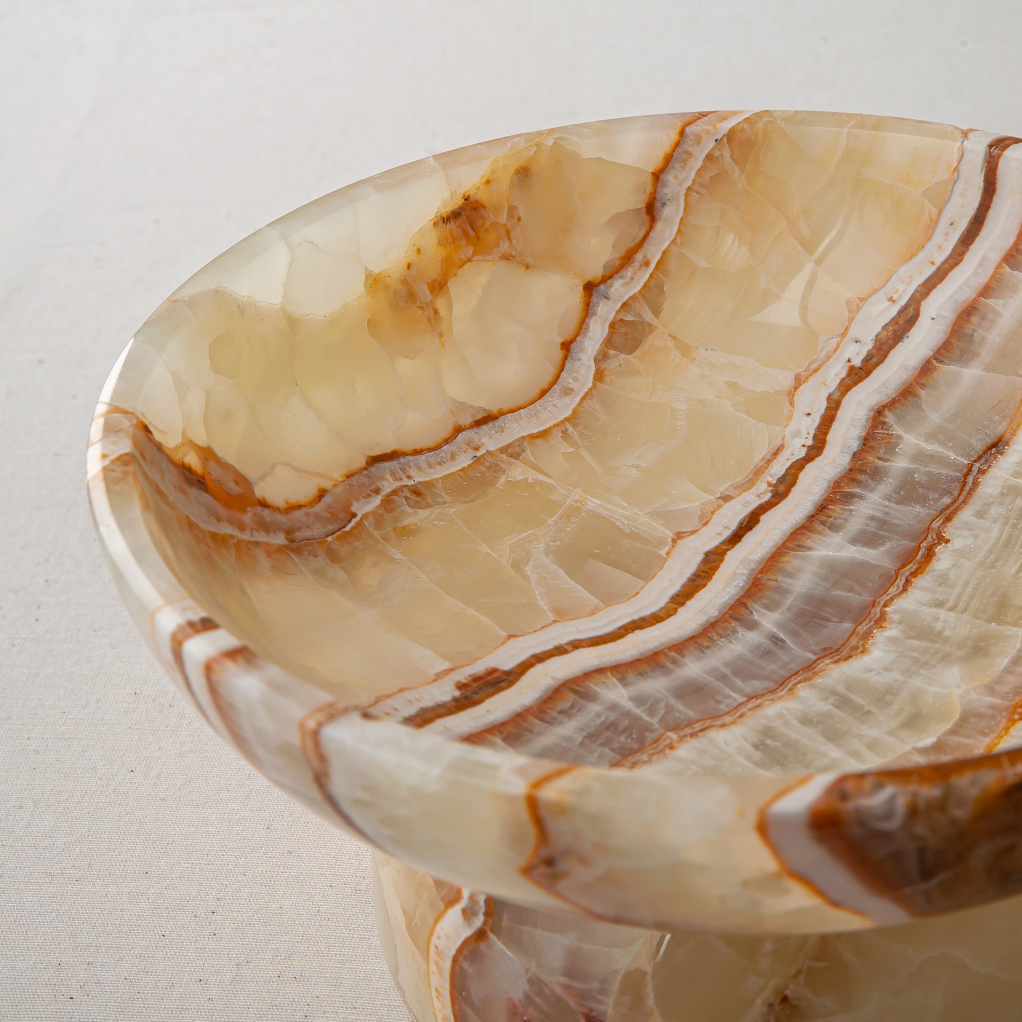 The Elowen Bowl is a one-of-a-kind sculptural object, handcrafted in our atelier from an exceptionally rare natural onyx. Carefully carved from a single block of stone, its softly rounded bowl and architectural pedestal base are shaped entirely by hand, allowing the natural character of the material to guide the final form.