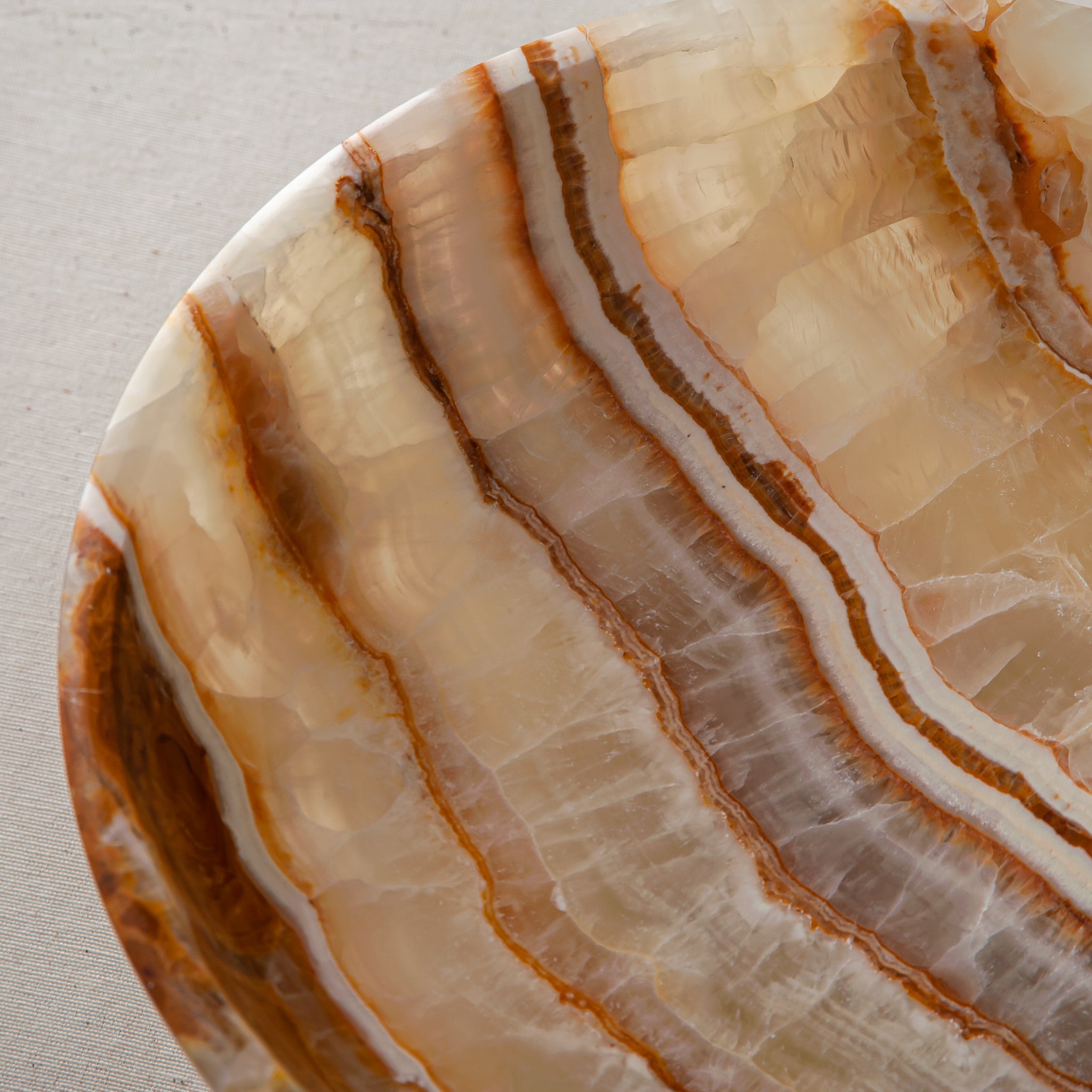 Delicate transitions of warm ivory, honey, and amber tones flow through the stone, intersected by organic veining formed over millions of years. These natural patterns are impossible to replicate, making this exact Elowen Bowl unique in every detail.