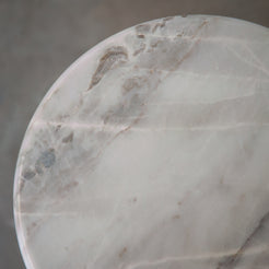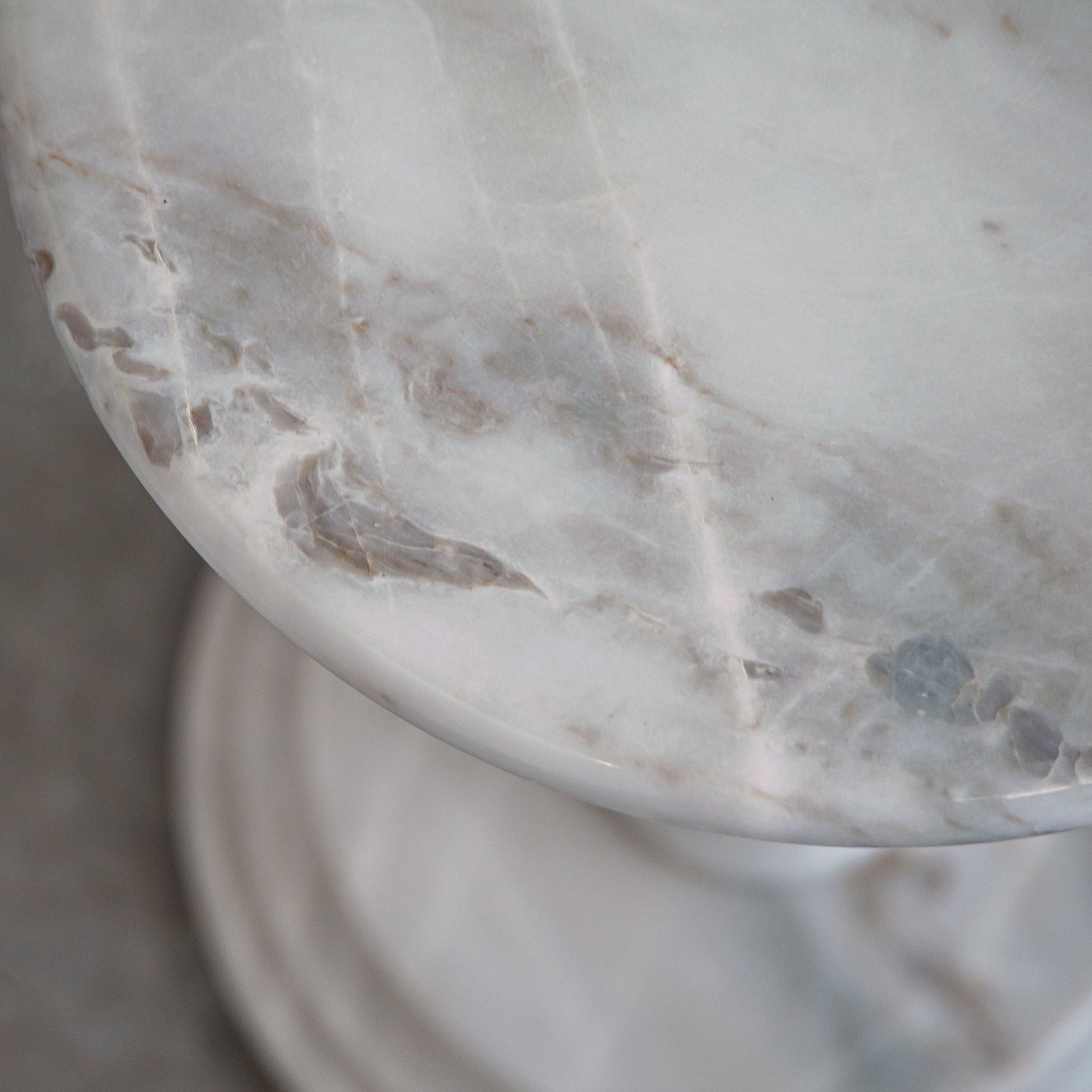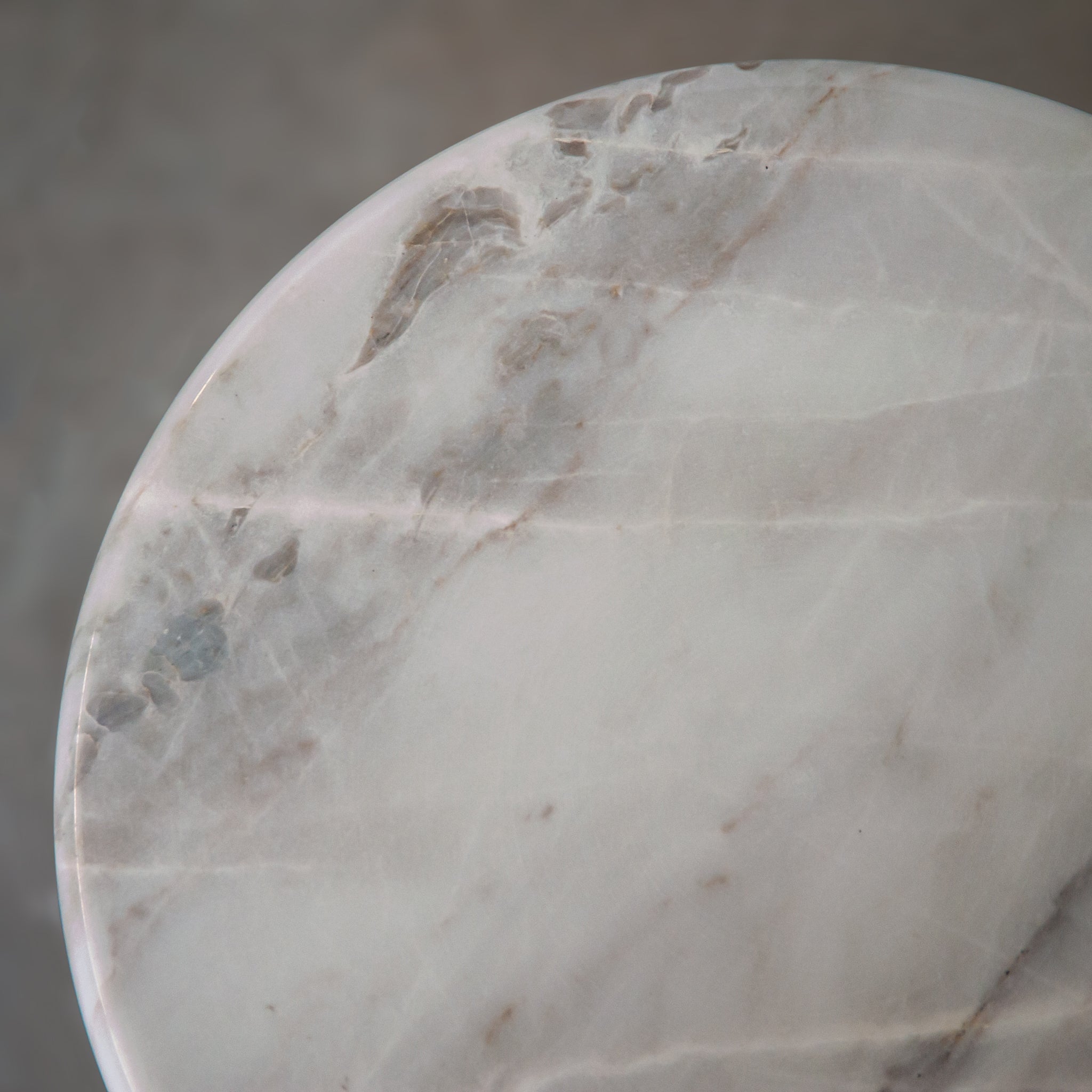 The Esmarion Side Table is carved from pristine white marble, selected for its luminous clarity and delicate natural ...