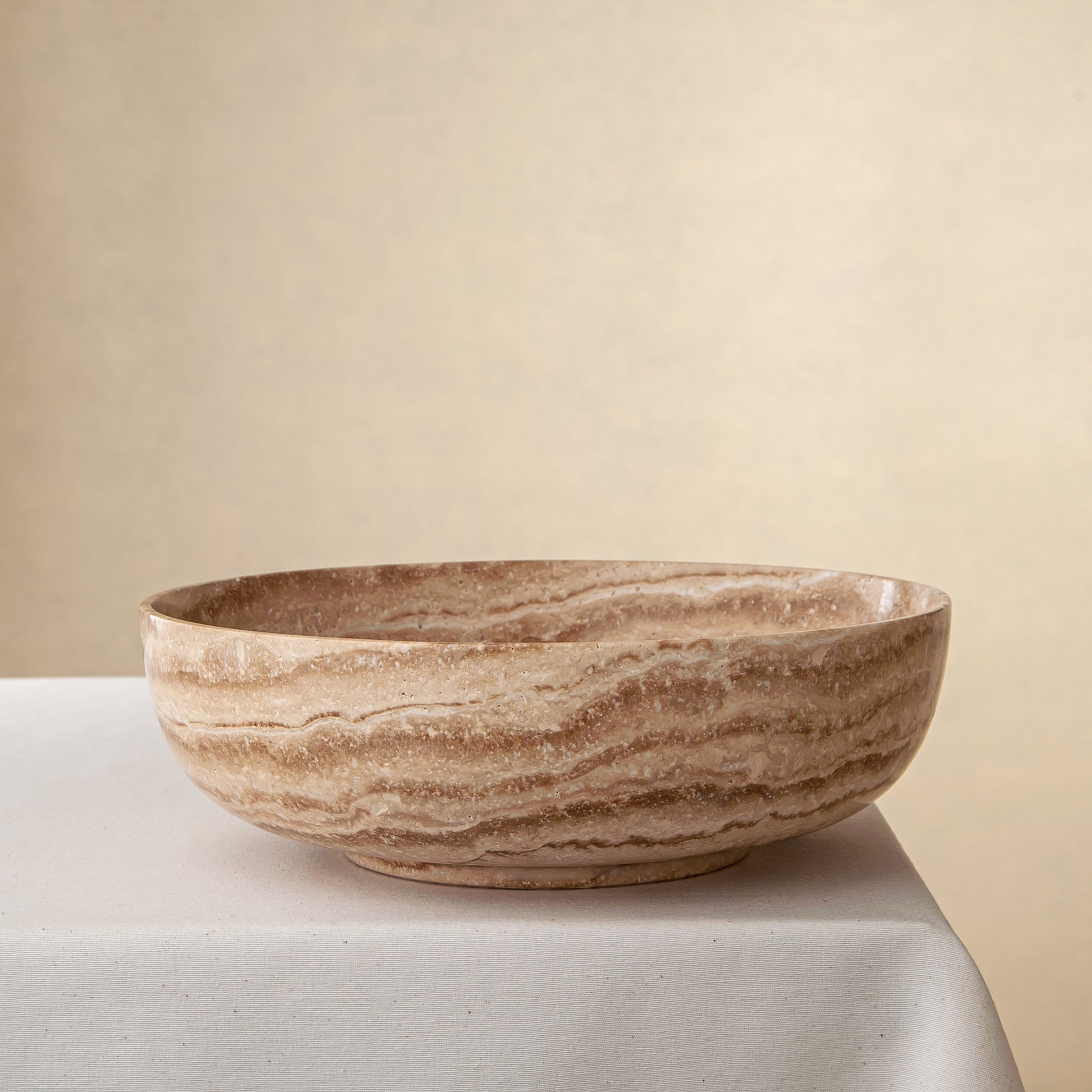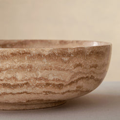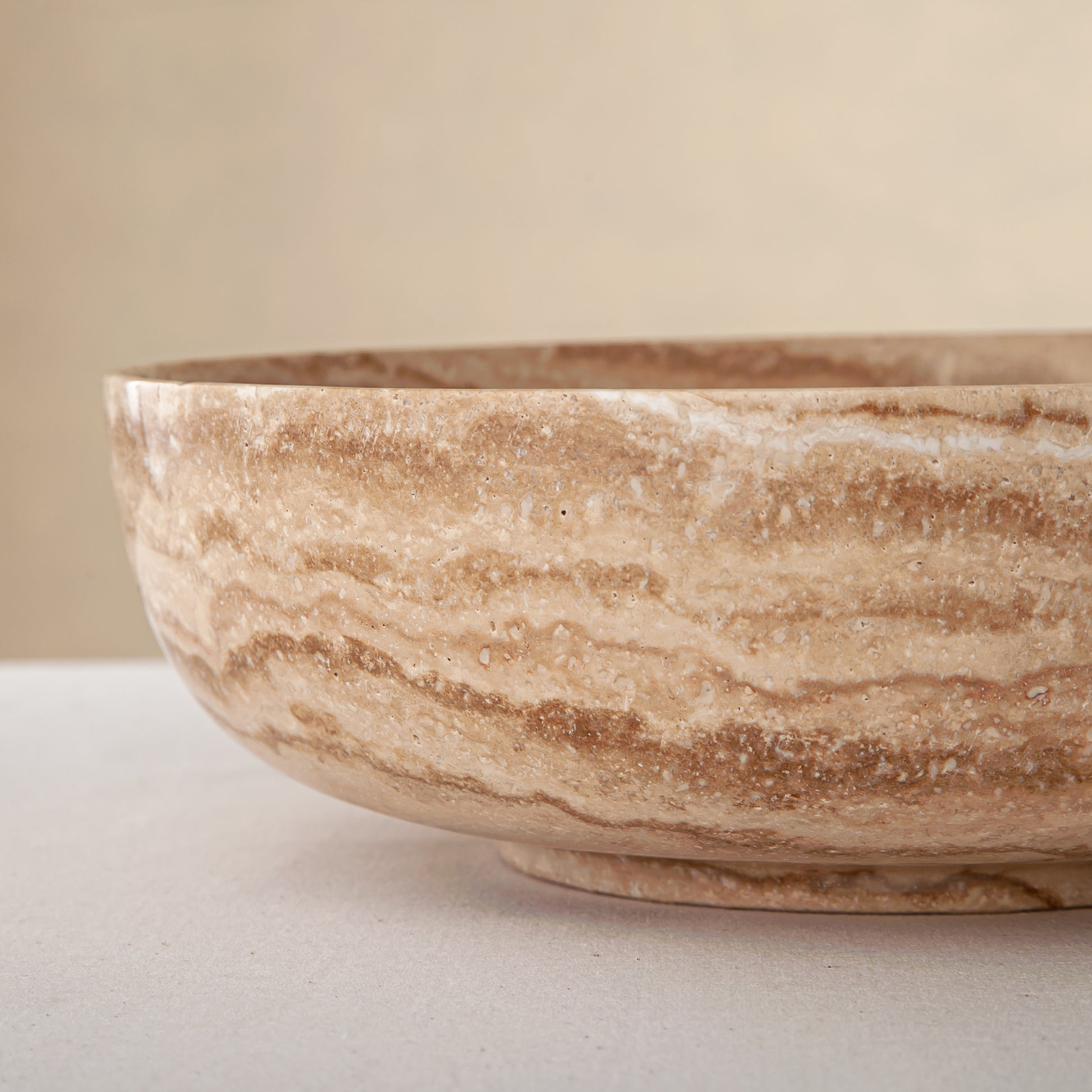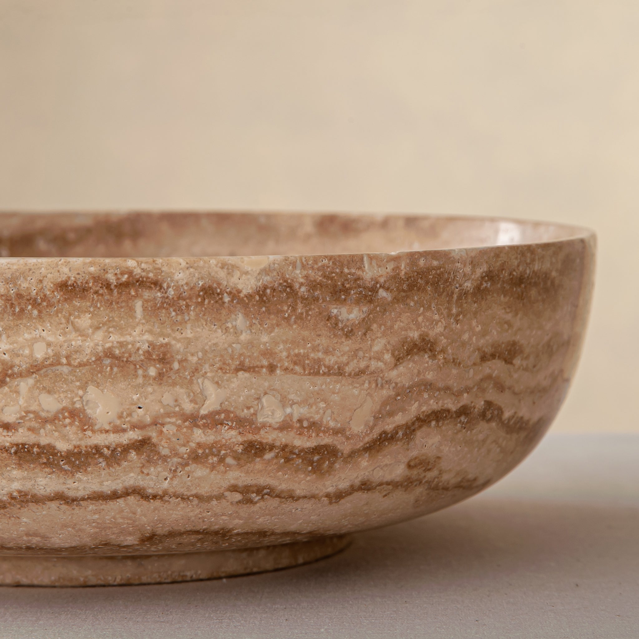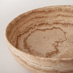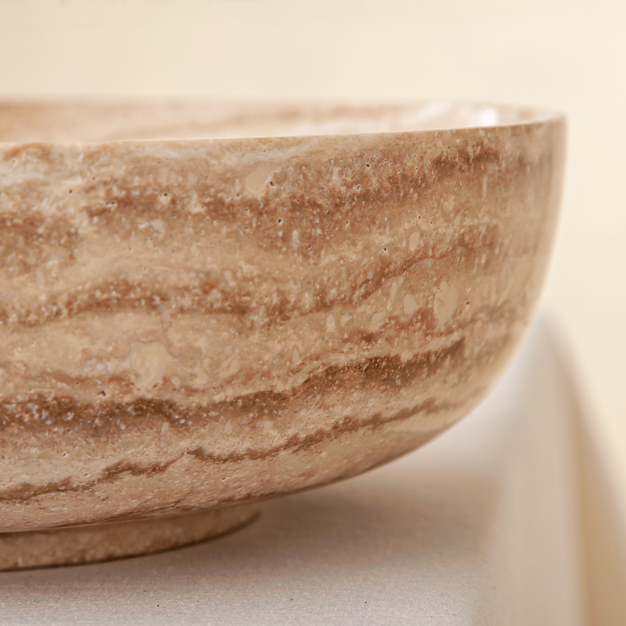 The Gigraf Bowl is an exquisite piece handcrafted from natural travertine, showcasing its distinctive layered patterns and warm earthy hues. The organic texture and unique veining create an elegant yet raw aesthetic, making it a perfect statement piece for any interior. Ideal for serving, displaying, or simply as a decorative element, this bowl embodies timeless beauty and the artistry of nature.