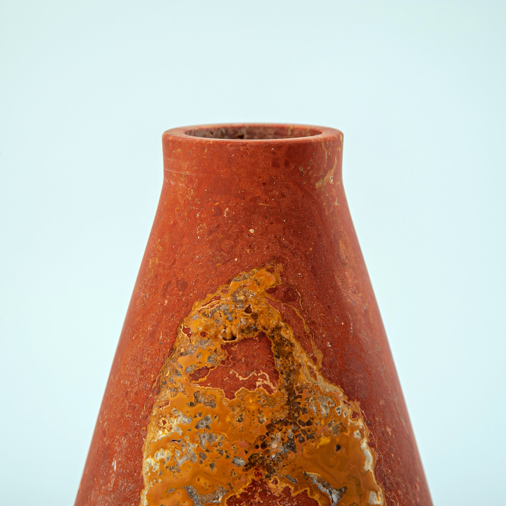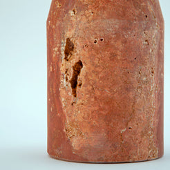 Its warm terracotta-red tones, natural mineral veins, and sculptural cylindrical form highlight the raw beauty of the material.