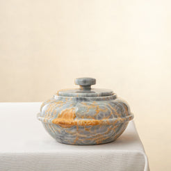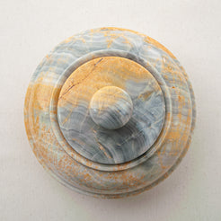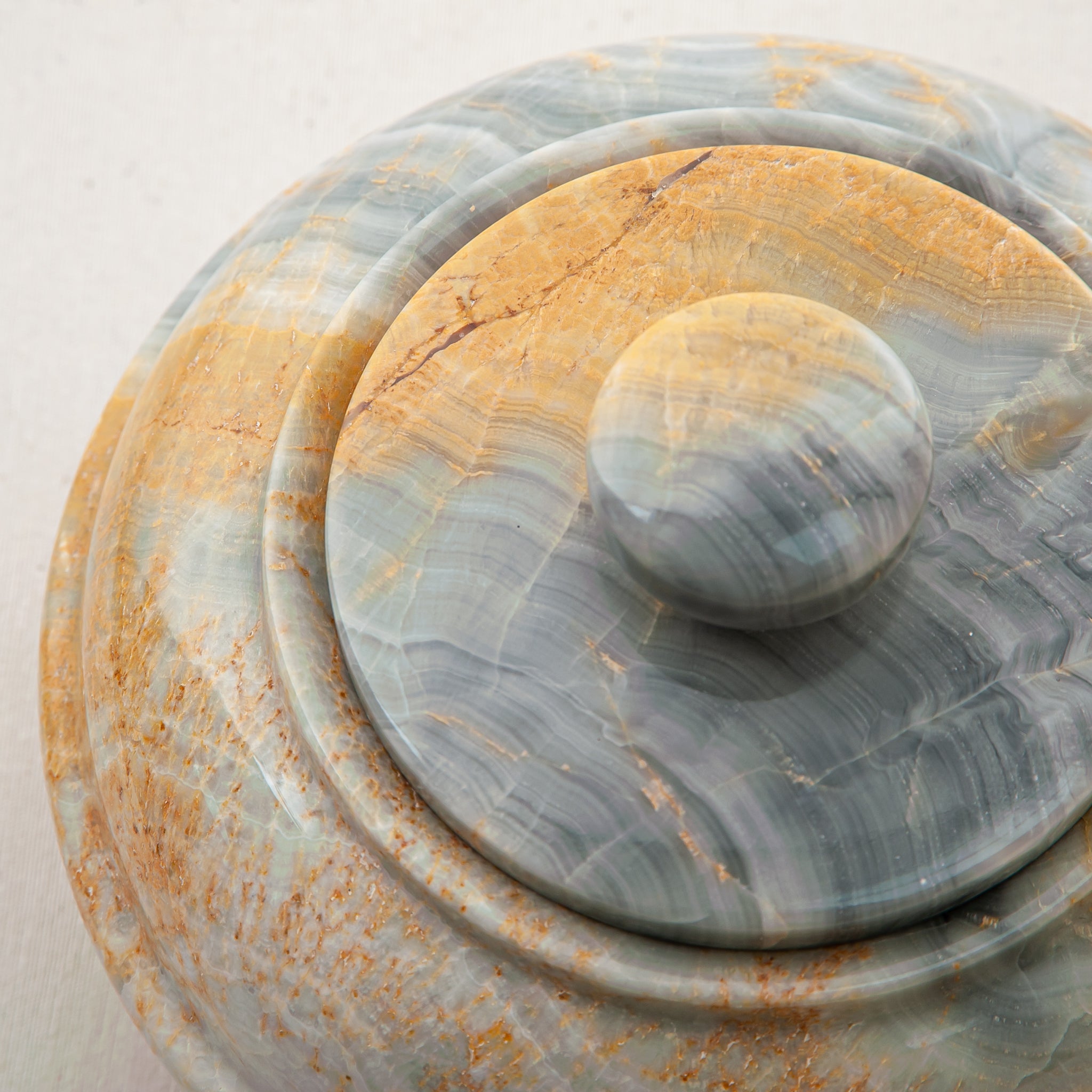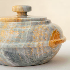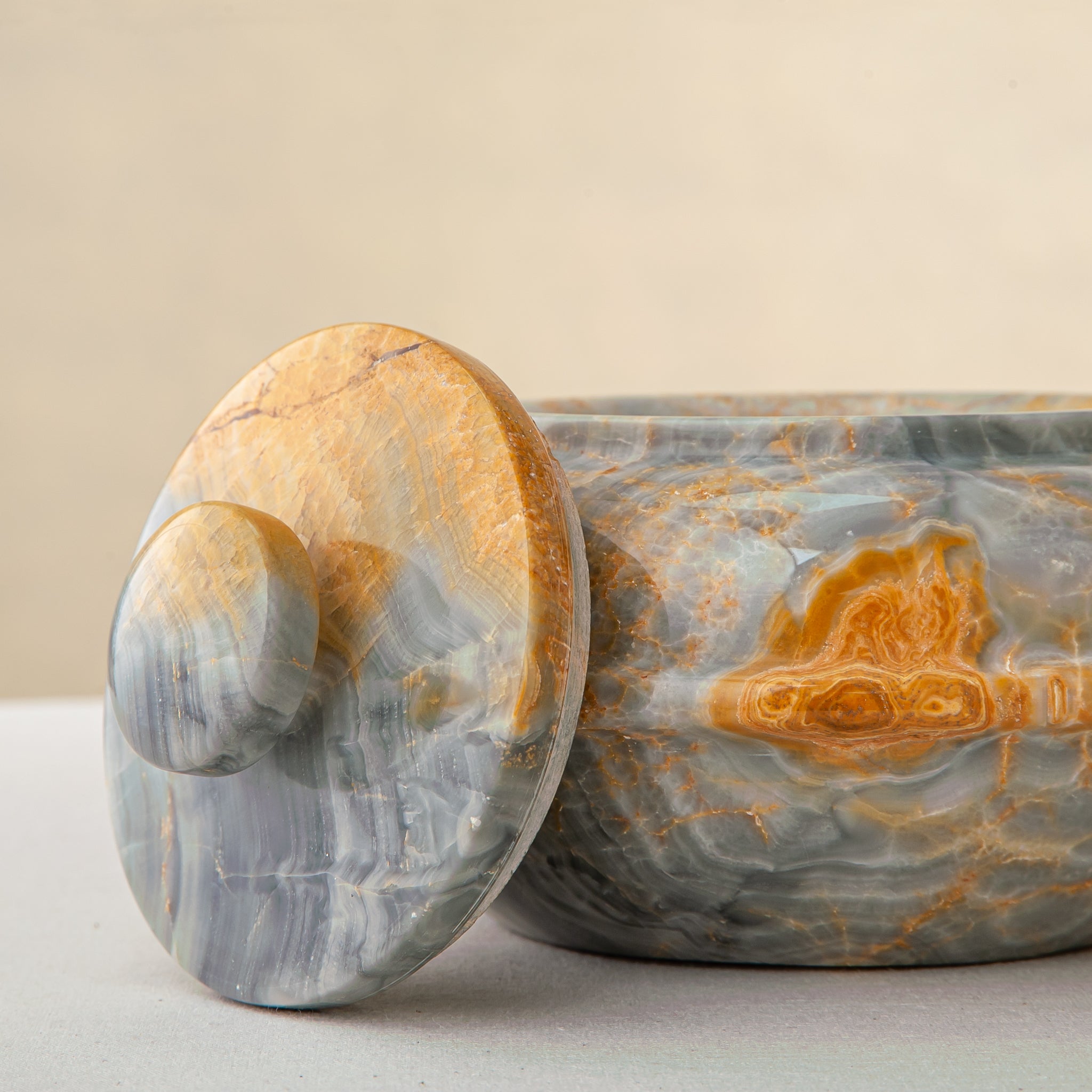 The Lithéon Jar is a one of a kind object, handcrafted in our atelier from a rare natural stone. Its soft blue grey body is veined with warm amber and honey tones, creating an organic pattern that can never be repeated. Polished to a smooth finish, the stone reveals its depth and natural movement under the light.