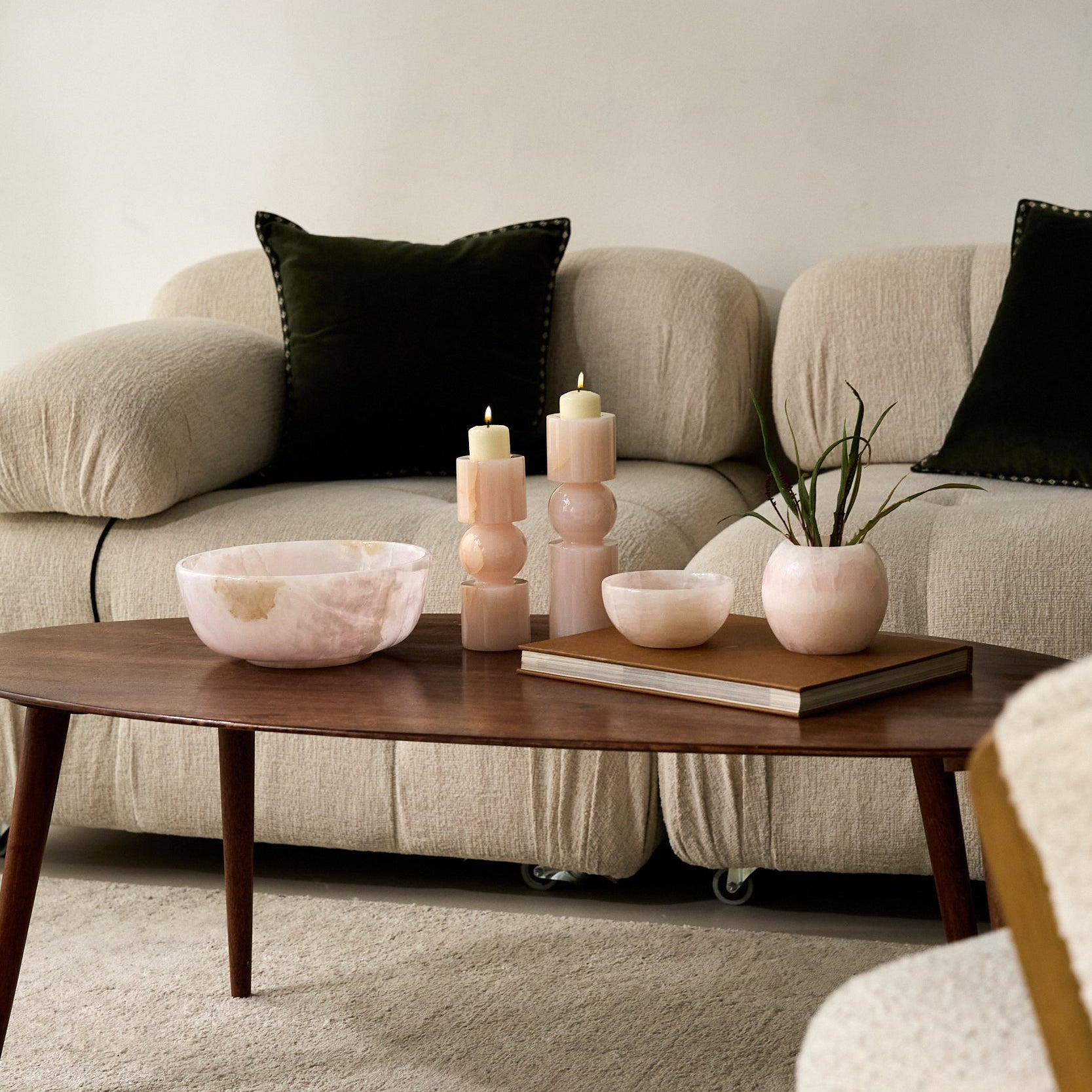 A sculptural harmony of form and rarity, the Lunéa Candle Holder is hand-carved from exceptionally rare pink onyx—an ethereal stone admired for its soft translucency and gentle blush tones. Each curve of this unicat piece reflects a balance between minimalism and bold elegance, with the natural golden veining adding a poetic accent to its serene geometry.