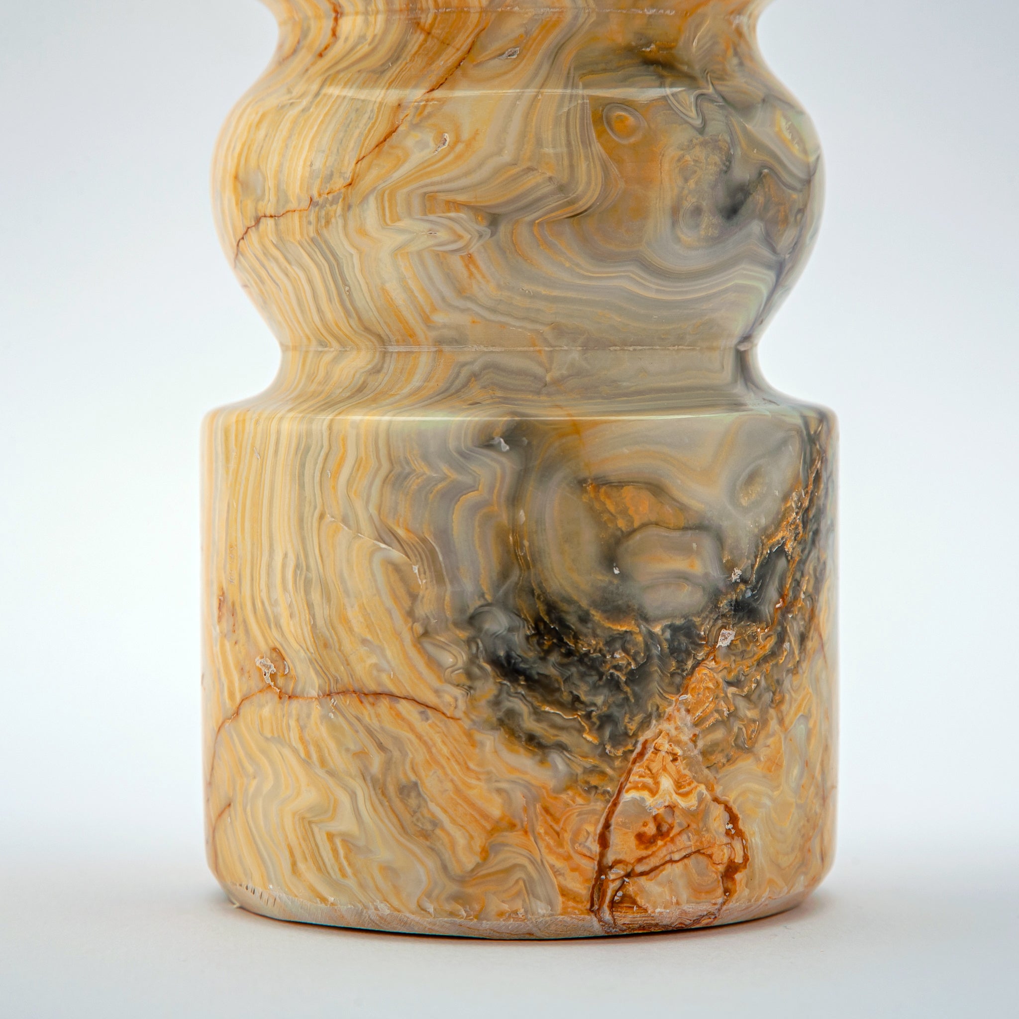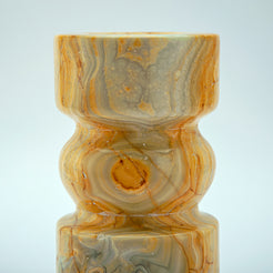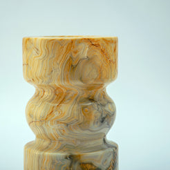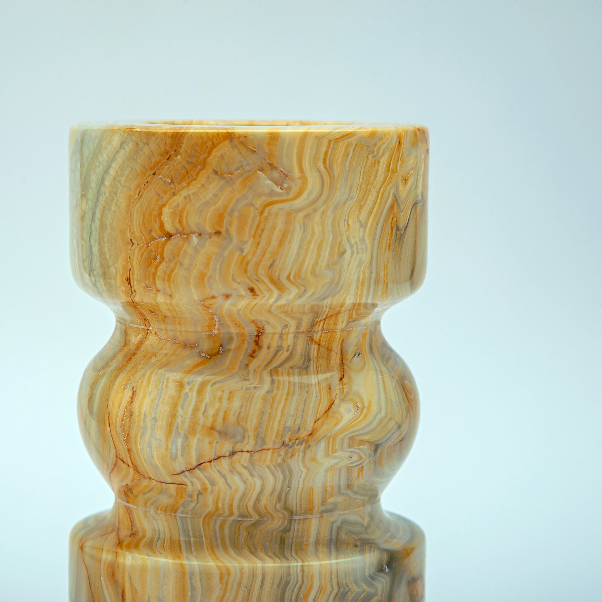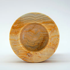 The Luthien Candle Holder is a sculptural statement piece carved from golden-veined onyx, with undulating curves that feel both elegant and grounded. Its warm, honeyed tones are alive with natural patterns, evoking rays of sunlight captured in stone. Designed to hold a single taper or pillar candle, Luthien transforms any space with its soft, ambient glow and adds an element of timeless sophistication to your décor.