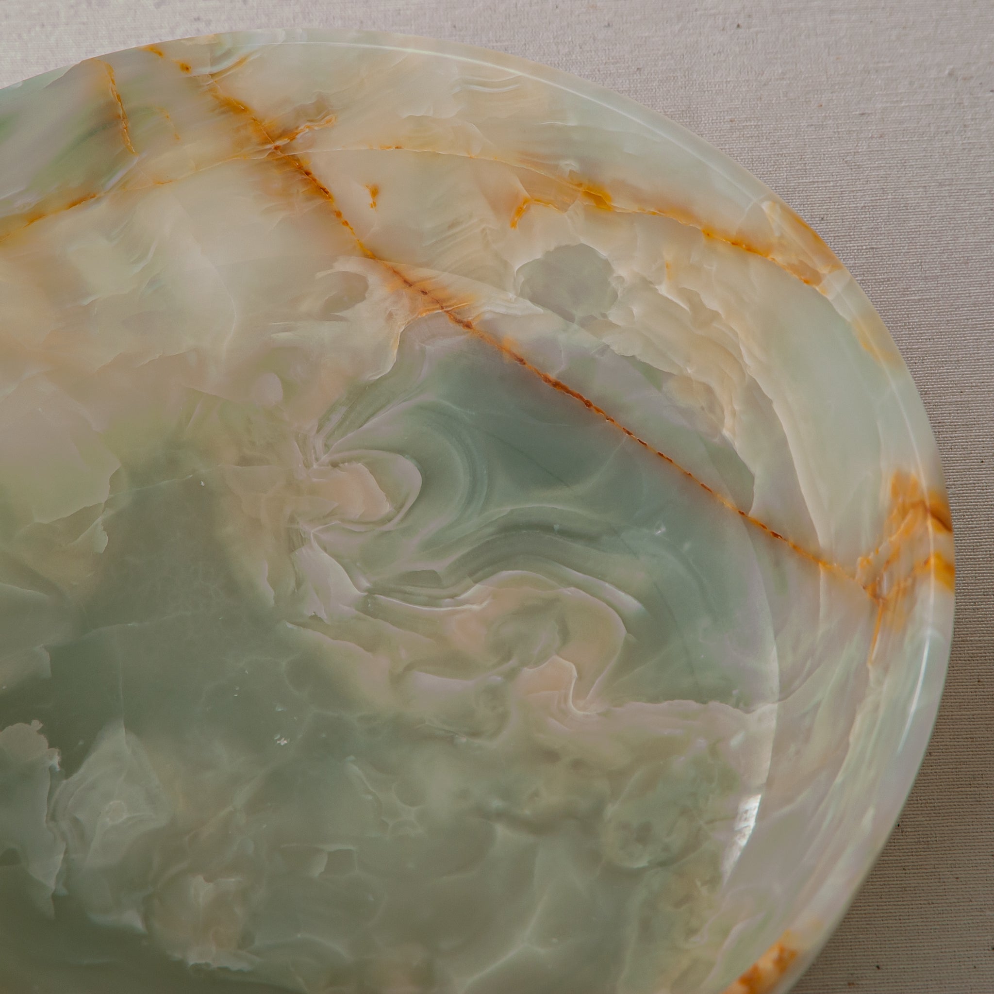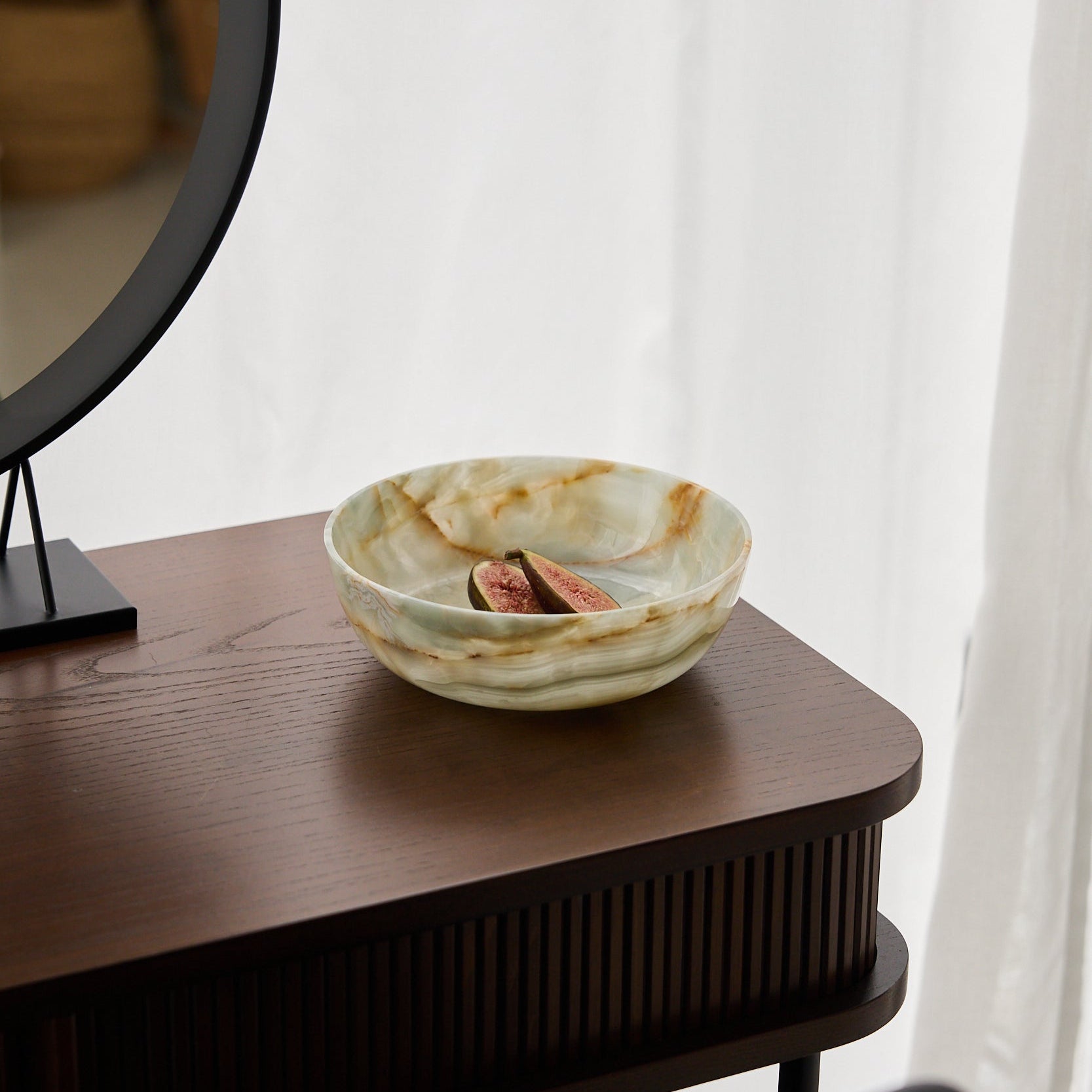 The Nerelis Bowl is carved from rare green onyx, celebrated for its soft translucency and gentle mineral depth. Subtle layers of pale green, cream, and warm earth tones flow naturally through the stone, creating a calm and balanced visual rhythm.
