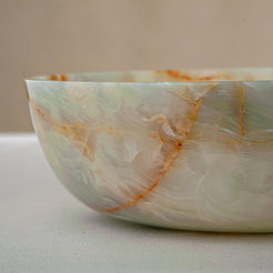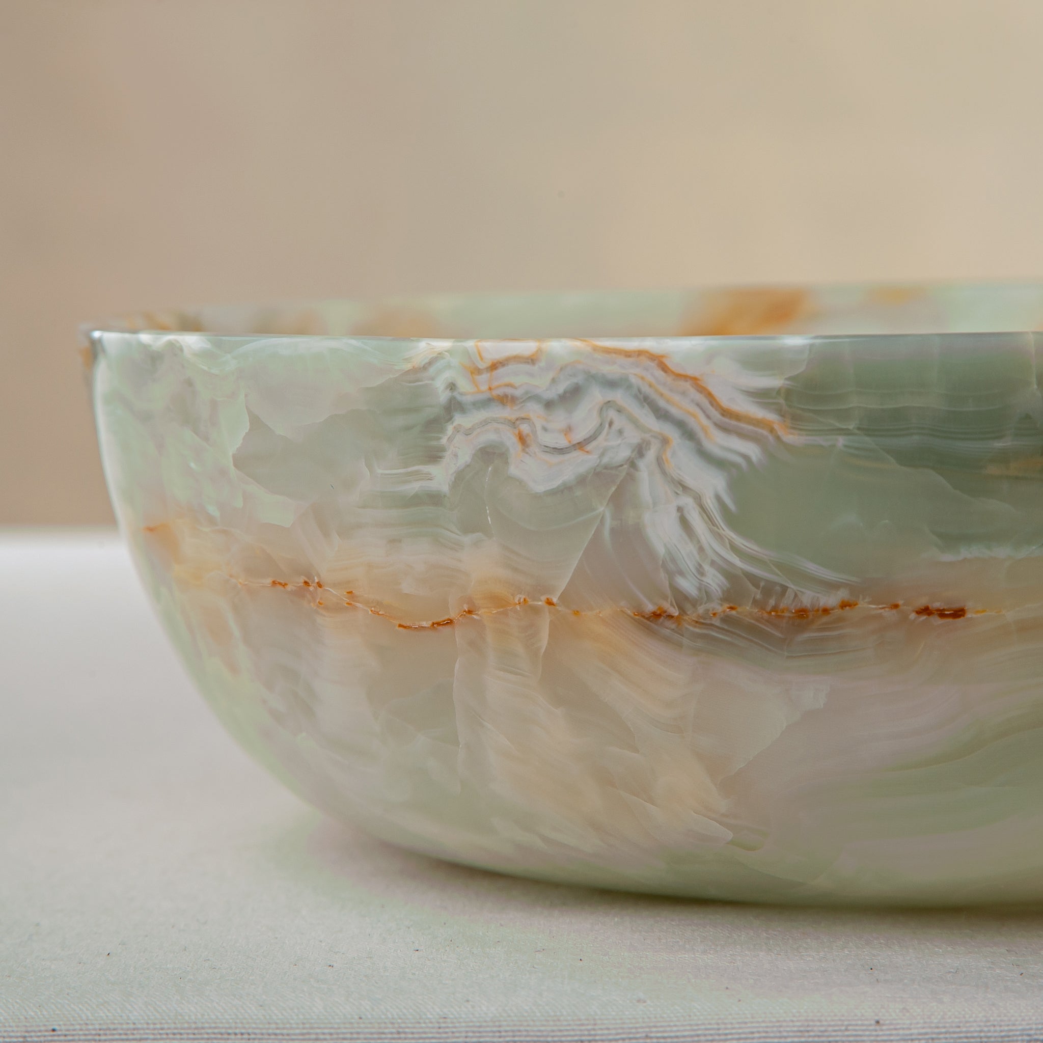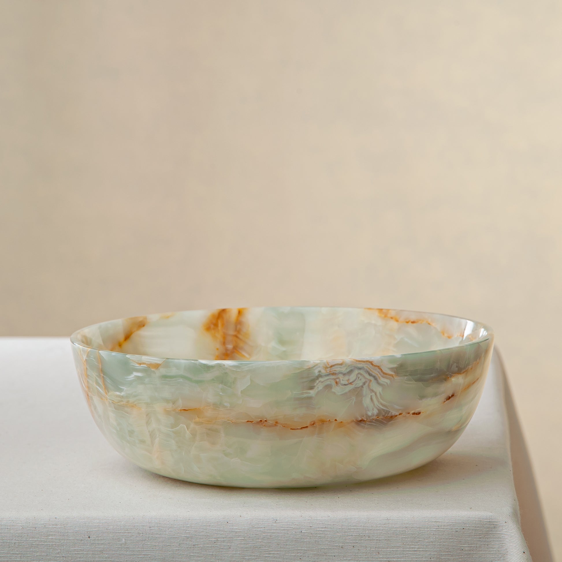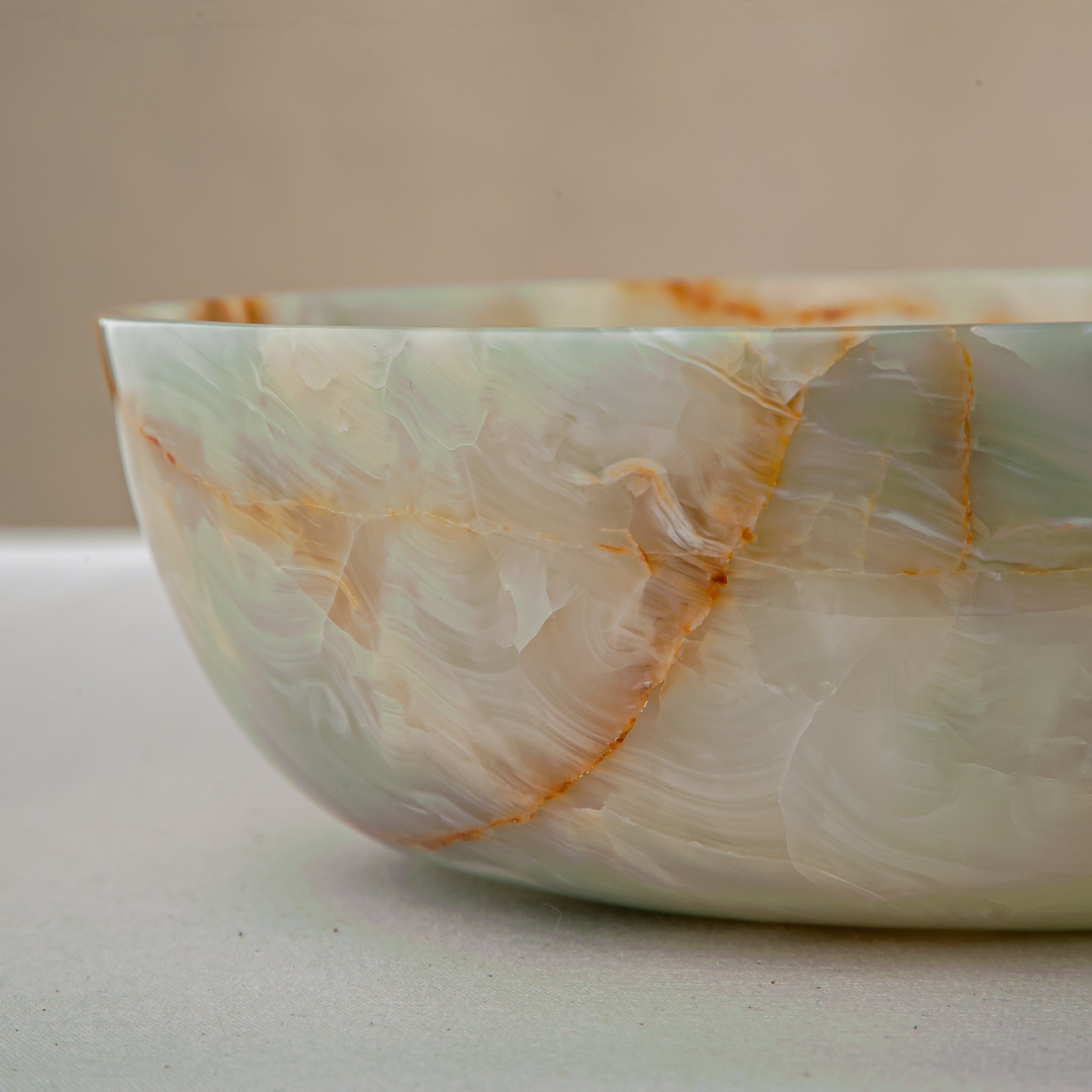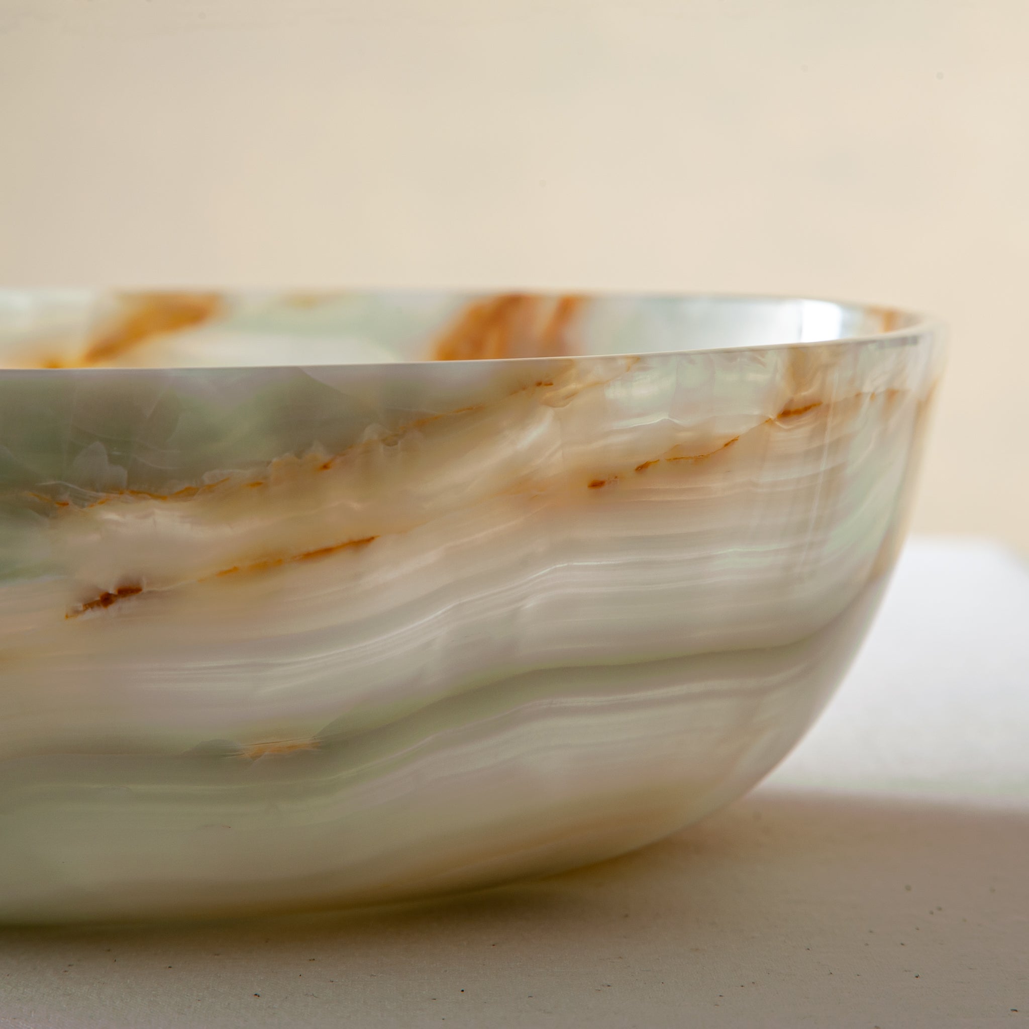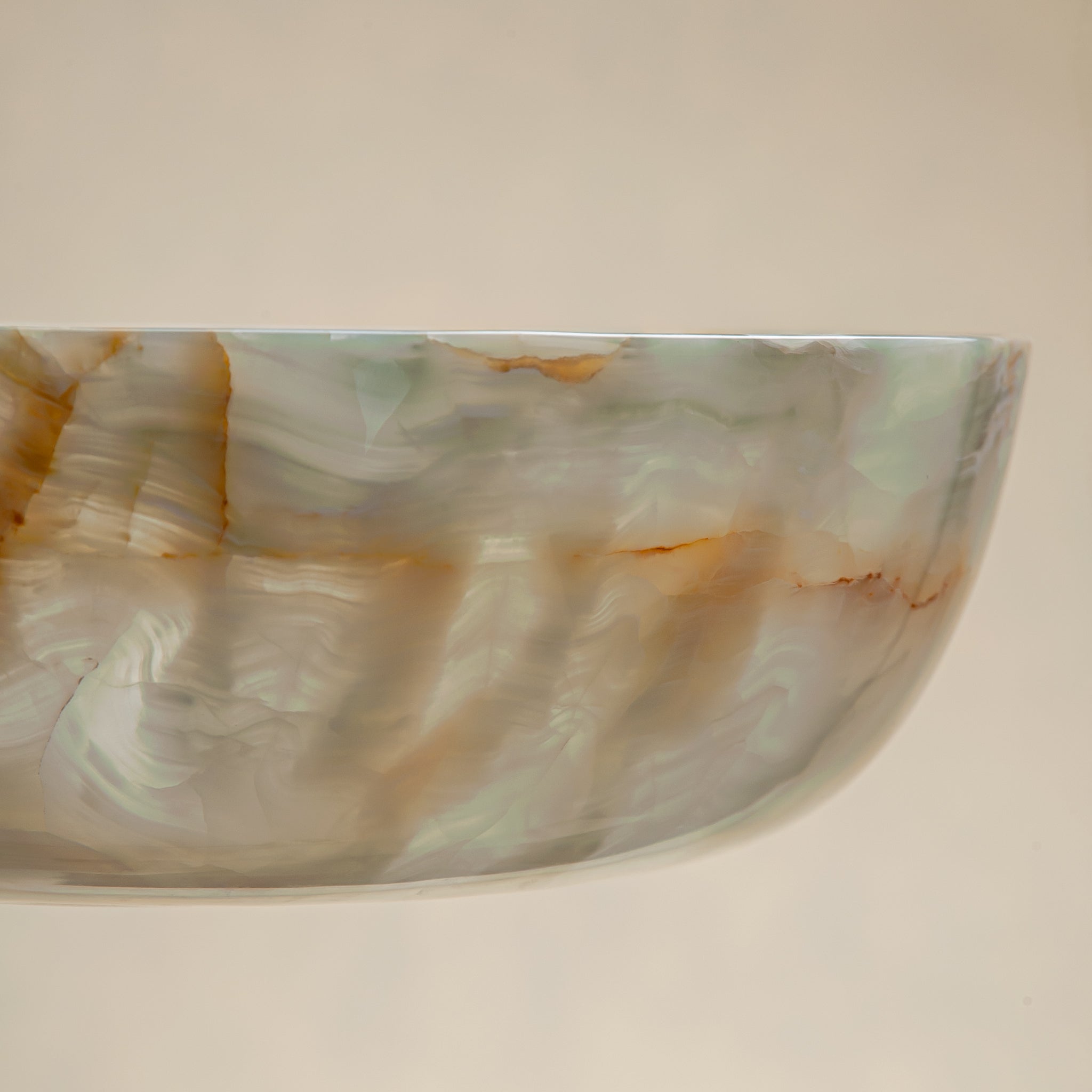 Shaped from a single onyx block and finished by hand, the bowl preserves the organic movement of the material while maintaining a refined, timeless form. Each piece is entirely unique, with natural variations in veining and color that reflect the stone’s origin and age.