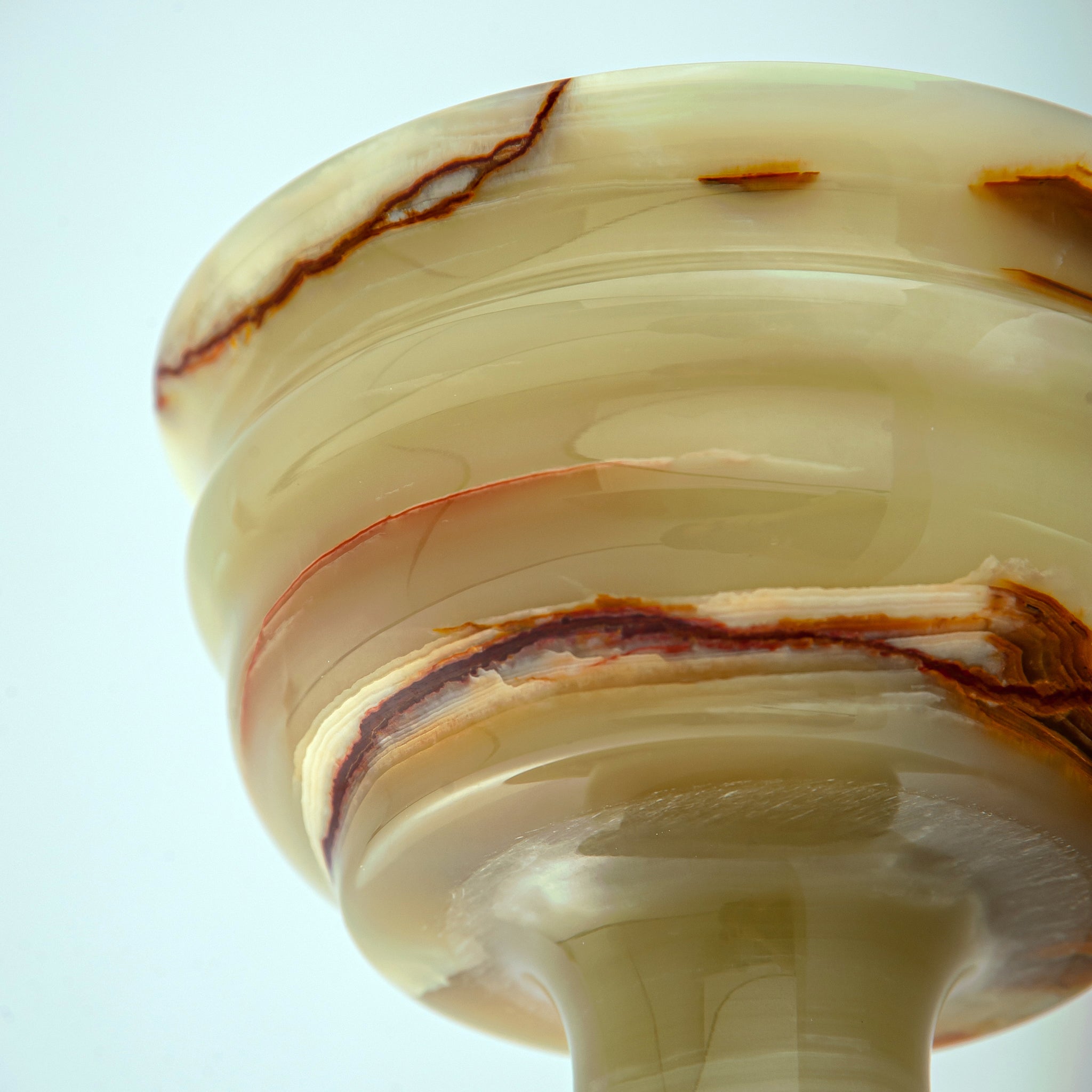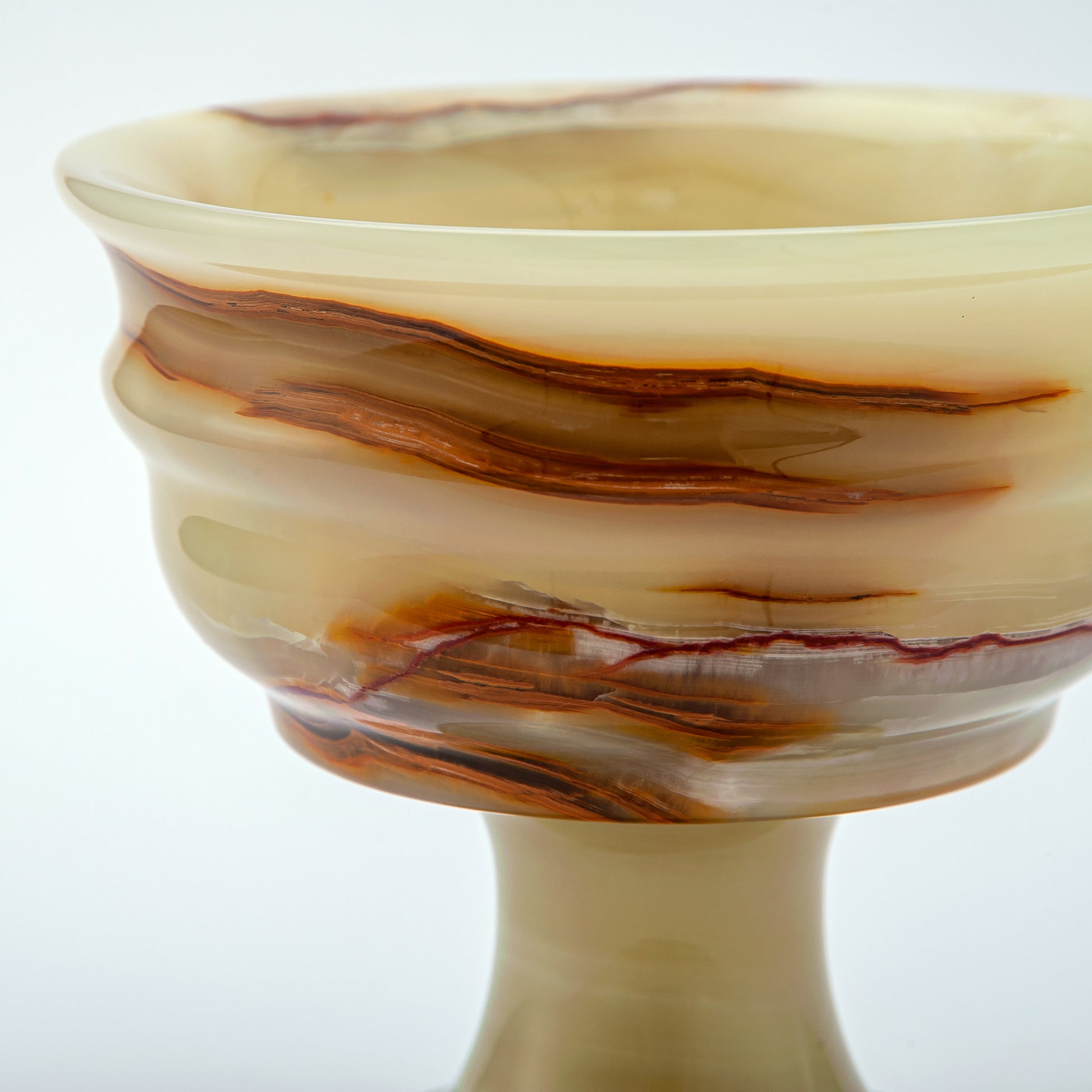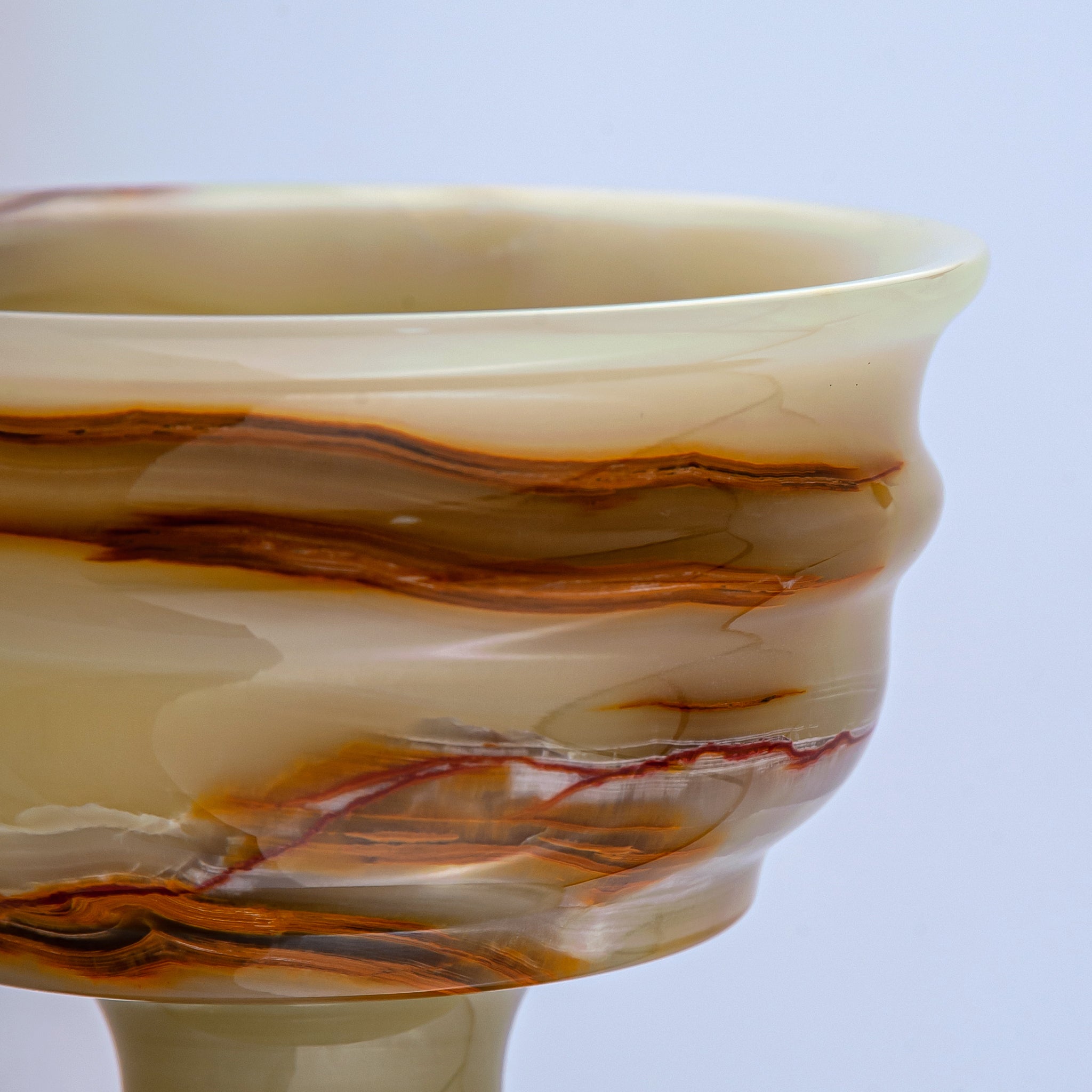 The Olivara Bowl is a timeless piece crafted from richly veined onyx, showcasing warm olive, honey, and amber tones layered in natural striations. Its graceful pedestal base and gently flared rim create a harmonious silhouette, balancing elegance with grounding earthiness. Each bowl is a one-of-a-kind expression of nature’s artistry, with unique banding and subtle translucency that catch the light beautifully.