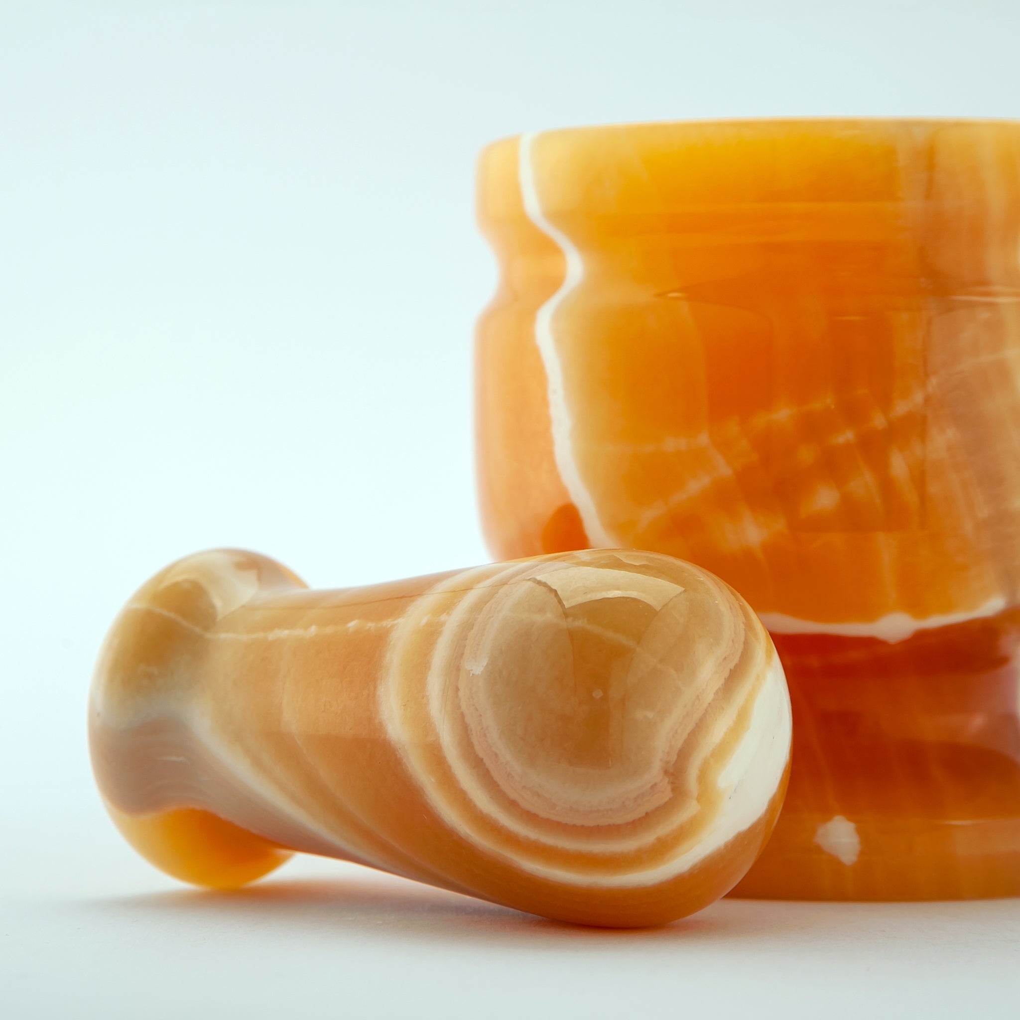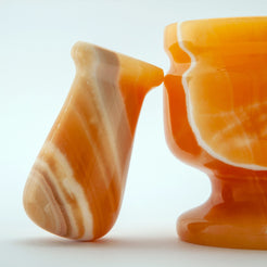 The Oranyth Mortar & Pestle is a radiant kitchen and décor piece, carved from vivid orange onyx with striking white veins. Its pedestal base and rounded form offer both stability and elegance, while the polished surface highlights the natural translucence and fiery depth of the stone. Perfect for grinding spices, herbs, or simply as a statement piece, Oranyth brings a warm, sunlit glow to any space, turning everyday rituals into moments of beauty.