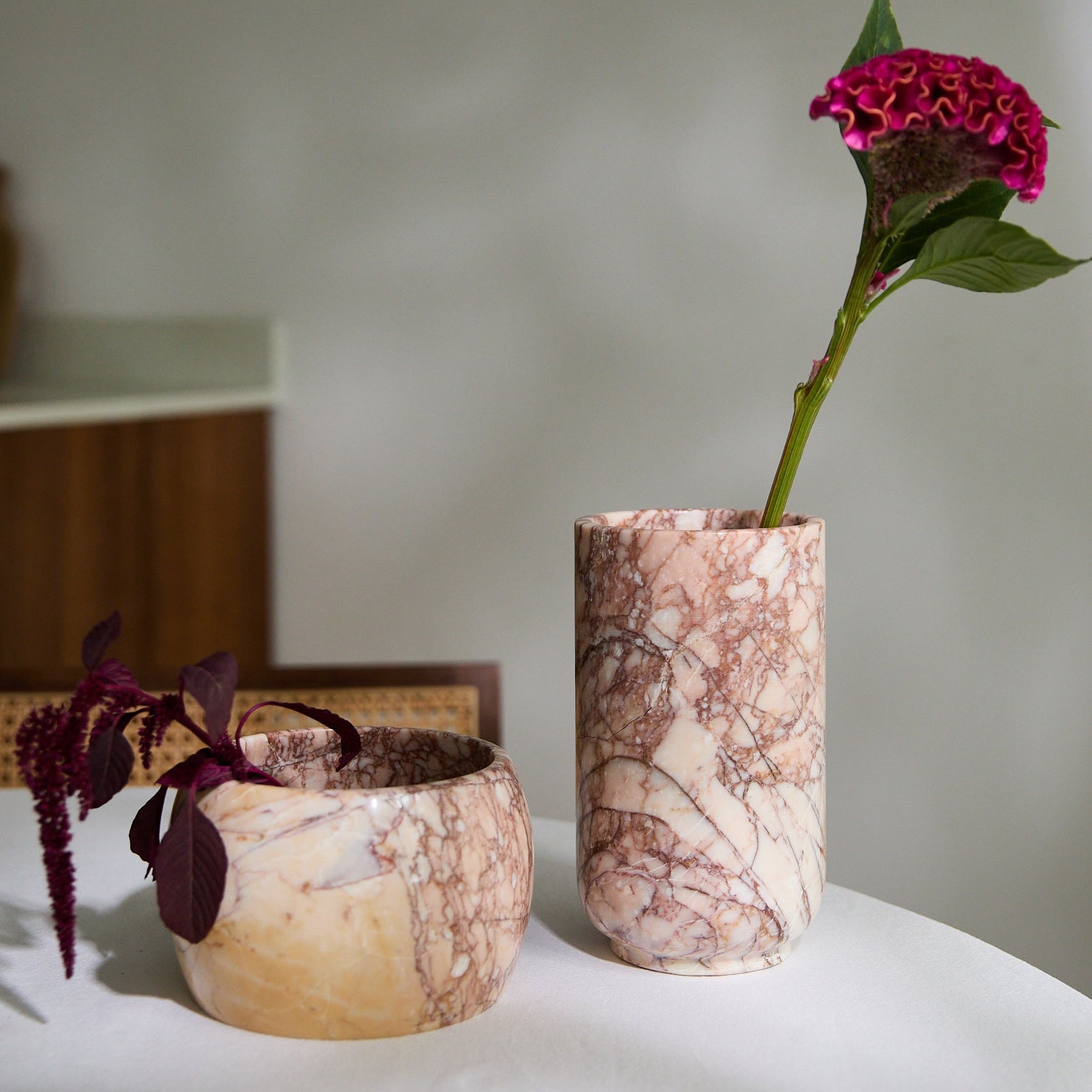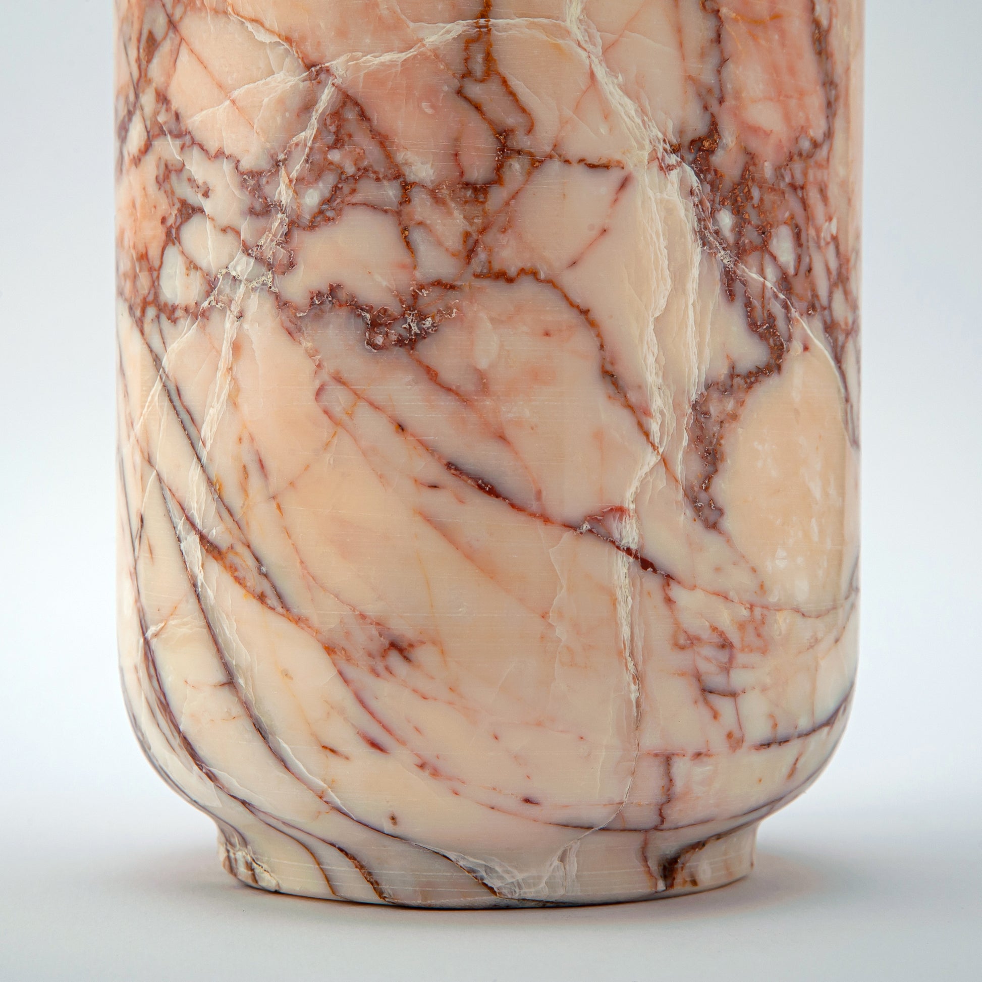 The Rosavita Vase is a one-of-a-kind creation, sculpted from exceptionally rare pink marble with intricate, naturally flowing veins in shades of rose, ivory, and deep crimson. Its surface reveals nature’s artistry in every detail, turning this piece into a timeless statement of elegance and rarity.