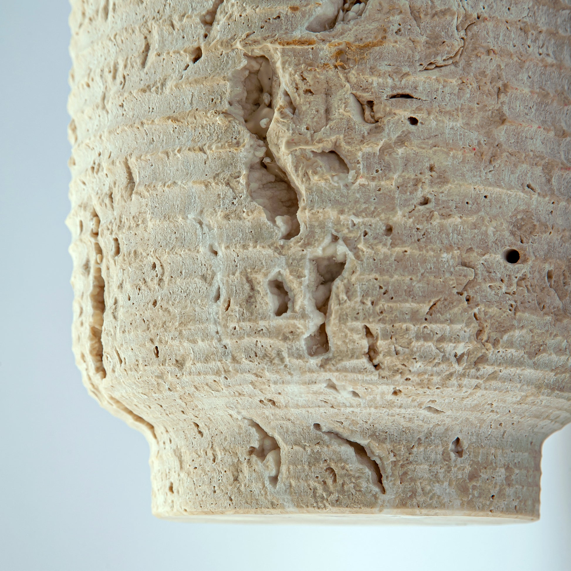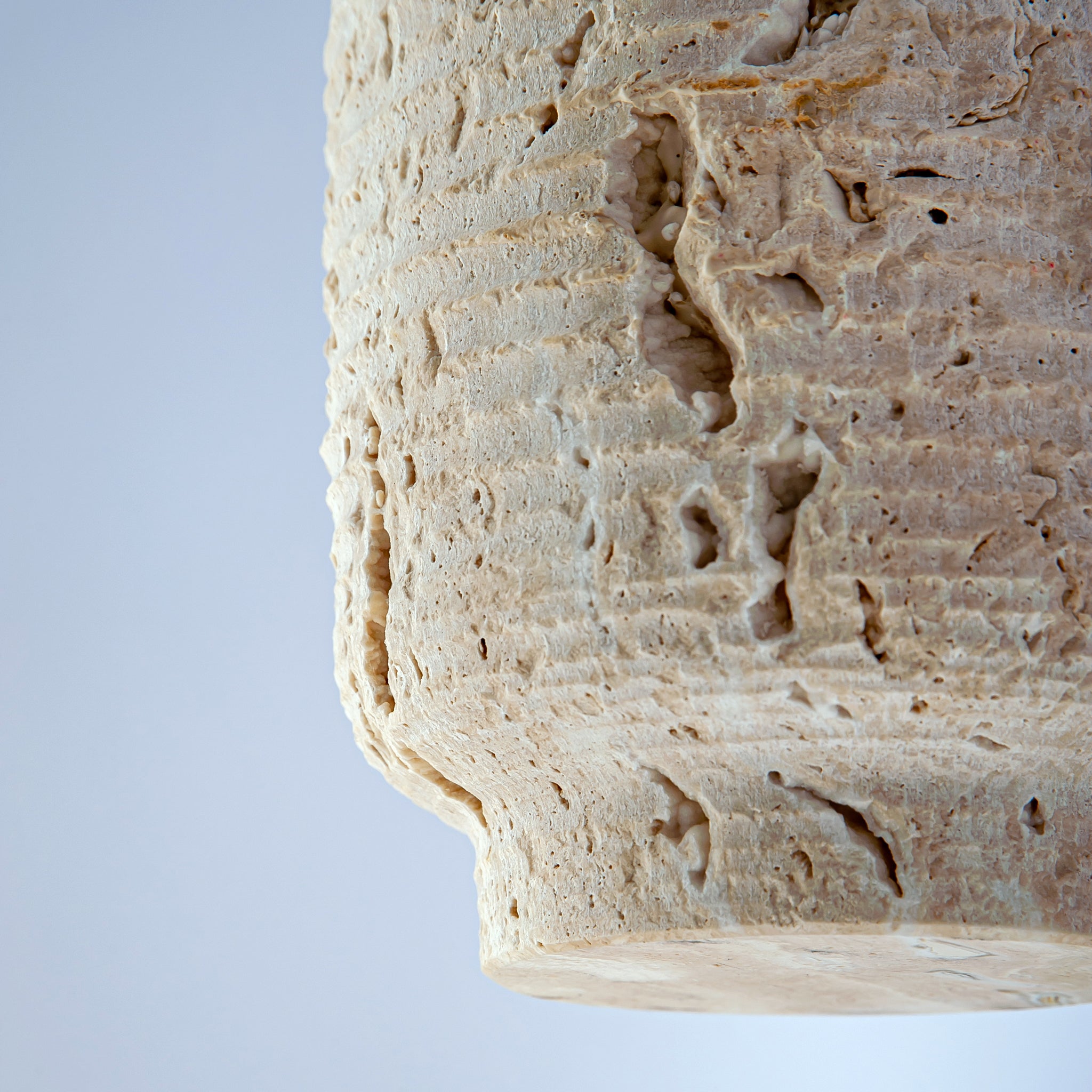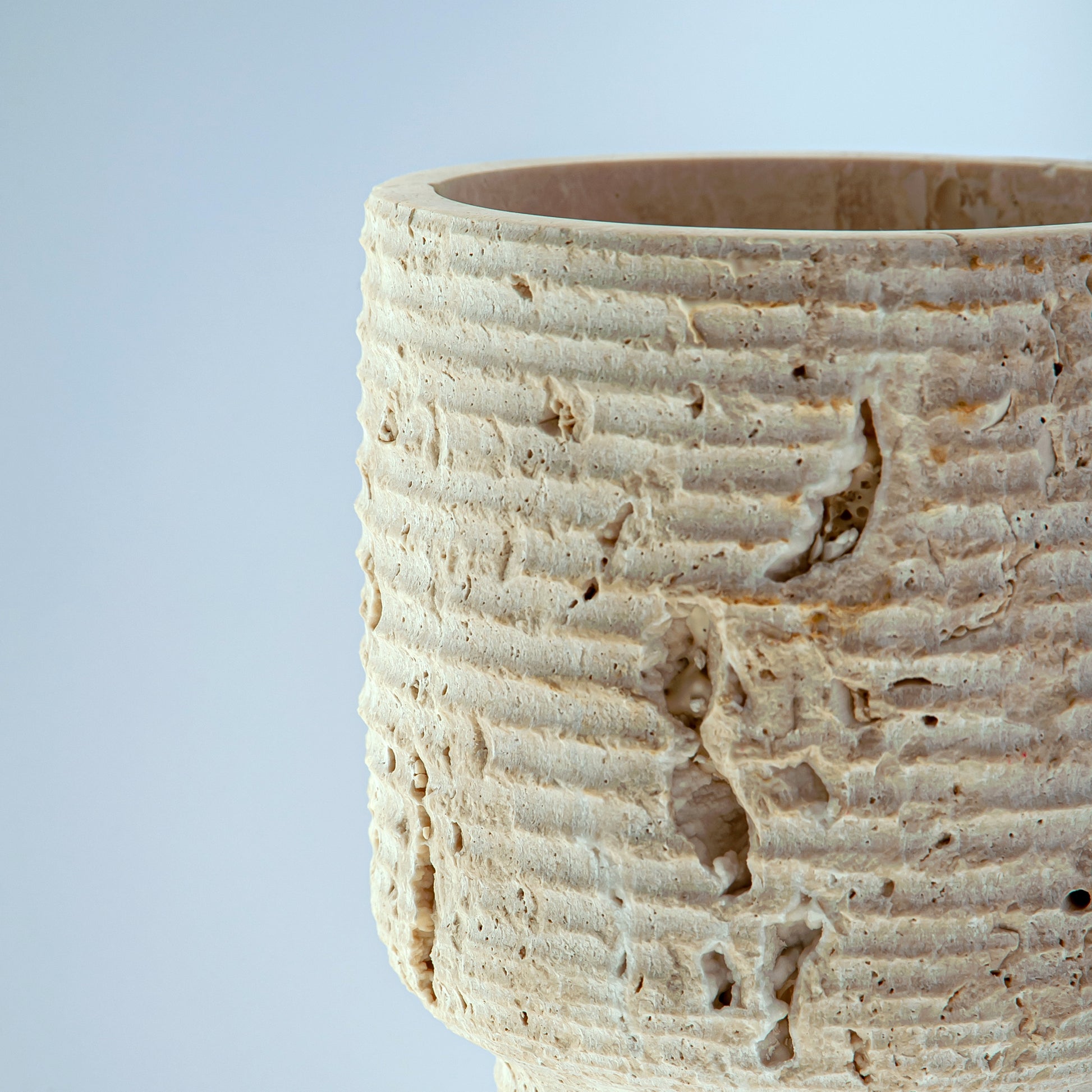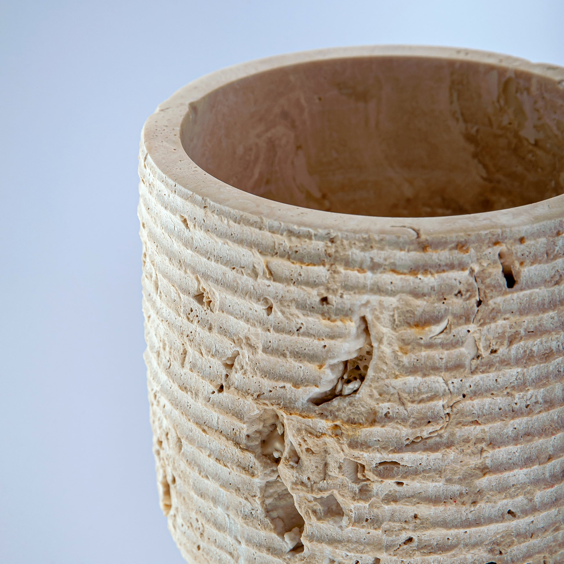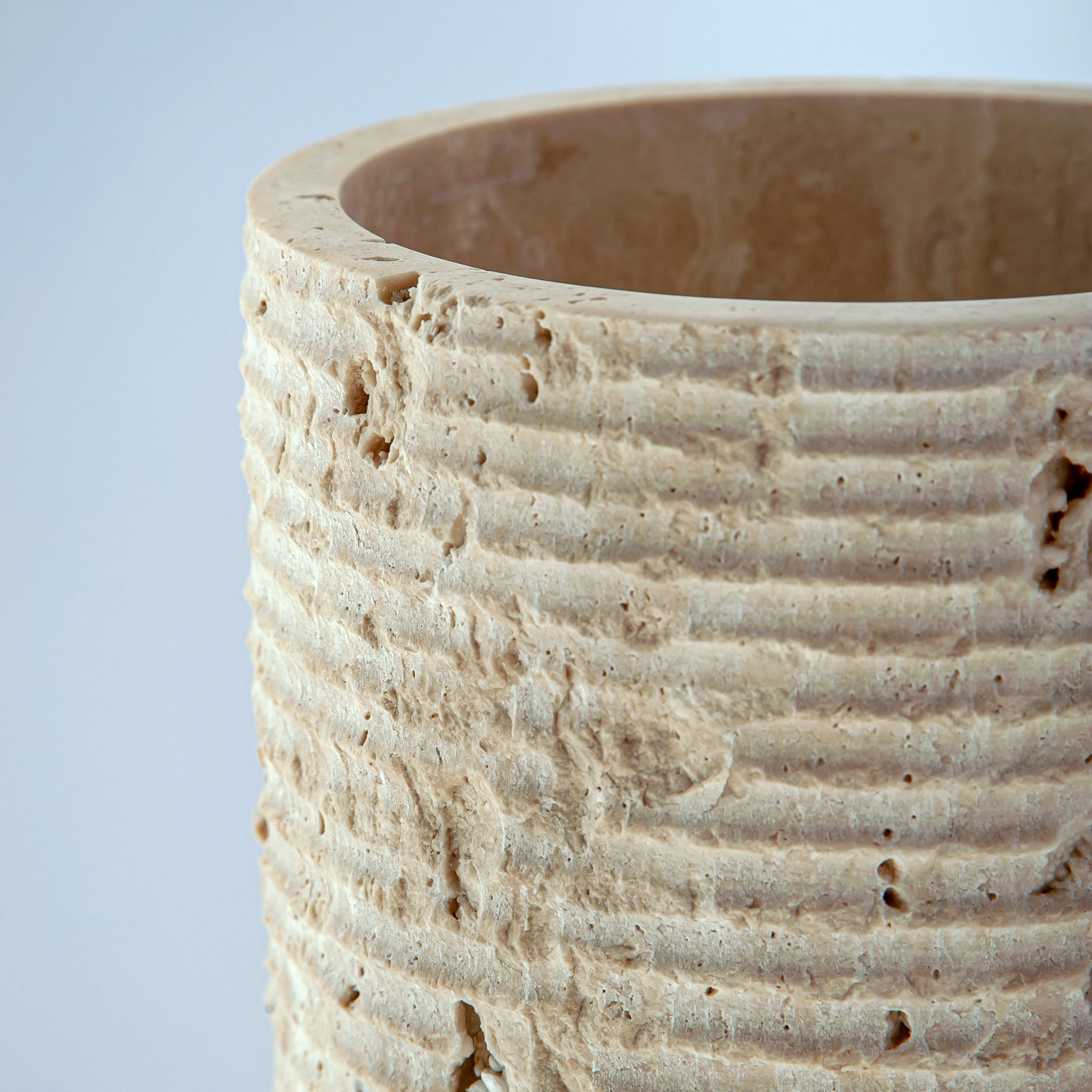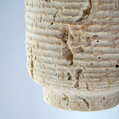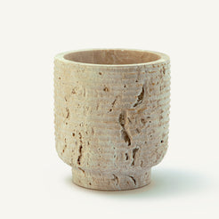Scavo Vase Carved from a rare natural travertine stone in warm, mineral tones, the Scavo Vase reveals the quiet beauty of excavation. Its cylindrical form, softened by an organically textured surface, celebrates the raw character of the material while maintaining a refined architectural presence.