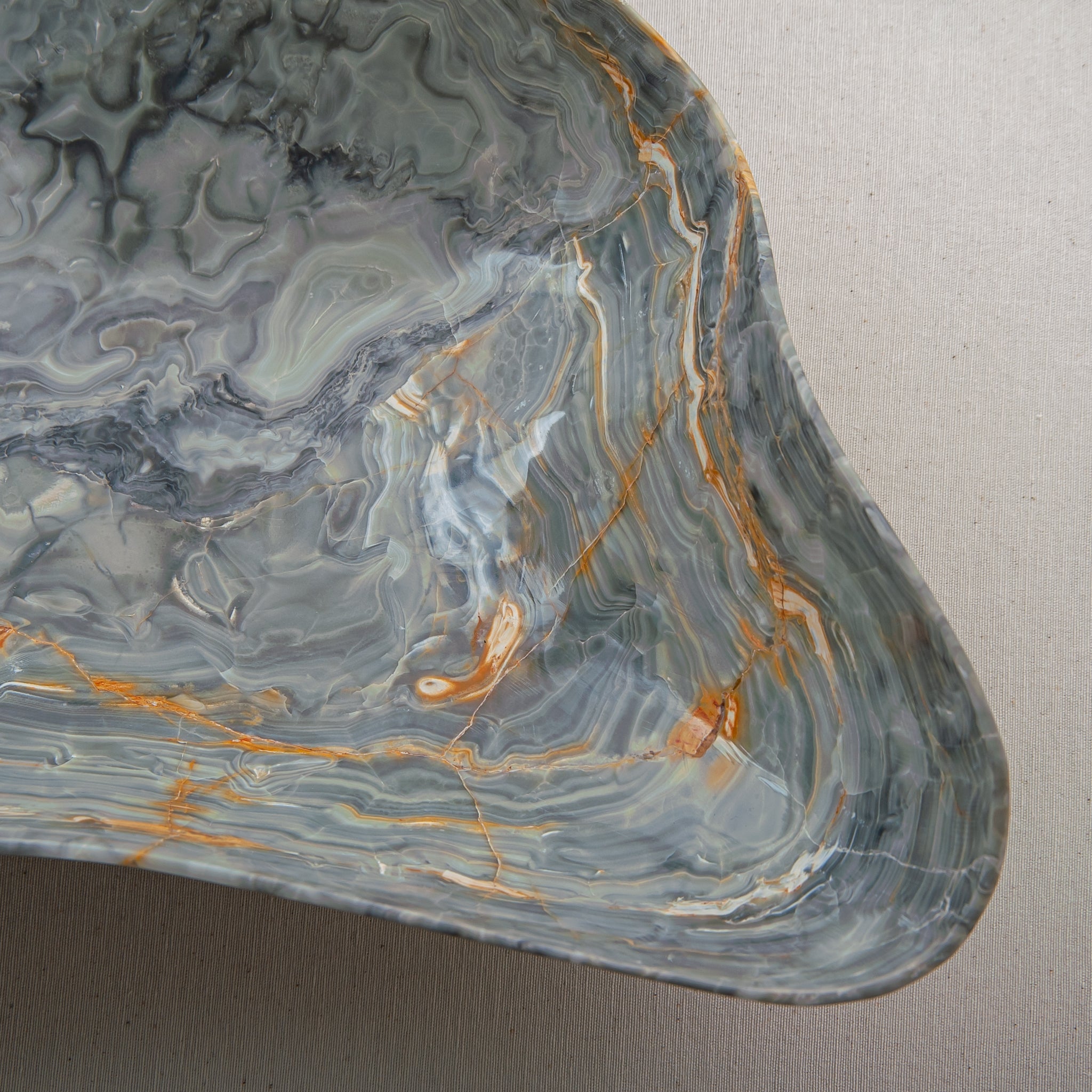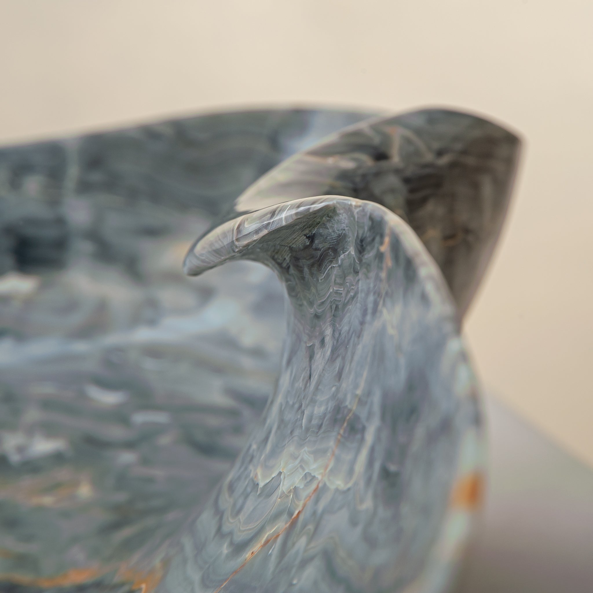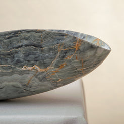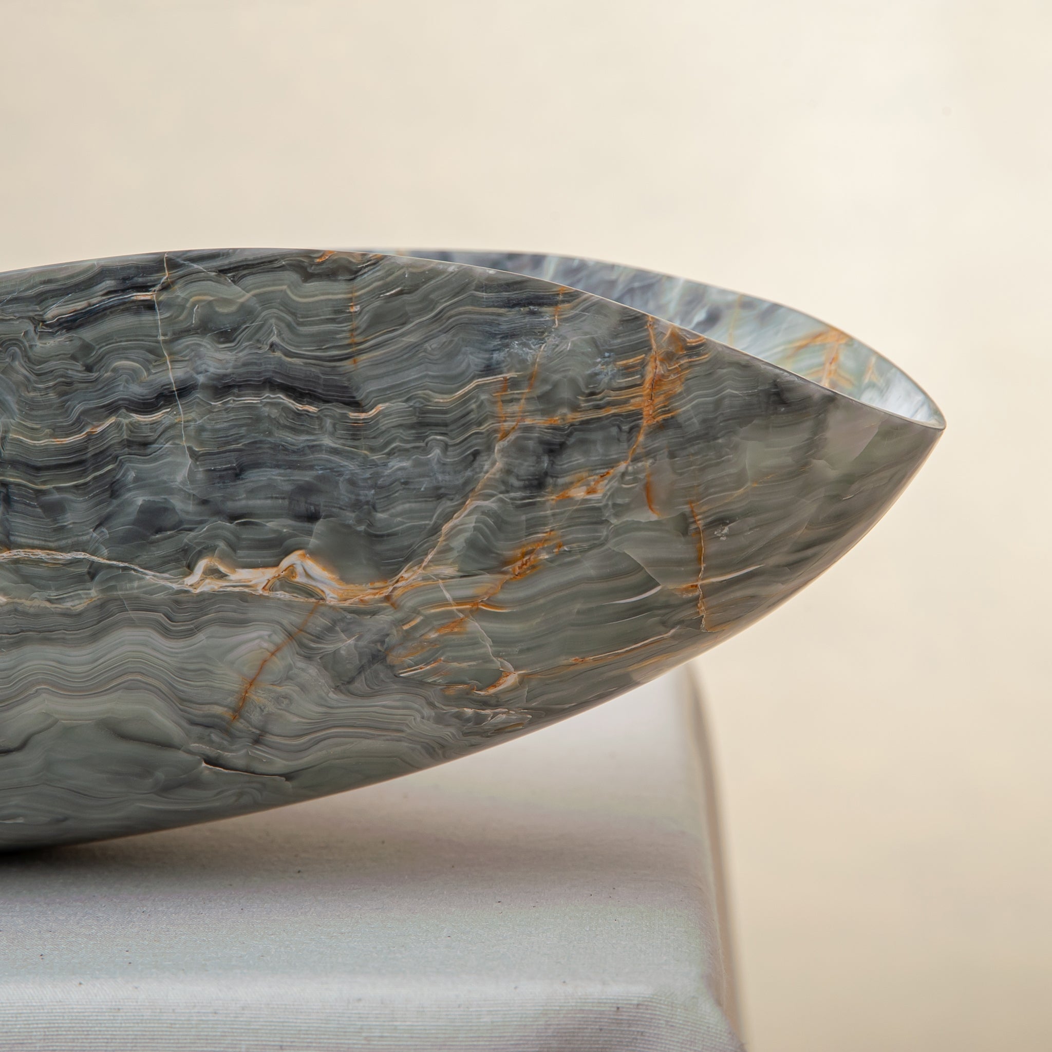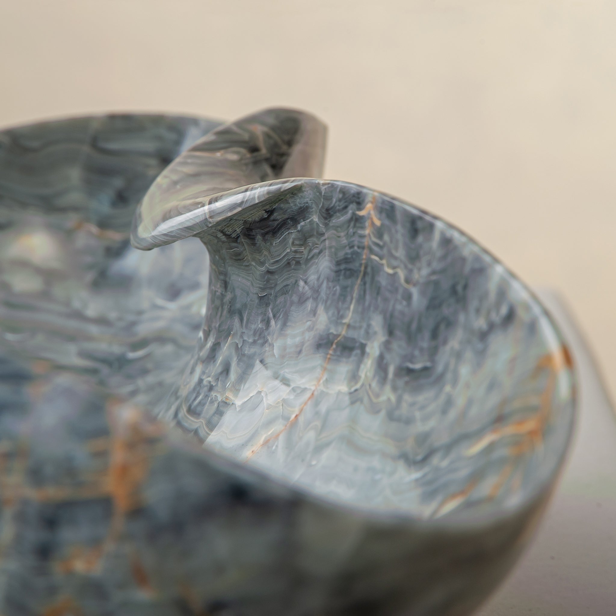 The Scolipto Bowl is a sculptural exploration of movement and form, carved from richly layered onyx. Its fluid silhouette rises and curves with a sense of quiet motion, as if shaped by flowing water rather than tools. Soft gradients of grey and blue are traced with delicate mineral veins, creating depth and visual rhythm across the surface.