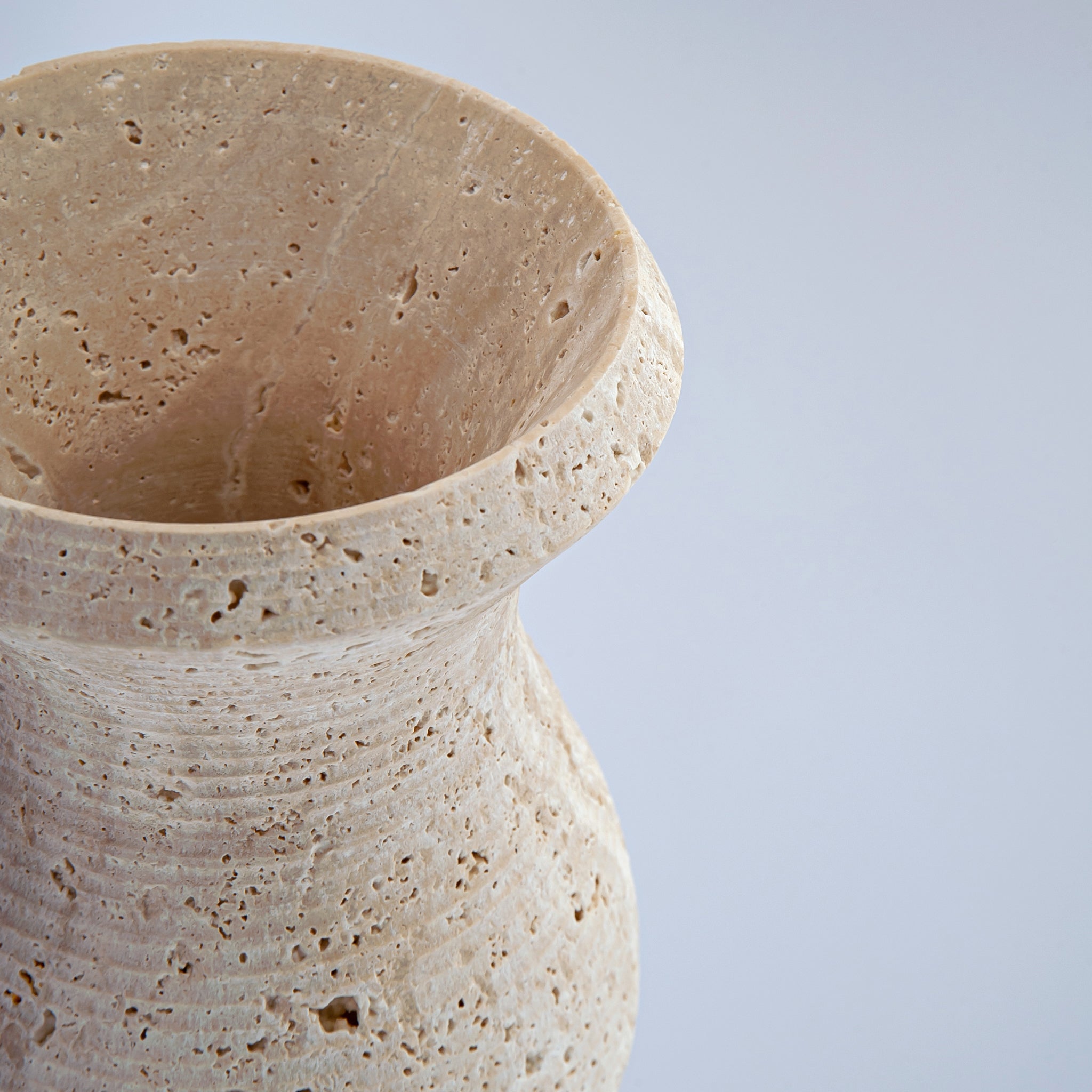 The Selvra Vase embodies organic grace and quiet strength. Hand-carved from natural travertine, its softly curved silhouette highlights the stone’s intricate pores and warm tonal variations, creating a dialogue between form and material.
