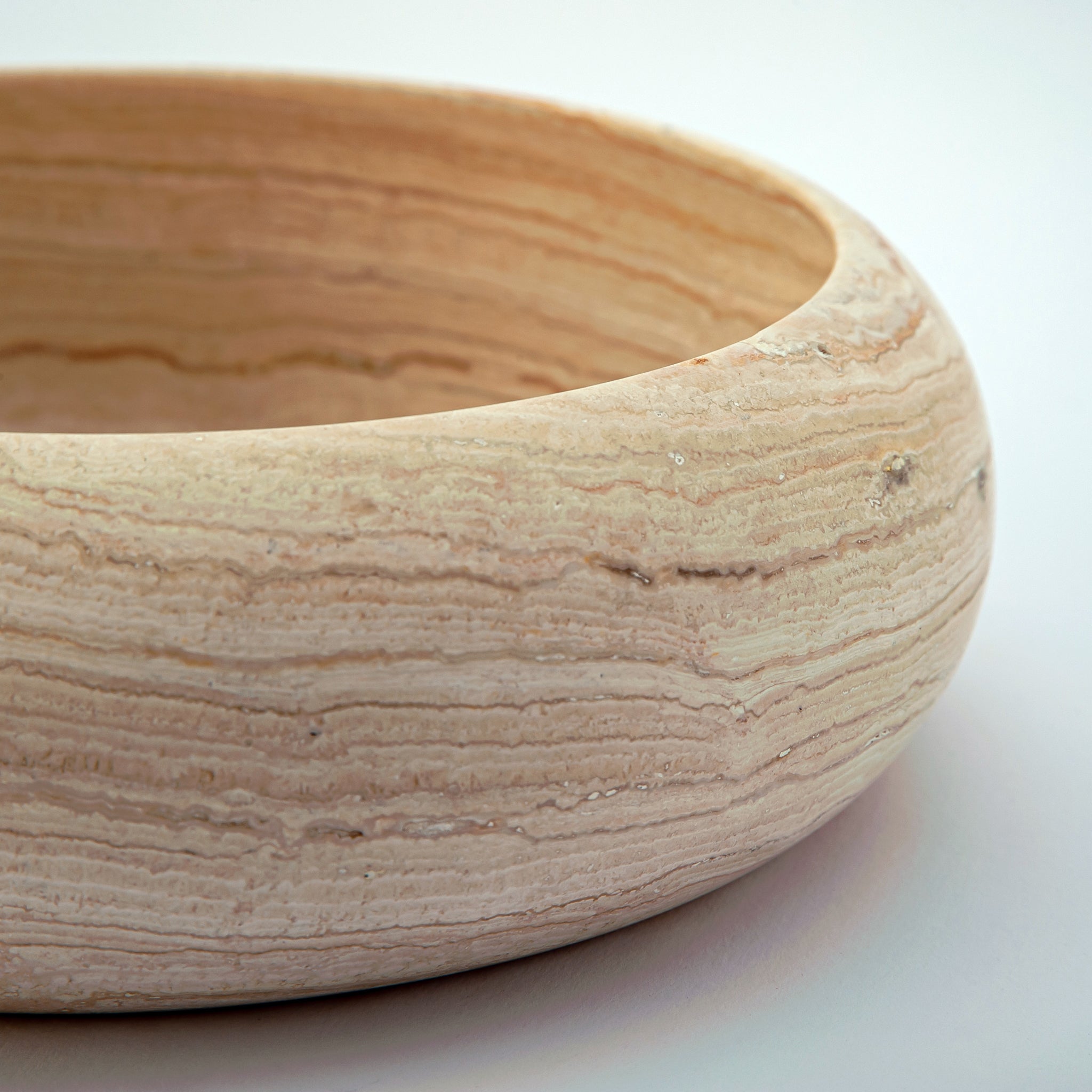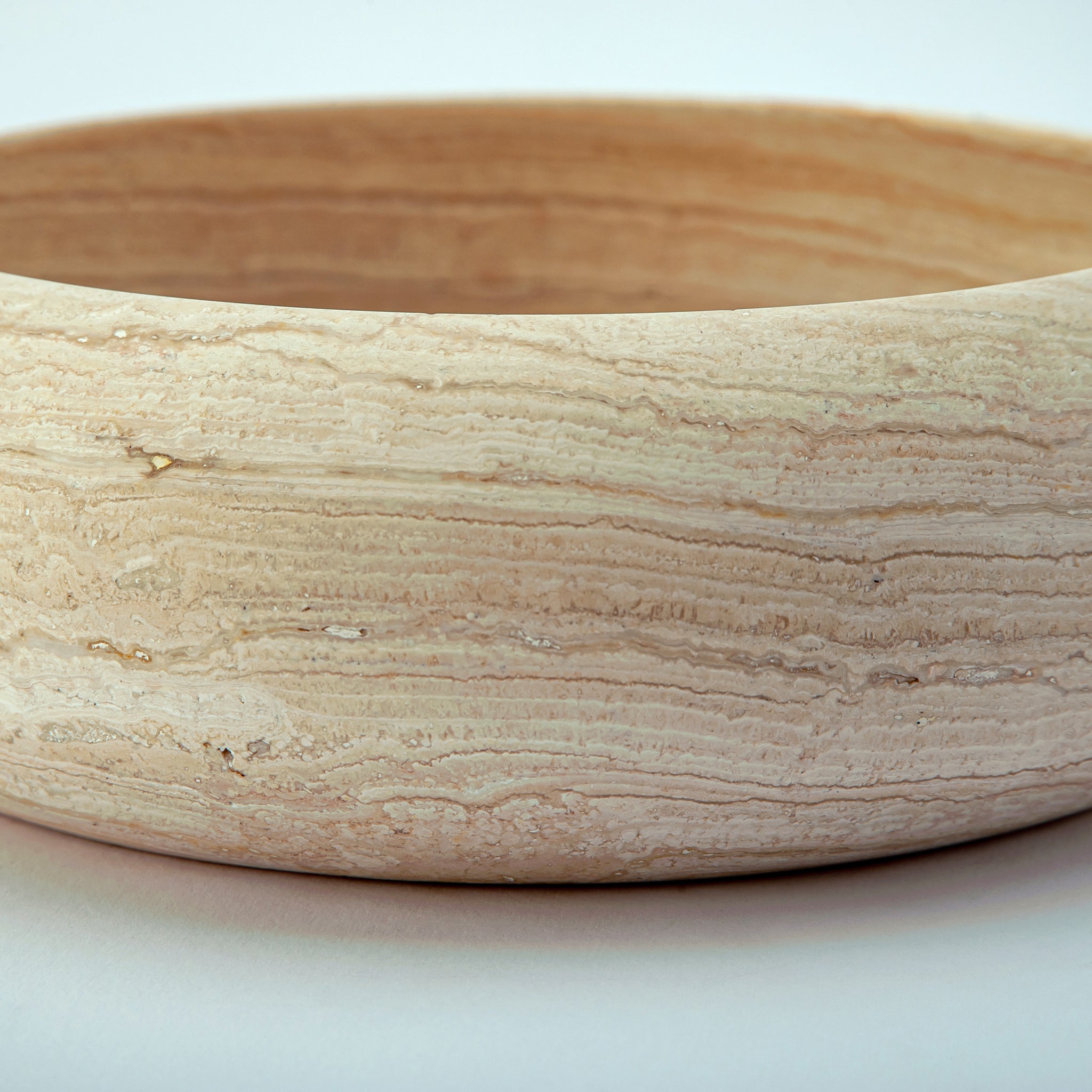 The Serenna bowl embodies quiet equilibrium, a vessel shaped by calm and crafted from the warmth of natural travertine. Its soft, rounded form and horizontal veining reflect the slow rhythm of layered earth, revealing subtle variations in tone and texture that speak to time and touch.
