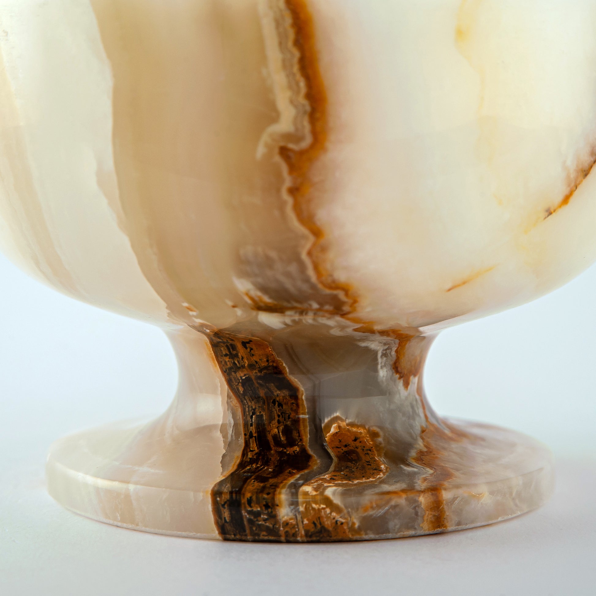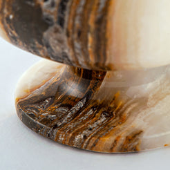 Skia Bowl is a one-of-a-kind piece carved from luminous onyx, where soft ivory surfaces meet deep brown and charcoal veining.