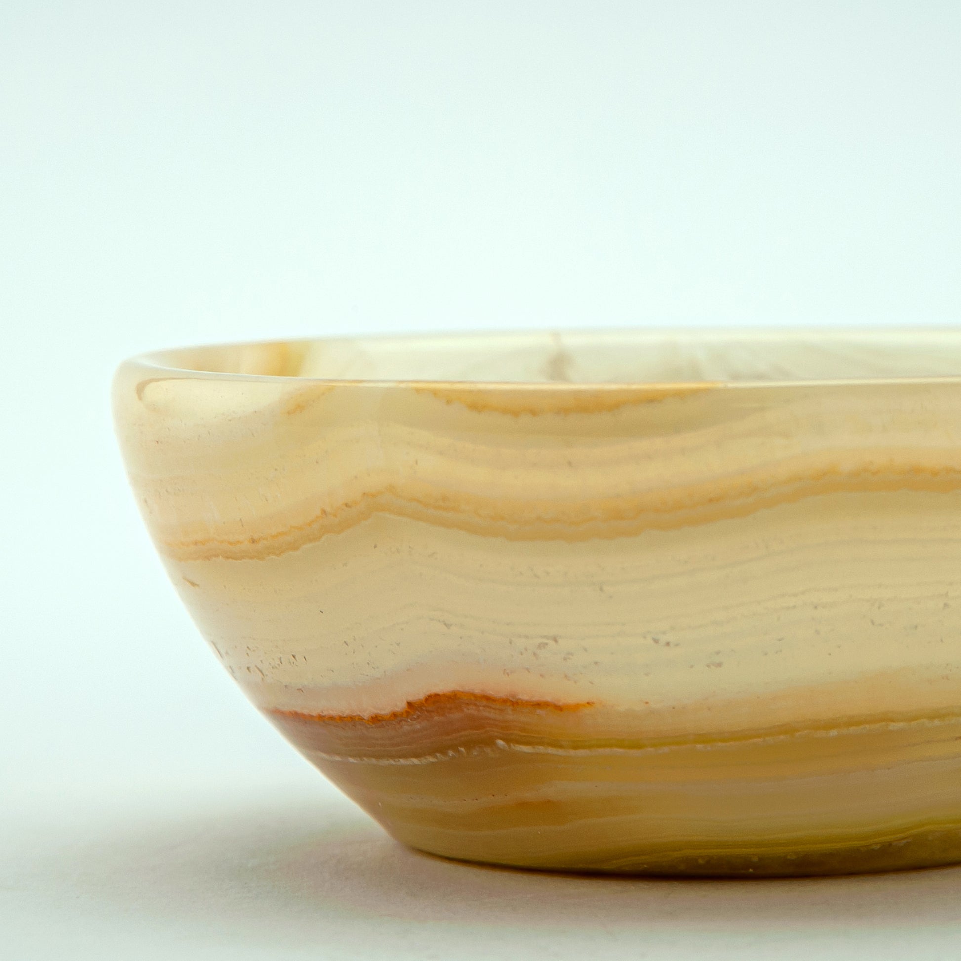 Stratanis Bowl is a one-of-a-kind piece carved from softly layered onyx in warm cream, sand, and honey tones.