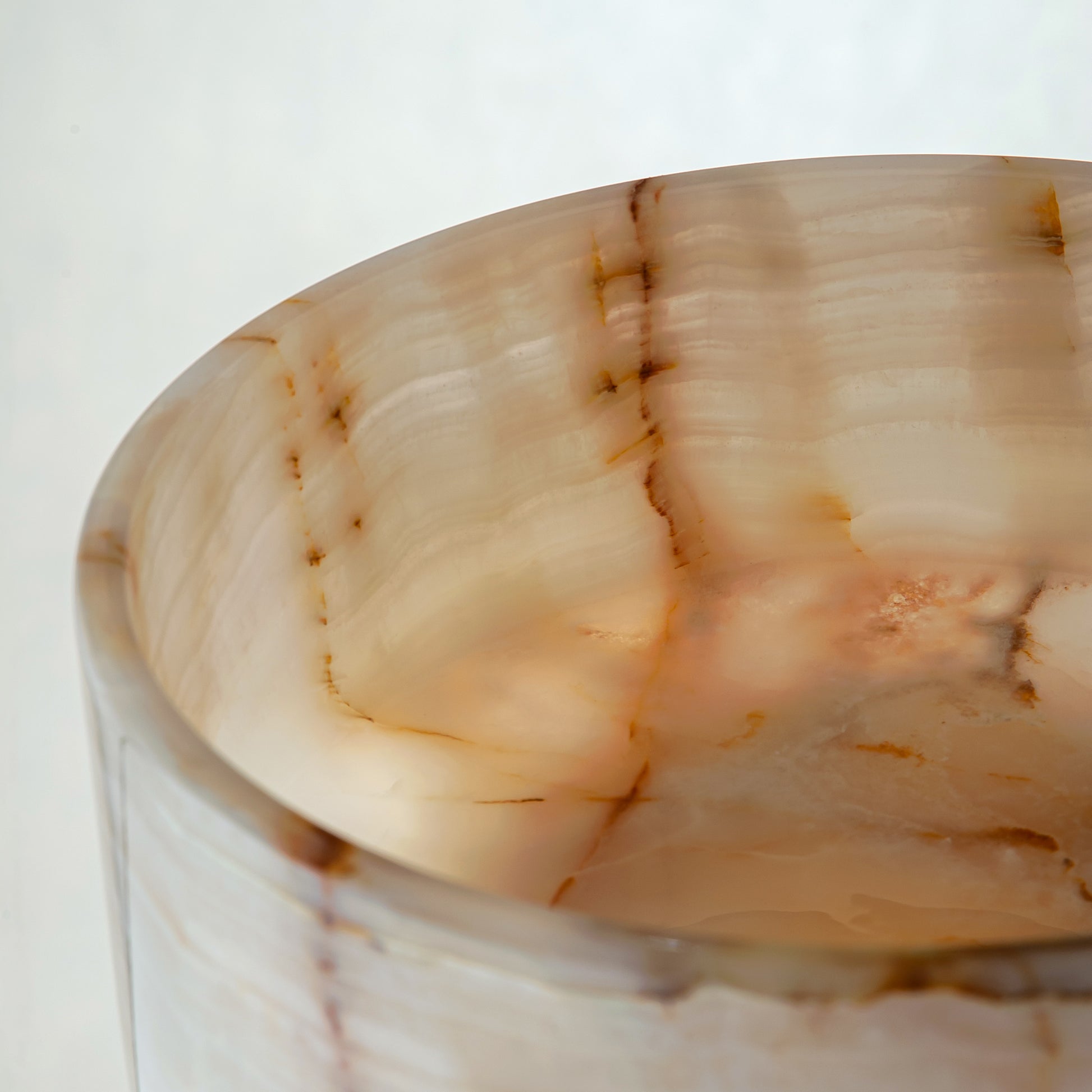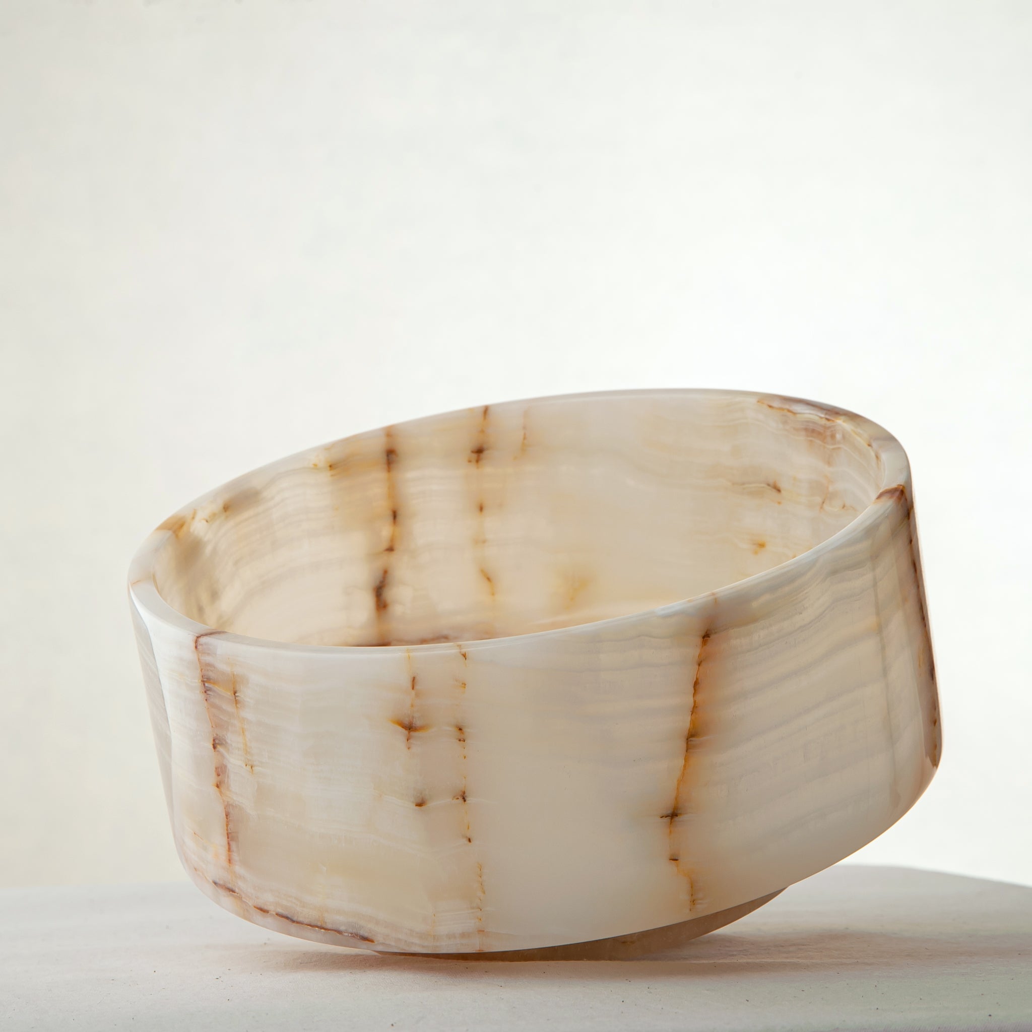 Elevated on a gently rounded base, the bowl appears to float, lending a sense of calm balance and understated refinement. When sunlight or candlelight touches its surface, the onyx glows from within, revealing subtle shifts in color that make each piece truly one-of-a-kind.