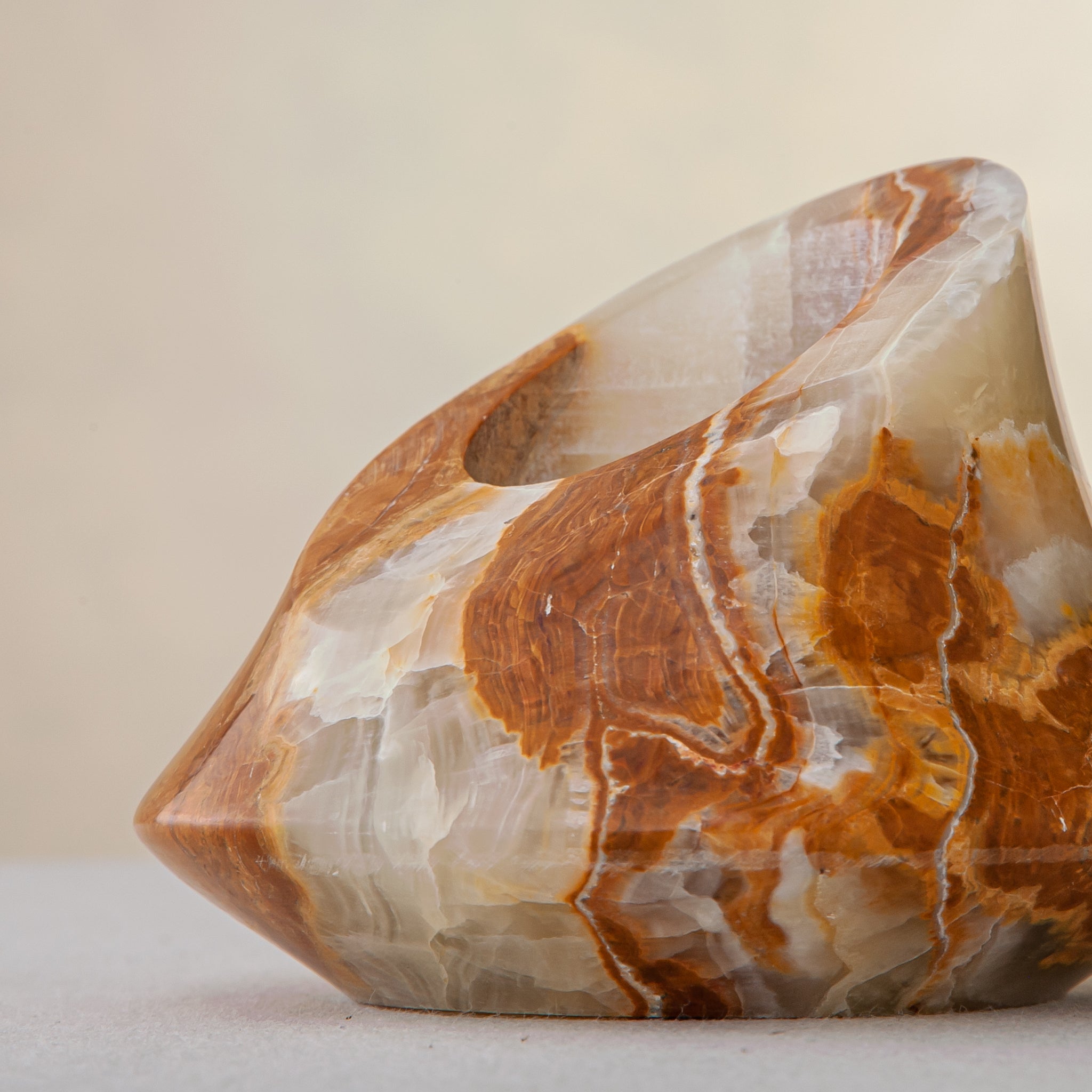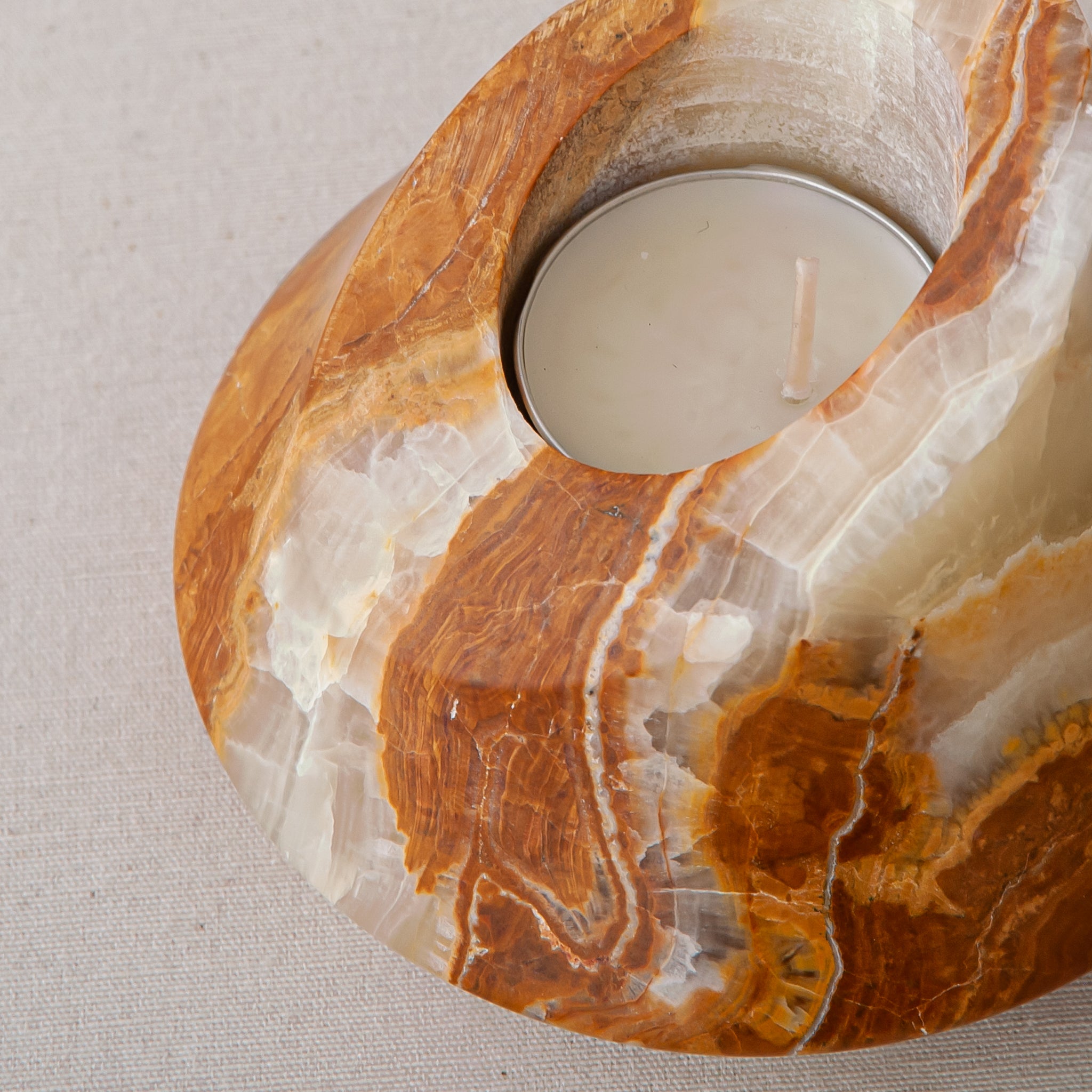 The Theros Candle Holder is a sculptural object carved from rare onyx stone, distinguished by its rich amber tones and striking natural veining. Handcrafted in our atelier, each piece is shaped and finished by hand, revealing fluid patterns, soft translucency, and a luminous depth that makes every holder entirely unique.