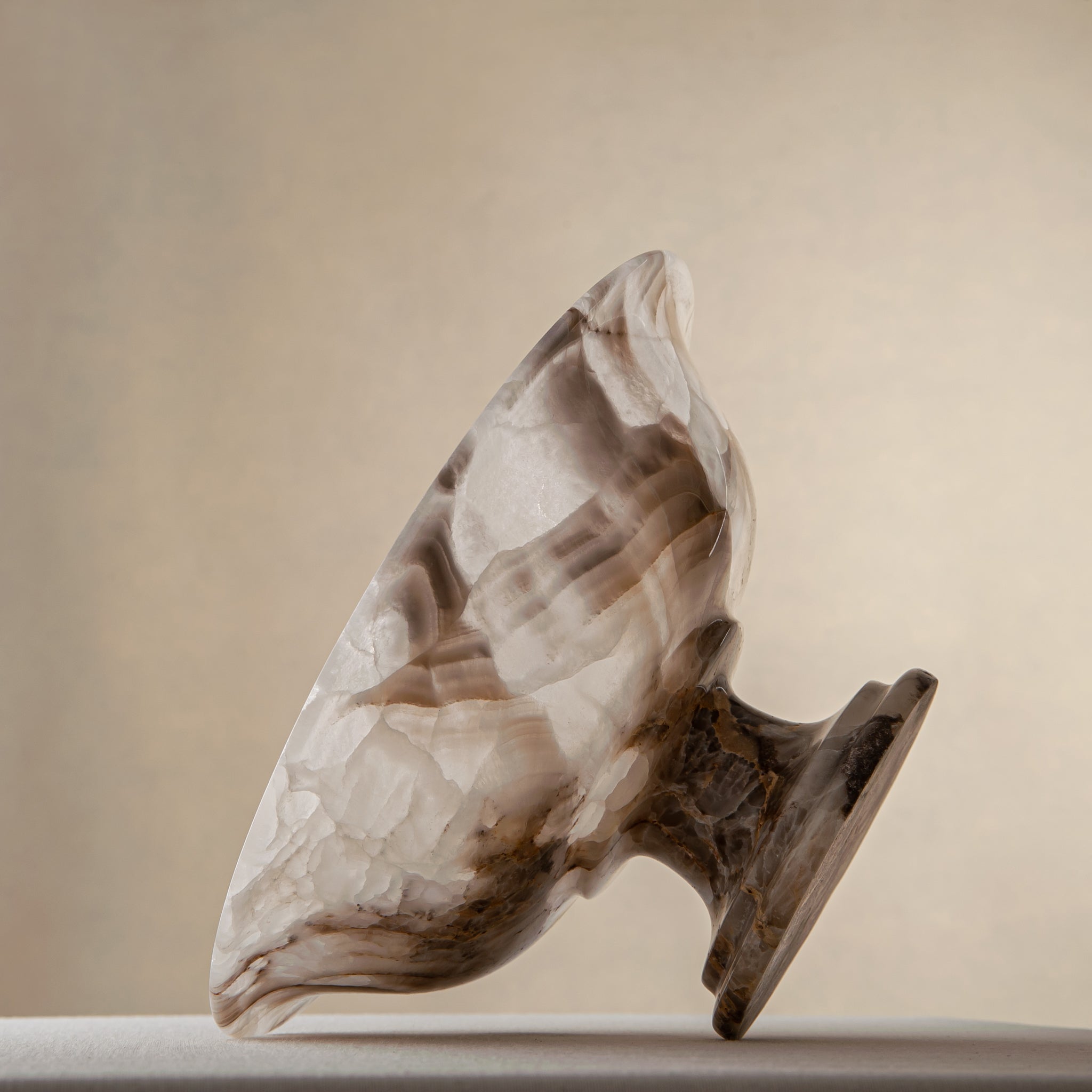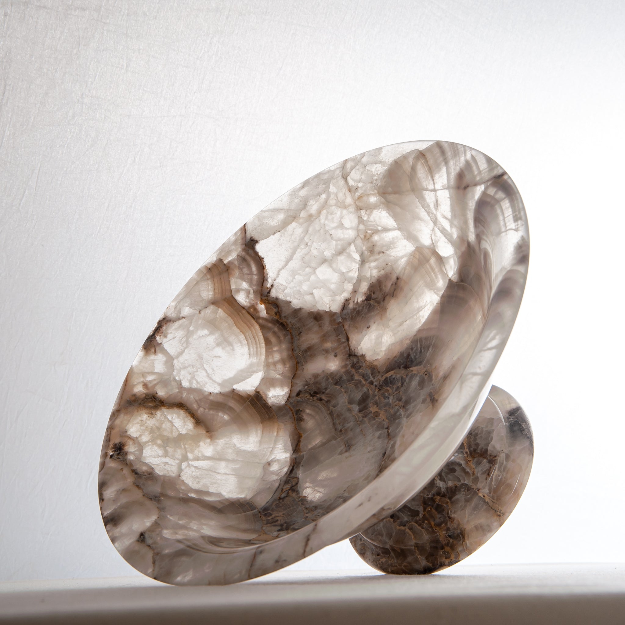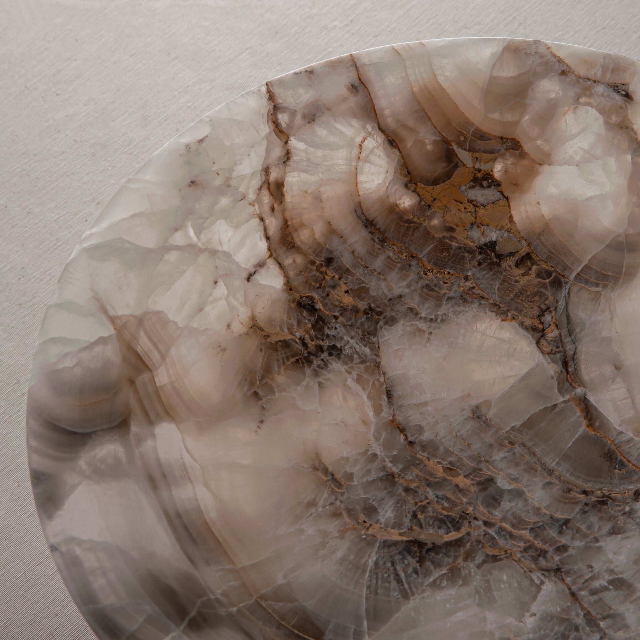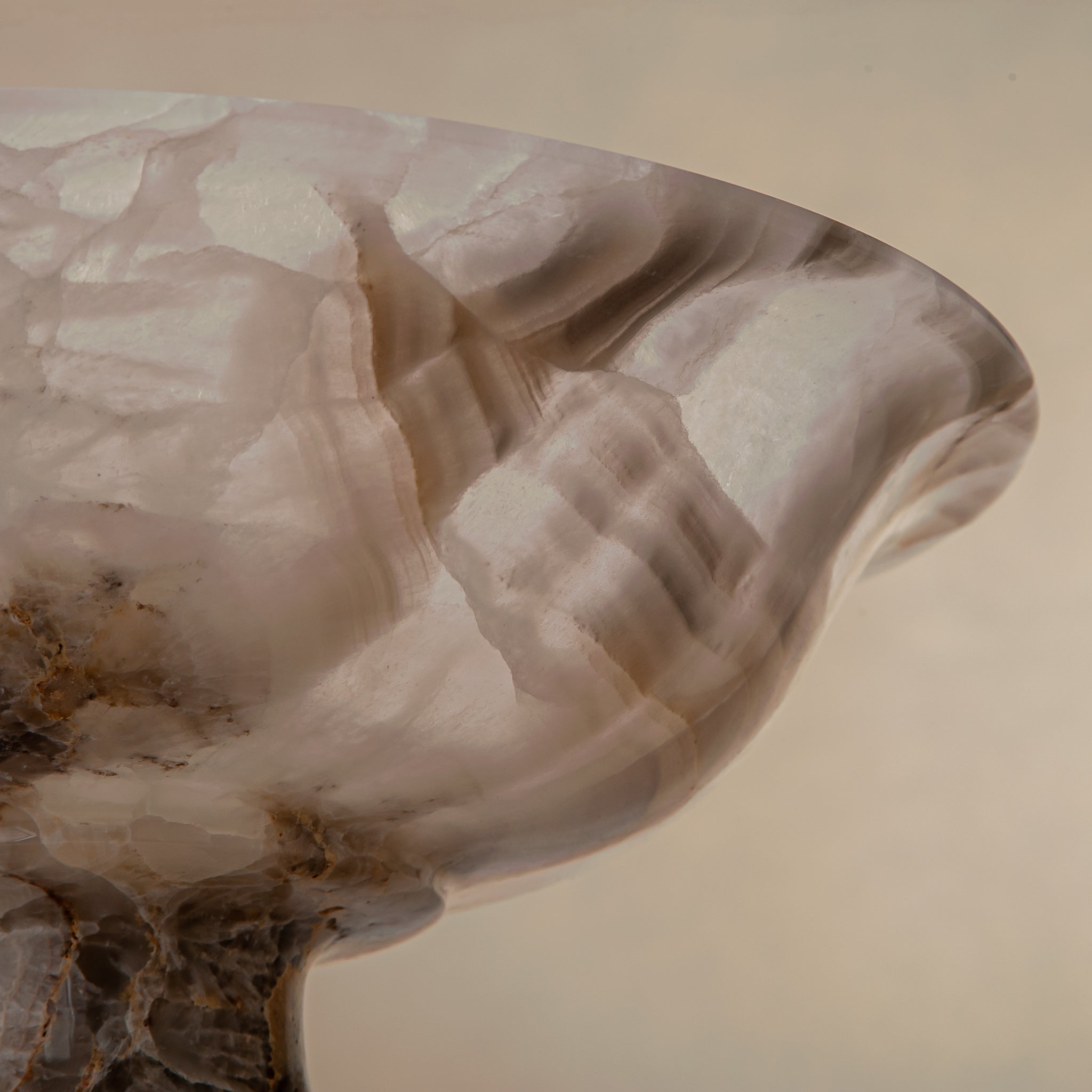 The Valen Bowl is a one-of-one sculptural object, handcrafted in our atelier from an exceptionally rare natural onyx. Cut from a single, slender section of stone, its thin, refined profile enhances the material’s natural translucency, allowing soft ivory and warm amber tones to subtly interact with the light.