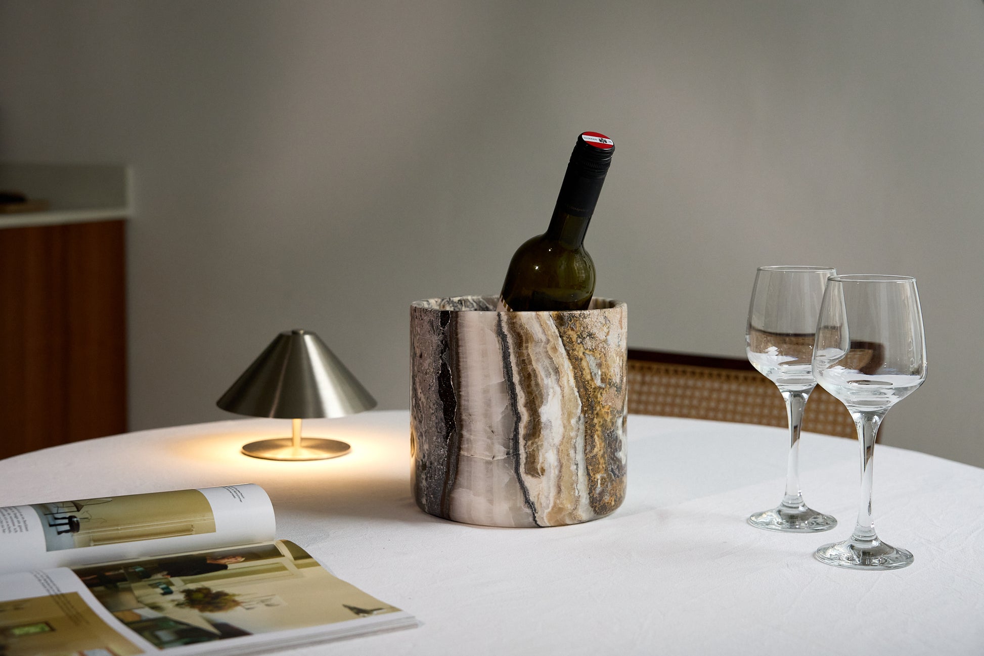 The Varros Bottle Cooler captures the quiet power of natural onyx, a composition of deep umber, soft grey, and ivory layers flowing together in organic rhythm. Each piece is sculpted from a single block of stone, revealing intricate veining and textures shaped by time.
