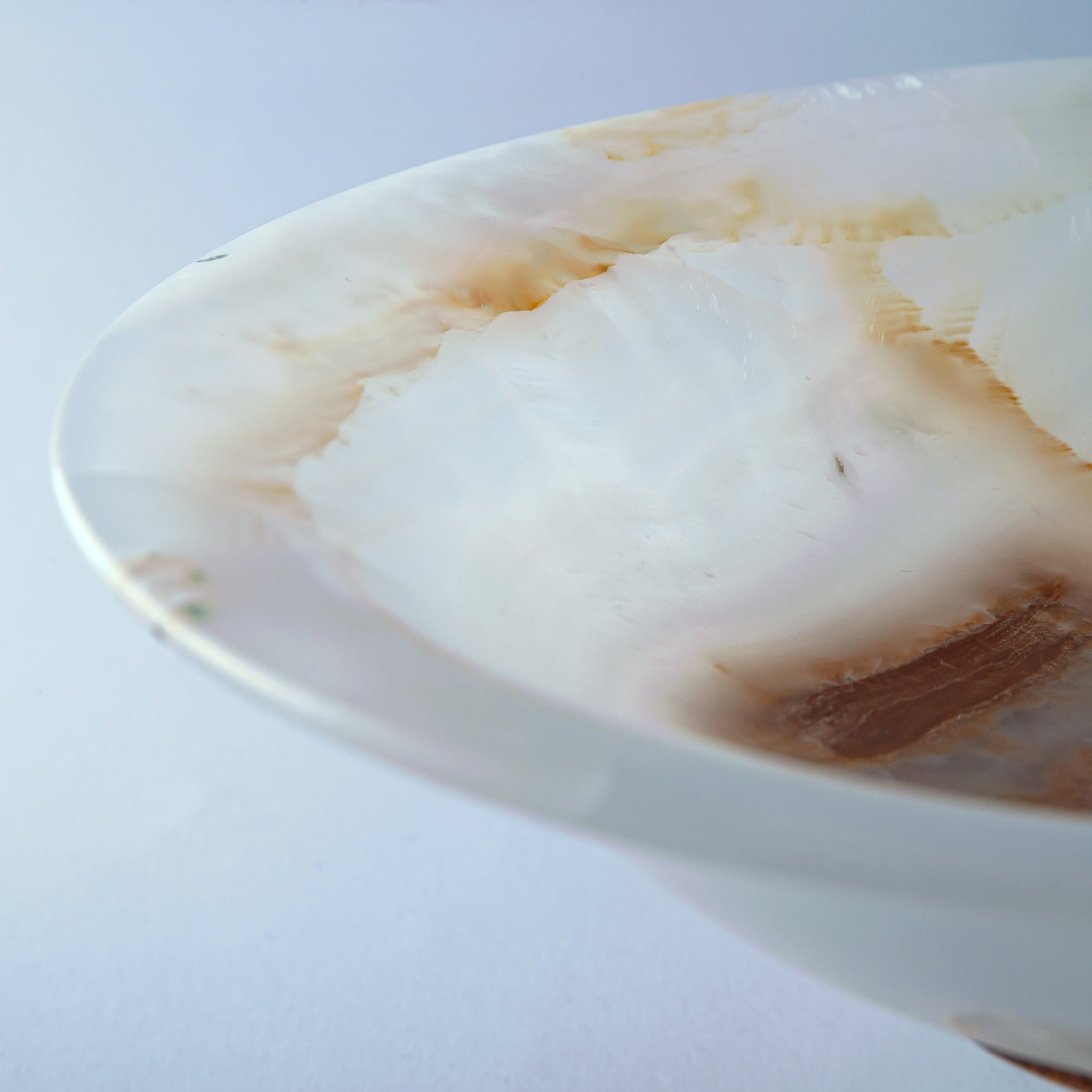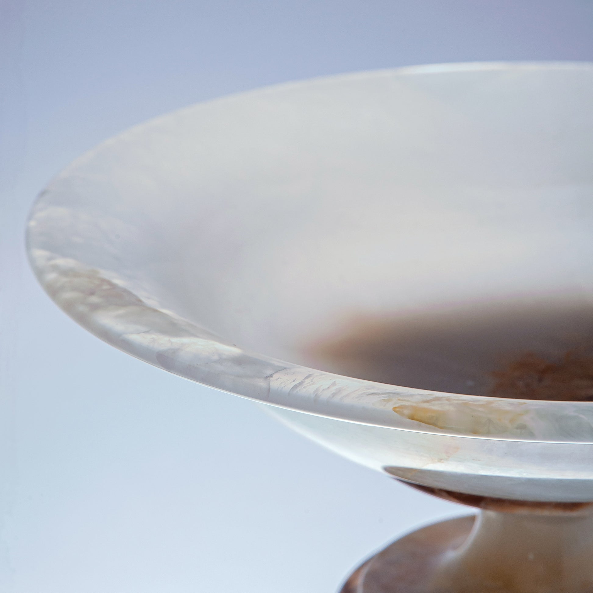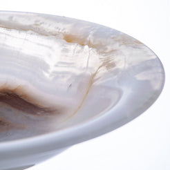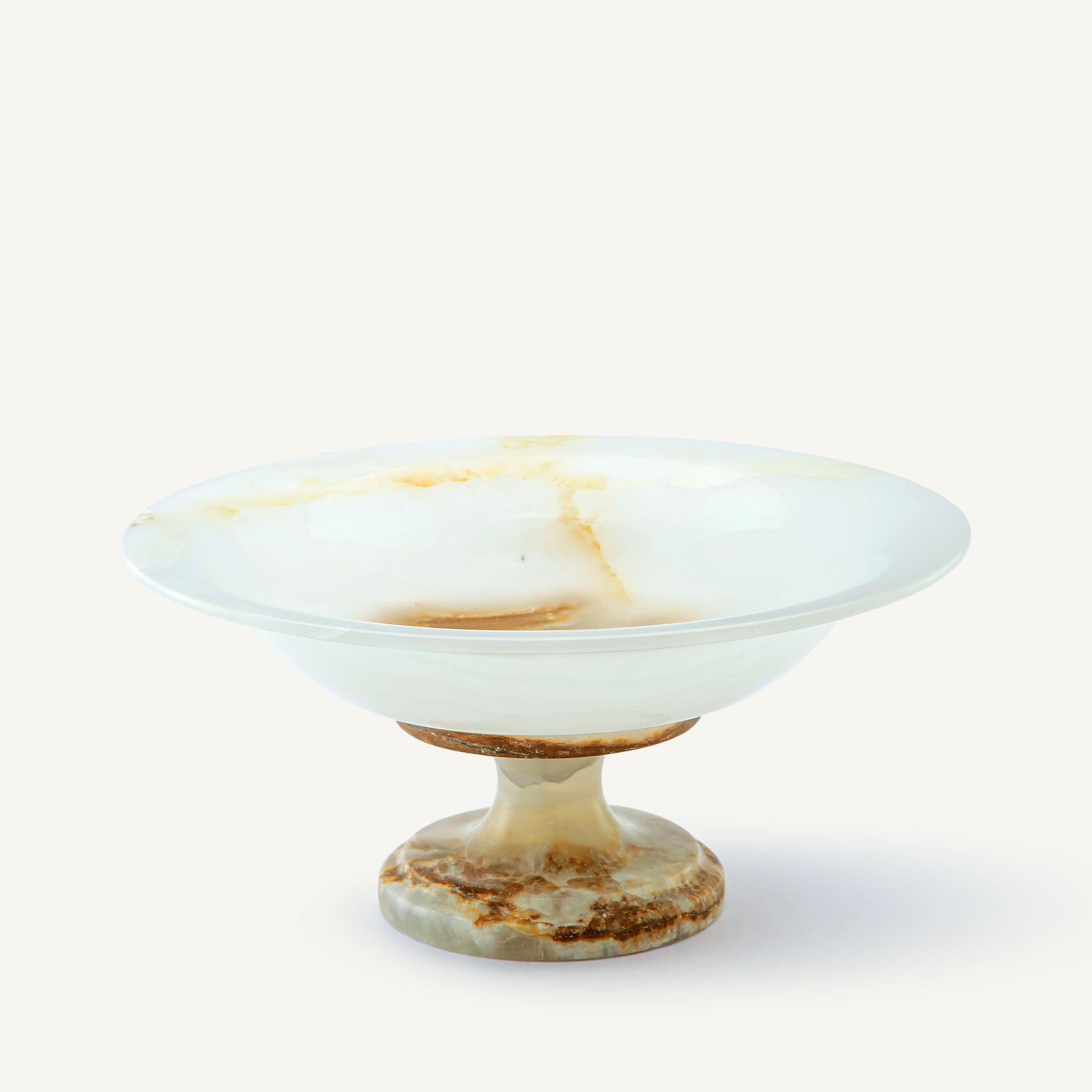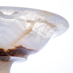 Vasio Bowl Carved from a rare onyx stone, the Vasio Bowl reveals soft milky white tones traced with warm honey and amber veining, formed by nature over centuries. Its wide, shallow silhouette rests on a sculptural pedestal base, creating a balanced dialogue between strength and refinement.