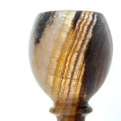 The Vassilo candle holder evokes the quiet dignity of an ancient vessel, reimagined in warm, banded onyx. Its chalice-like silhouette rises with gentle curvature, revealing layers of caramel, honey, and deep shadow that flow naturally through the stone.