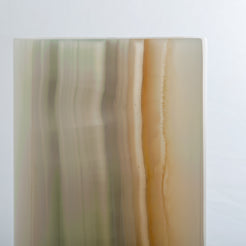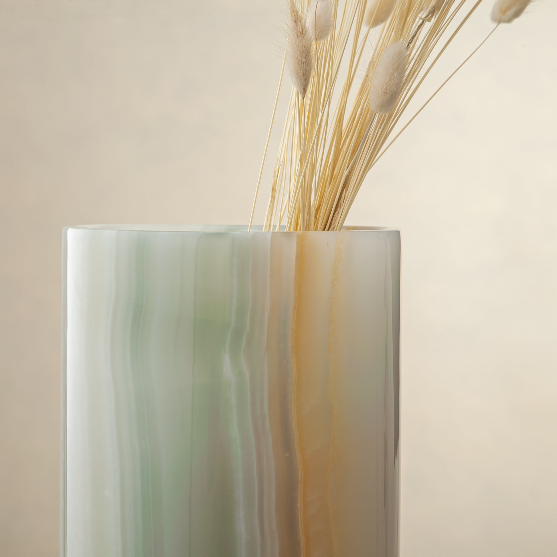 Handcrafted in our atelier from a rare natural stone, the Velario Vase is a one-of-a-kind piece. Soft tones of milky ivory, pale green, and warm amber flow through the stone’s natural veining, creating a translucent, layered effect. Its pure cylindrical form highlights the material’s quiet depth and elegance. No two pieces are ever the same — this vase exists as a singular object, owned by you alone.