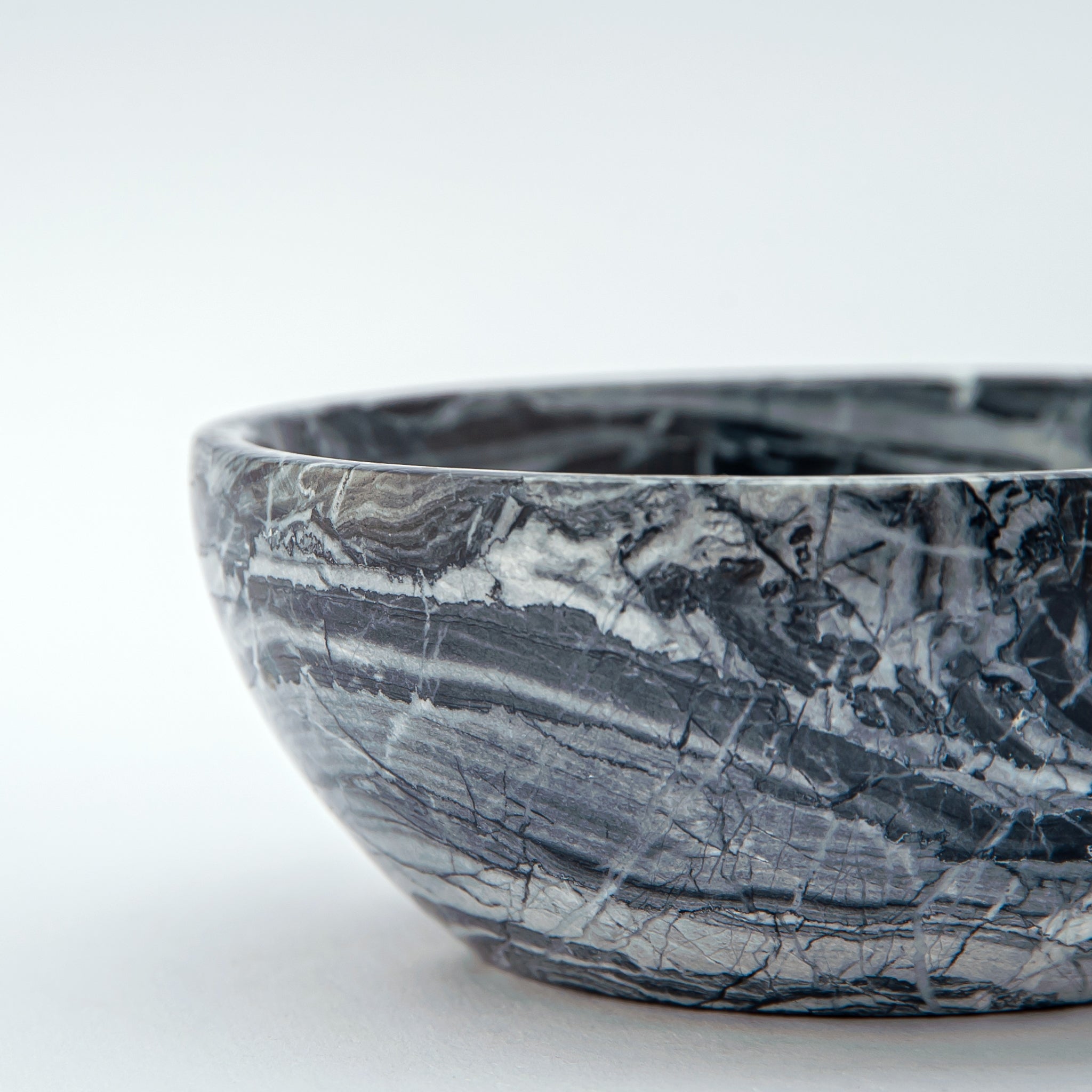 Vena Nera Bowl is a one-of-a-kind piece carved from dark marble, defined by bold white veining that cuts through deep charcoal and graphite tones.