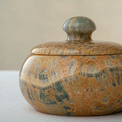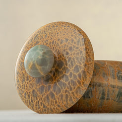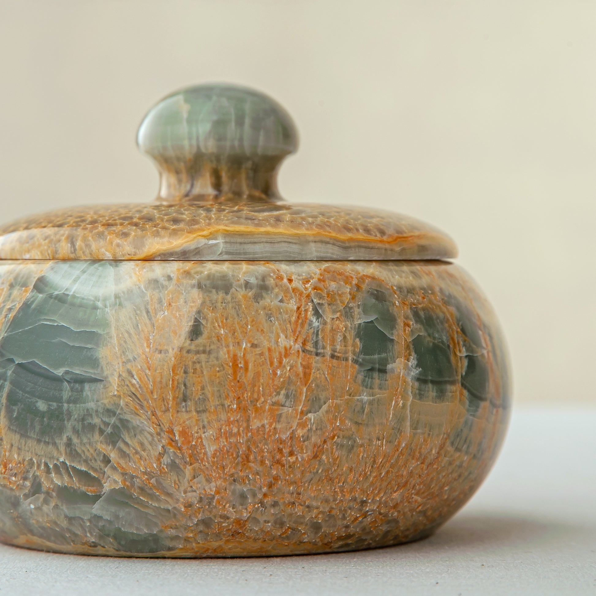 The Virexon Jar is sculpted from a rare variety of onyx, distinguished by its deep green undertones and warm amber veining that move organically across the surface. The stone’s natural translucency and layered structure give the piece a quiet depth, revealing new details as light shifts around it.