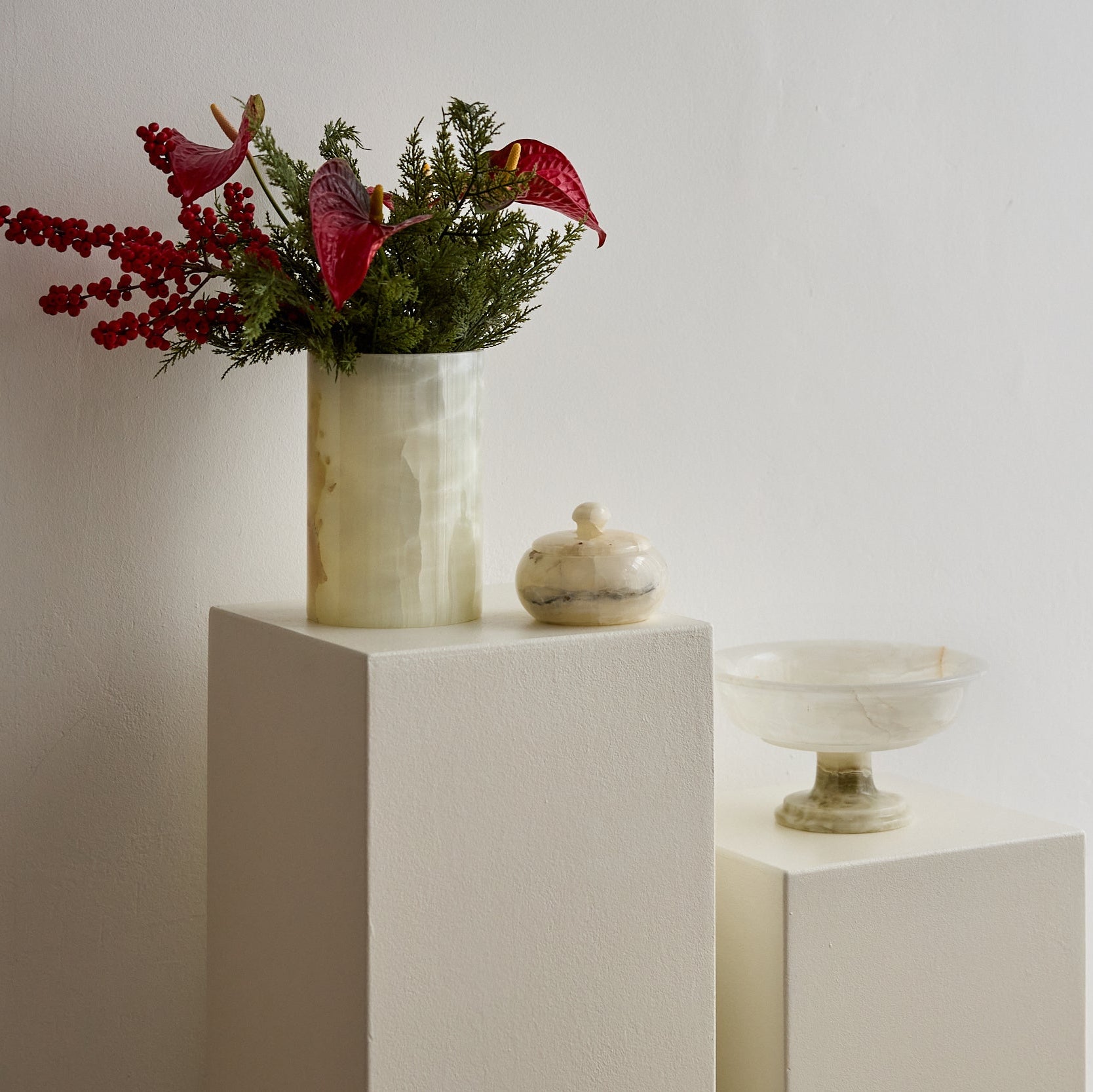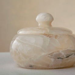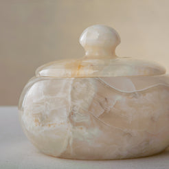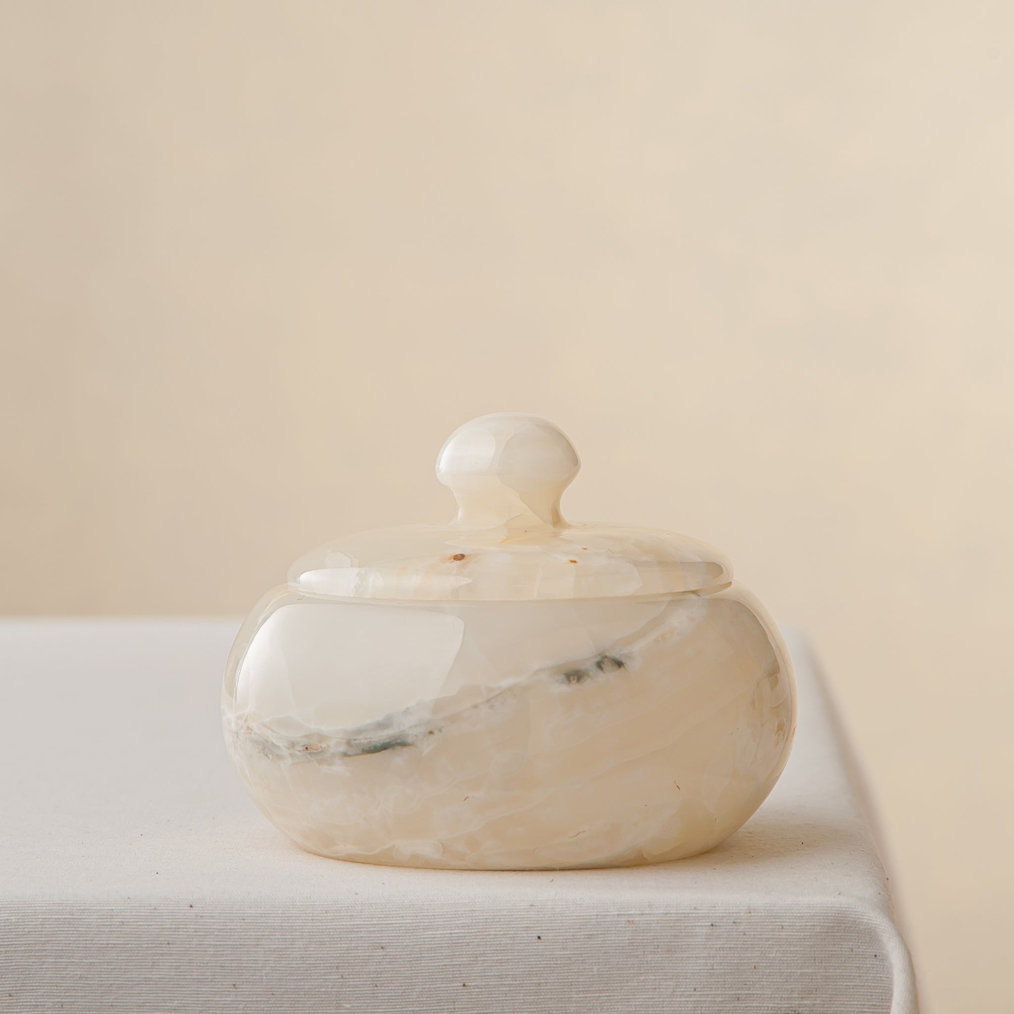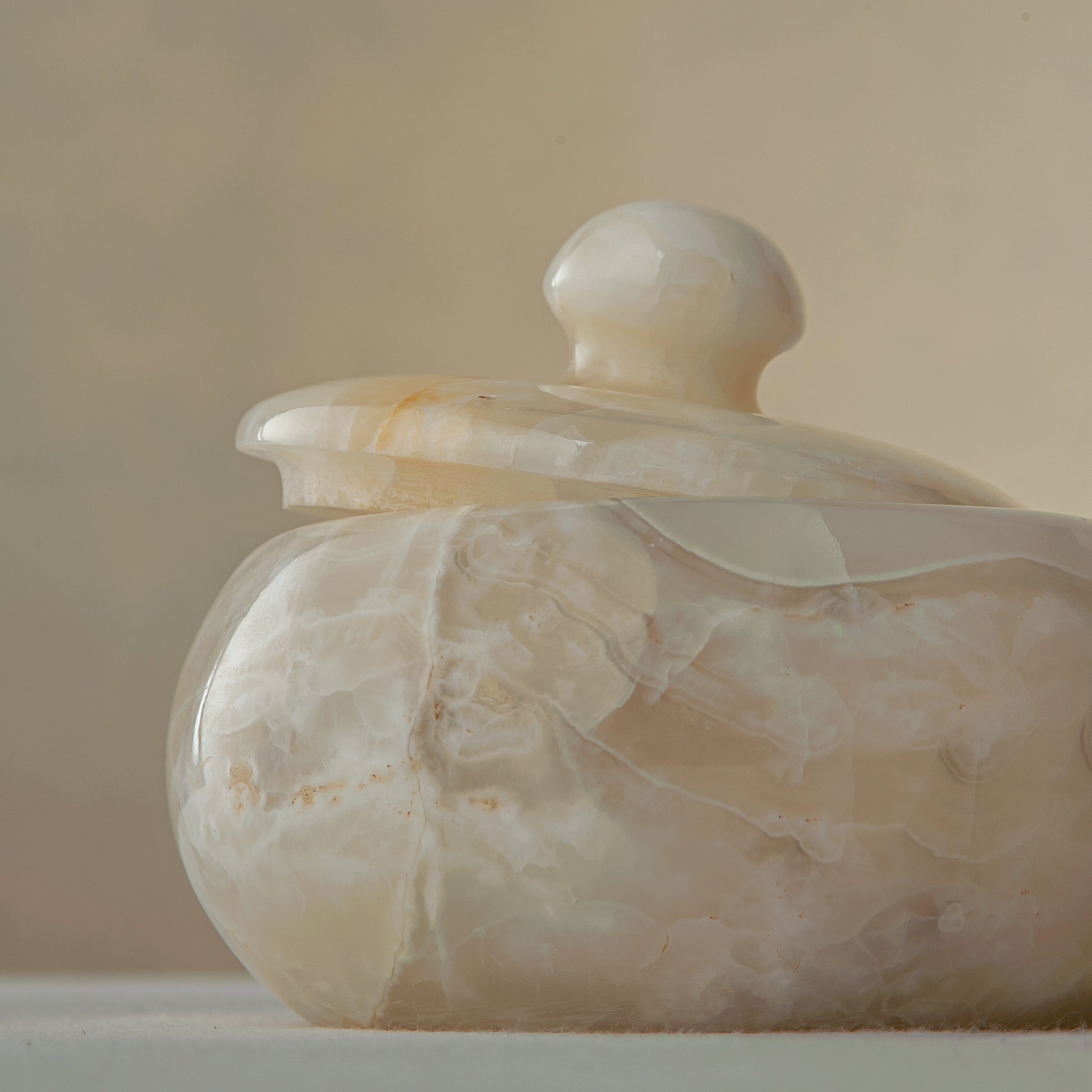 The Virexon Jar is crafted from a rare white onyx, distinguished by its soft, milky translucency and delicate natural veining. The stone’s calm tonal palette and gentle light permeability give the piece an exceptional lightness and a sense of timeless elegance.