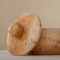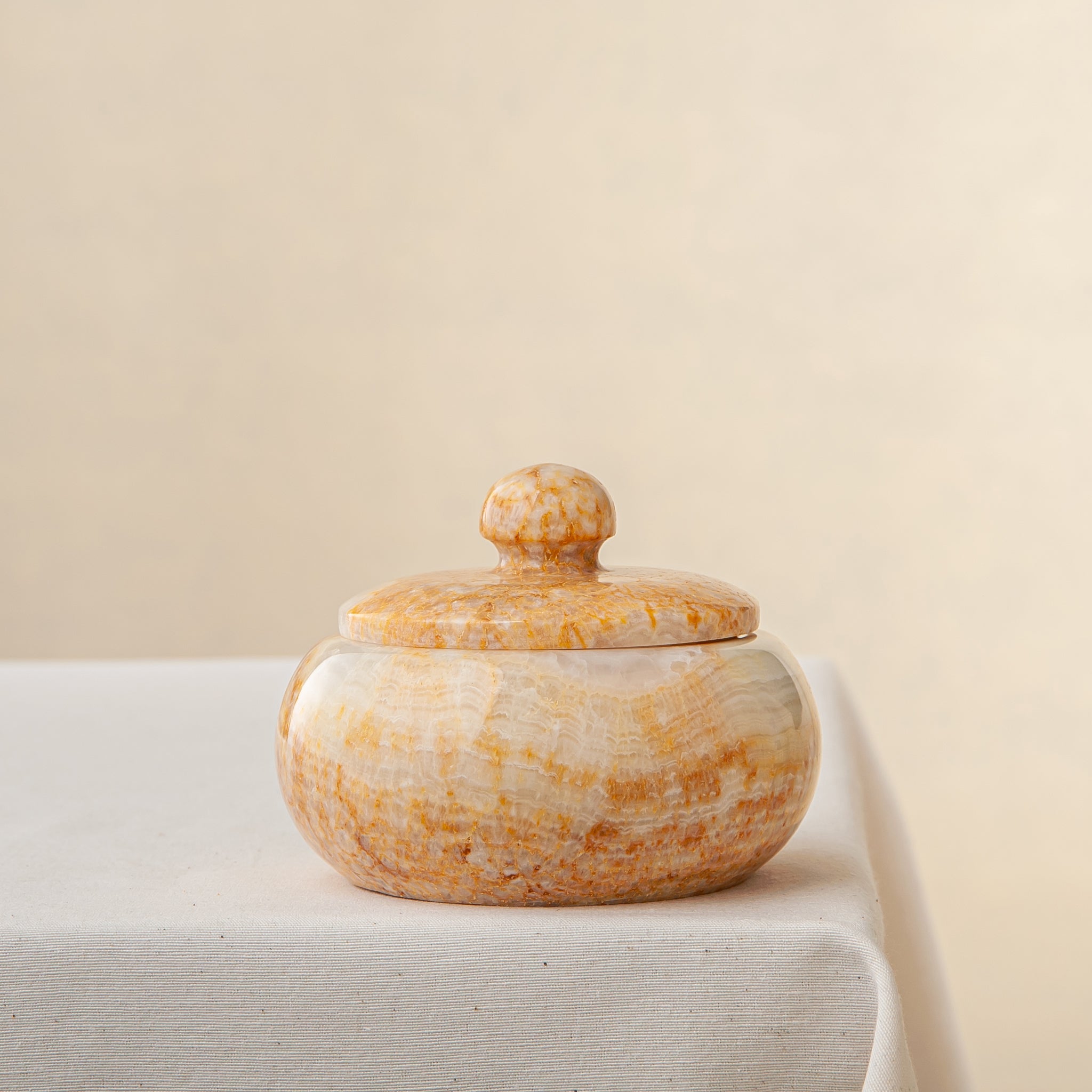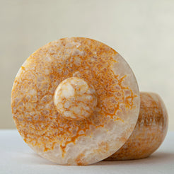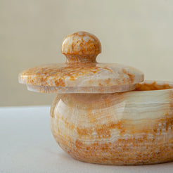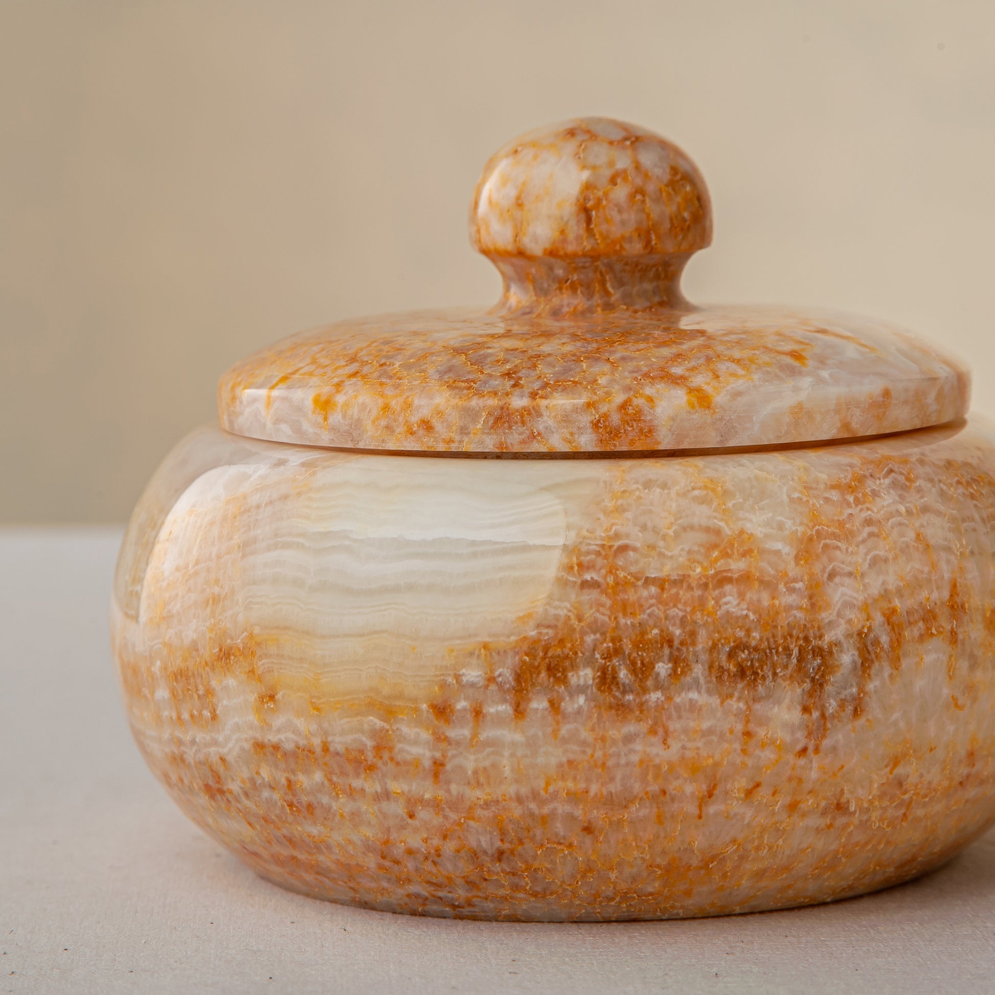 The Virexon Jar is a one of a kind object, handcrafted in our atelier from a rare natural stone. Its warm ivory base is crossed by soft honey and amber veining, revealing the organic depth and character of the material. Smoothly polished and gently rounded, the jar features a balanced, sculptural silhouette with a domed lid that rests naturally in the hand.